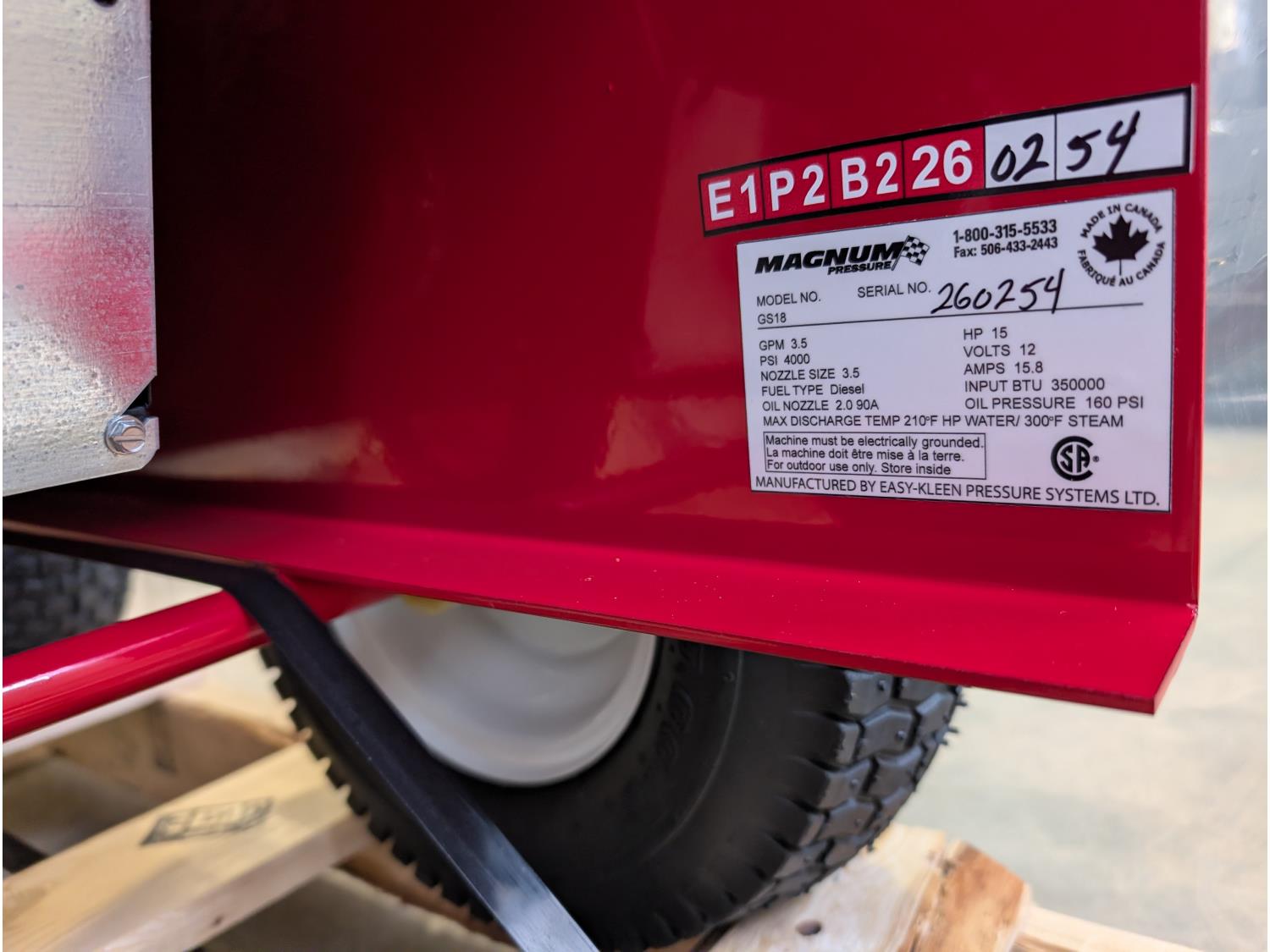 3.5 GPM at 4000 PSI, 15 HP, gasoline engine, electric start, 12 volt burner, oil/diesel fired burned/thermostat, schedule 80 coil with stainless steel housing, fully welded, powder coated frame, 10 gallon poly fuel tank, 30' hose and wand