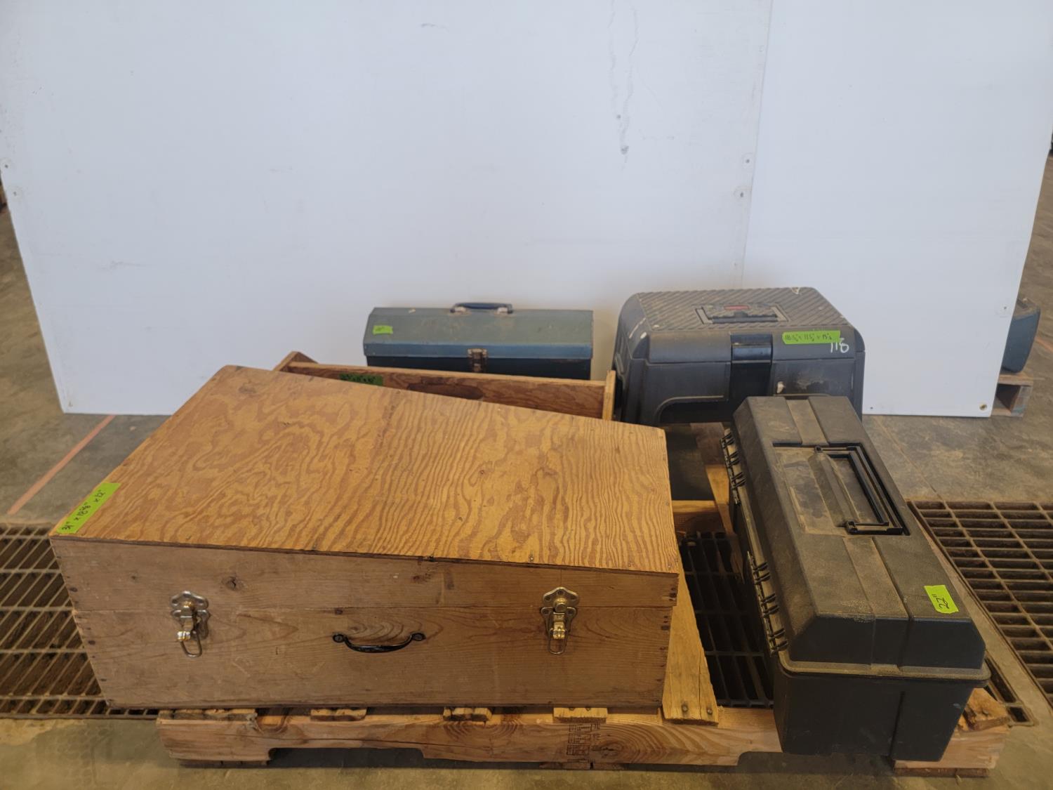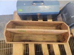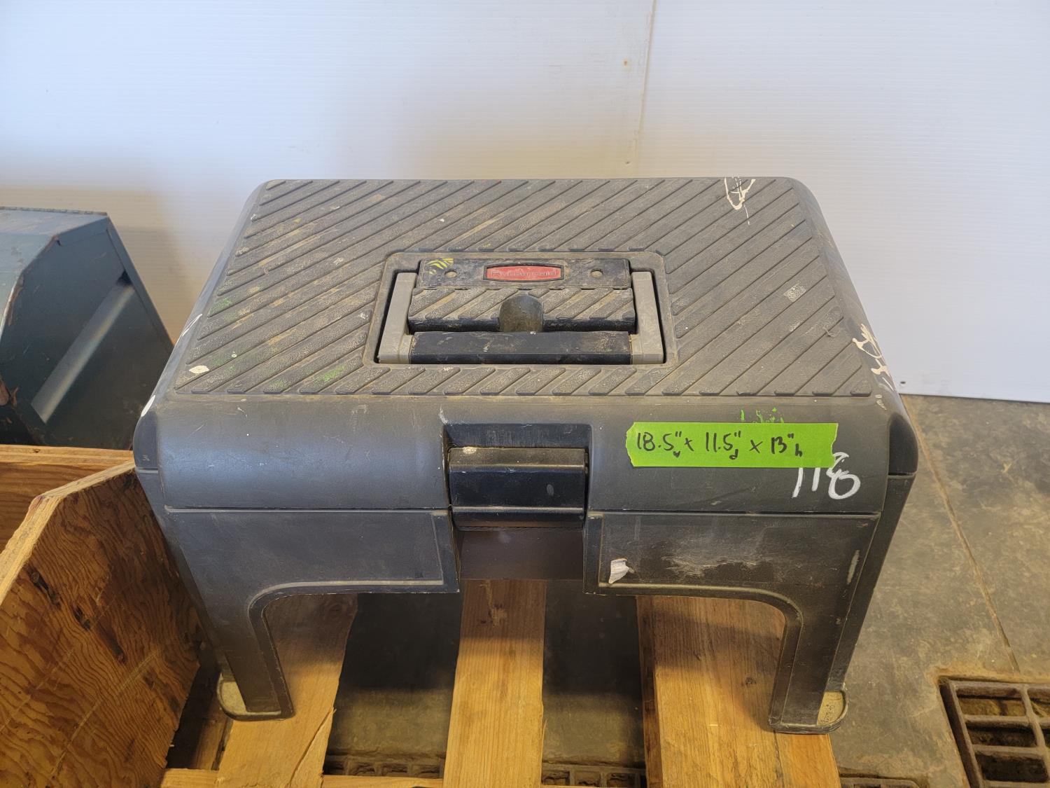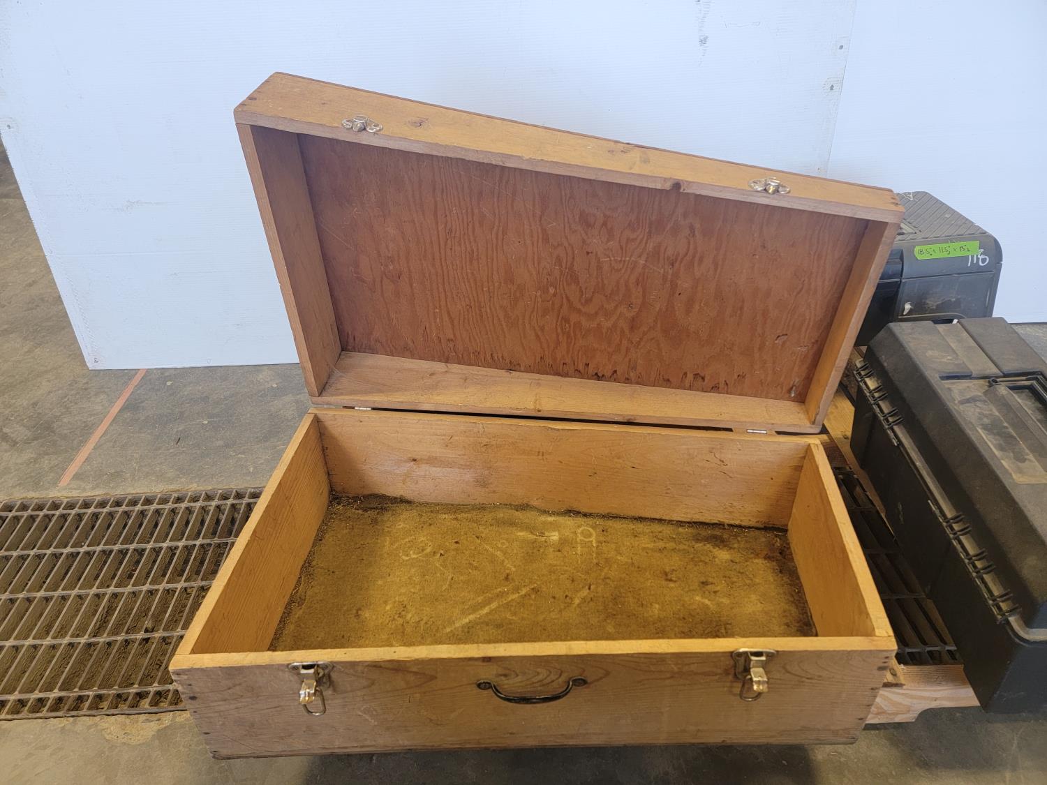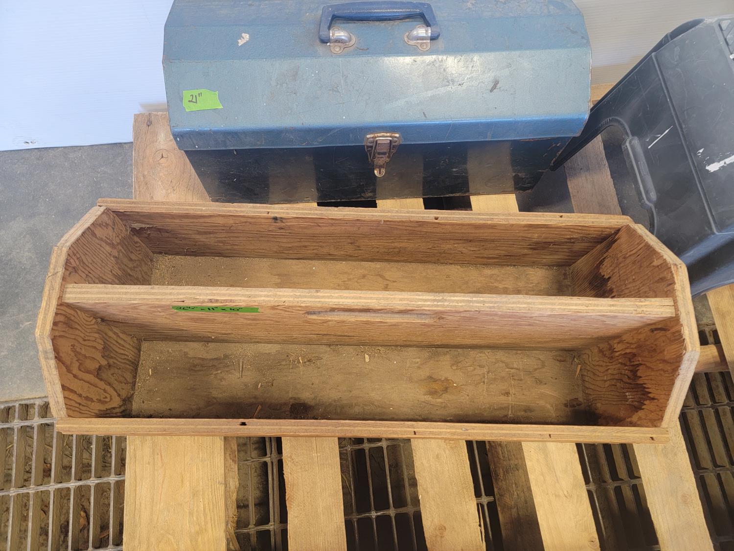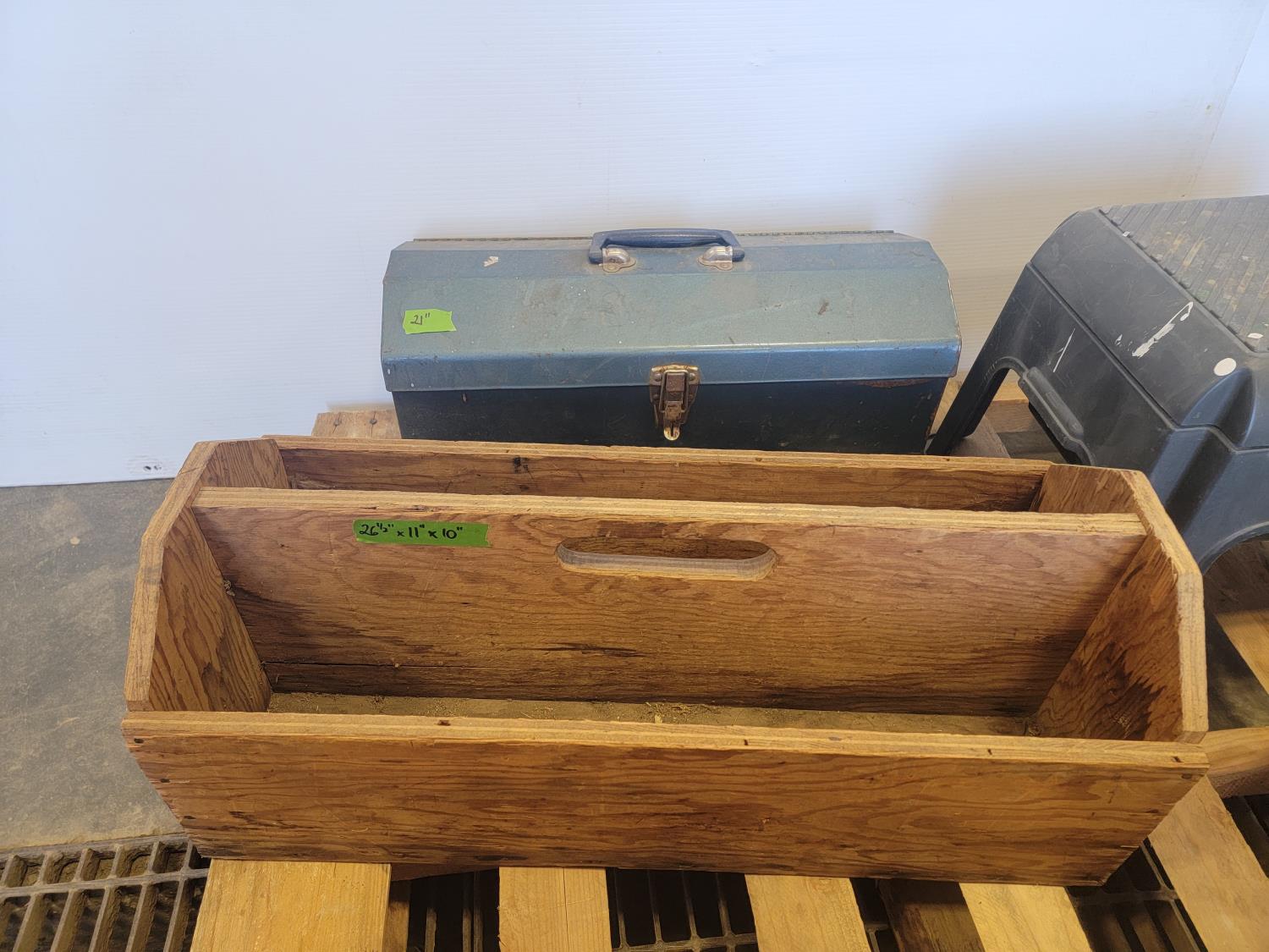 wooden chest 31 inch w x 18-5/8 inch d x 12 inch h, wooden tool box 26-1/2 inch w x 11 inch d x 10 inch h, 21 inch metal tool box, 22 inch plastic tool box, Rubbermaid storage stool 18-1/2 inch w x 11-1/2 inch d x 13 inch h