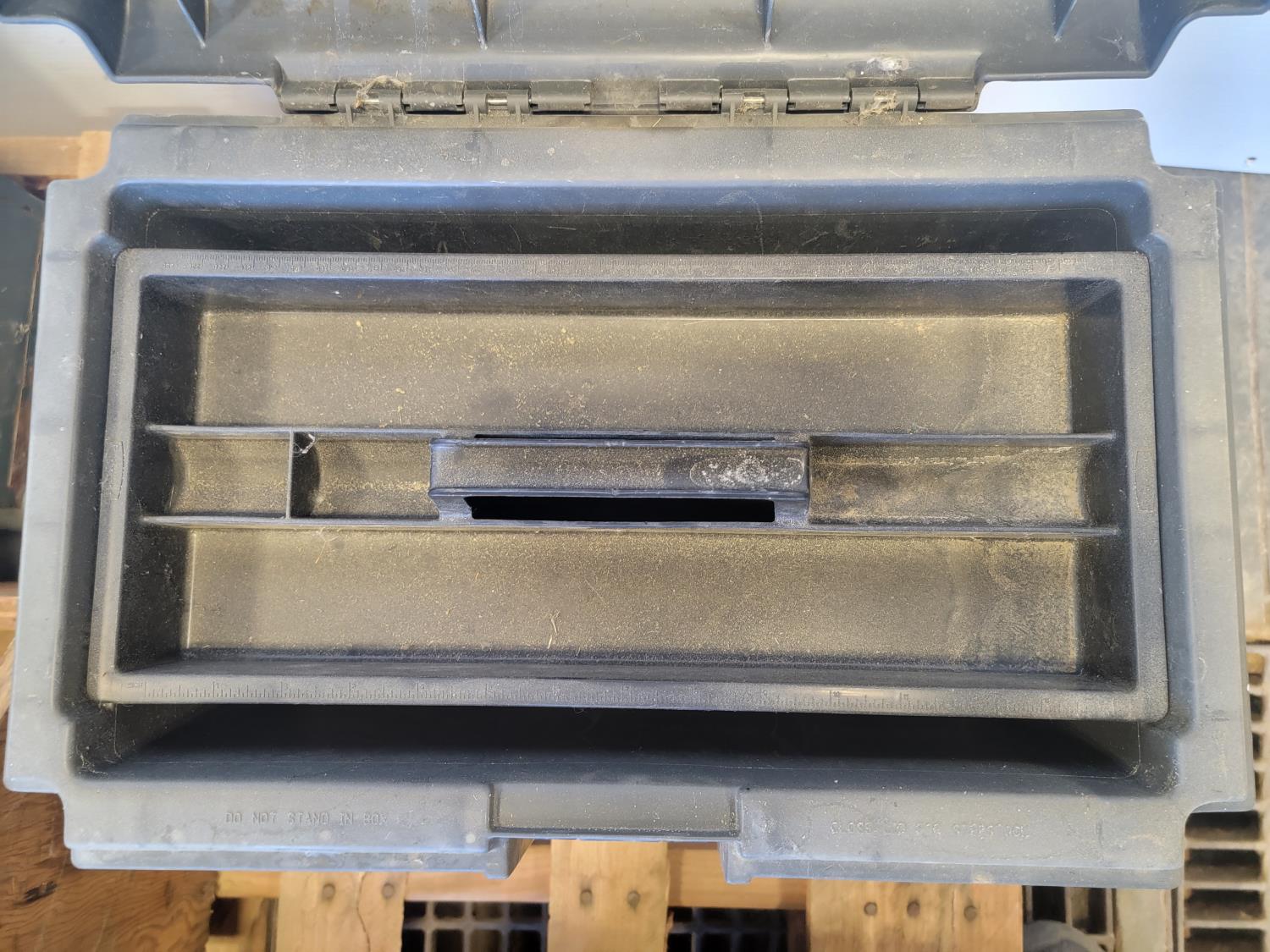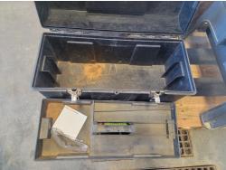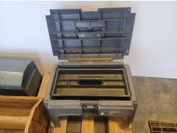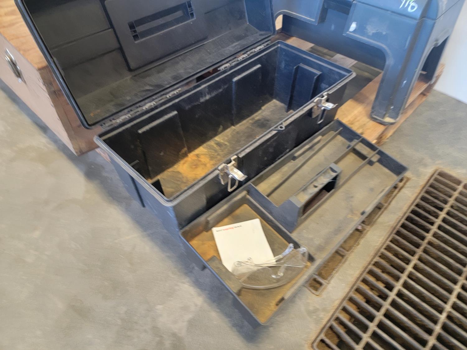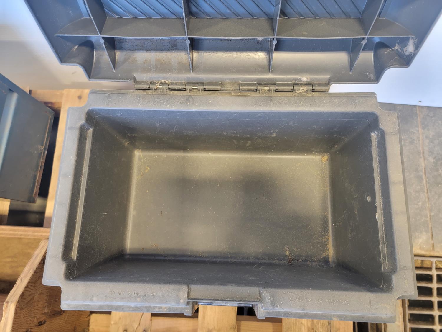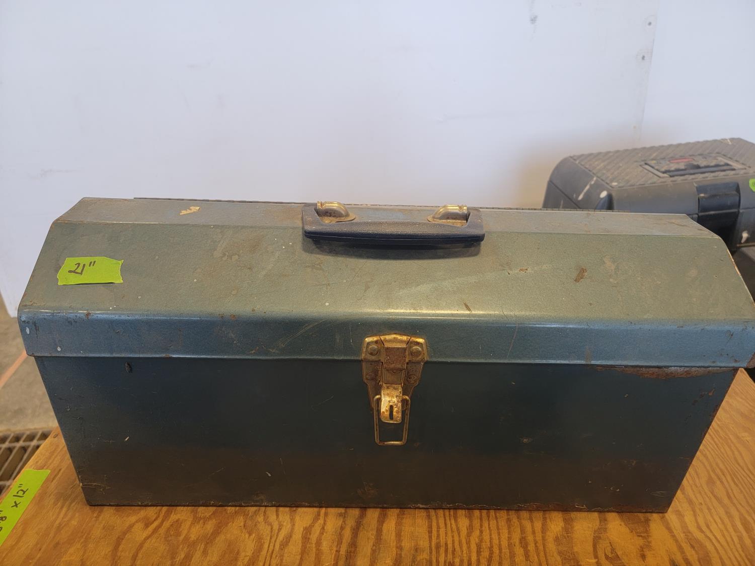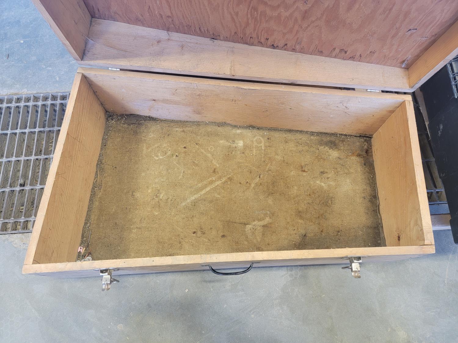 wooden chest 31 inch w x 18-5/8 inch d x 12 inch h, wooden tool box 26-1/2 inch w x 11 inch d x 10 inch h, 21 inch metal tool box, 22 inch plastic tool box, Rubbermaid storage stool 18-1/2 inch w x 11-1/2 inch d x 13 inch h