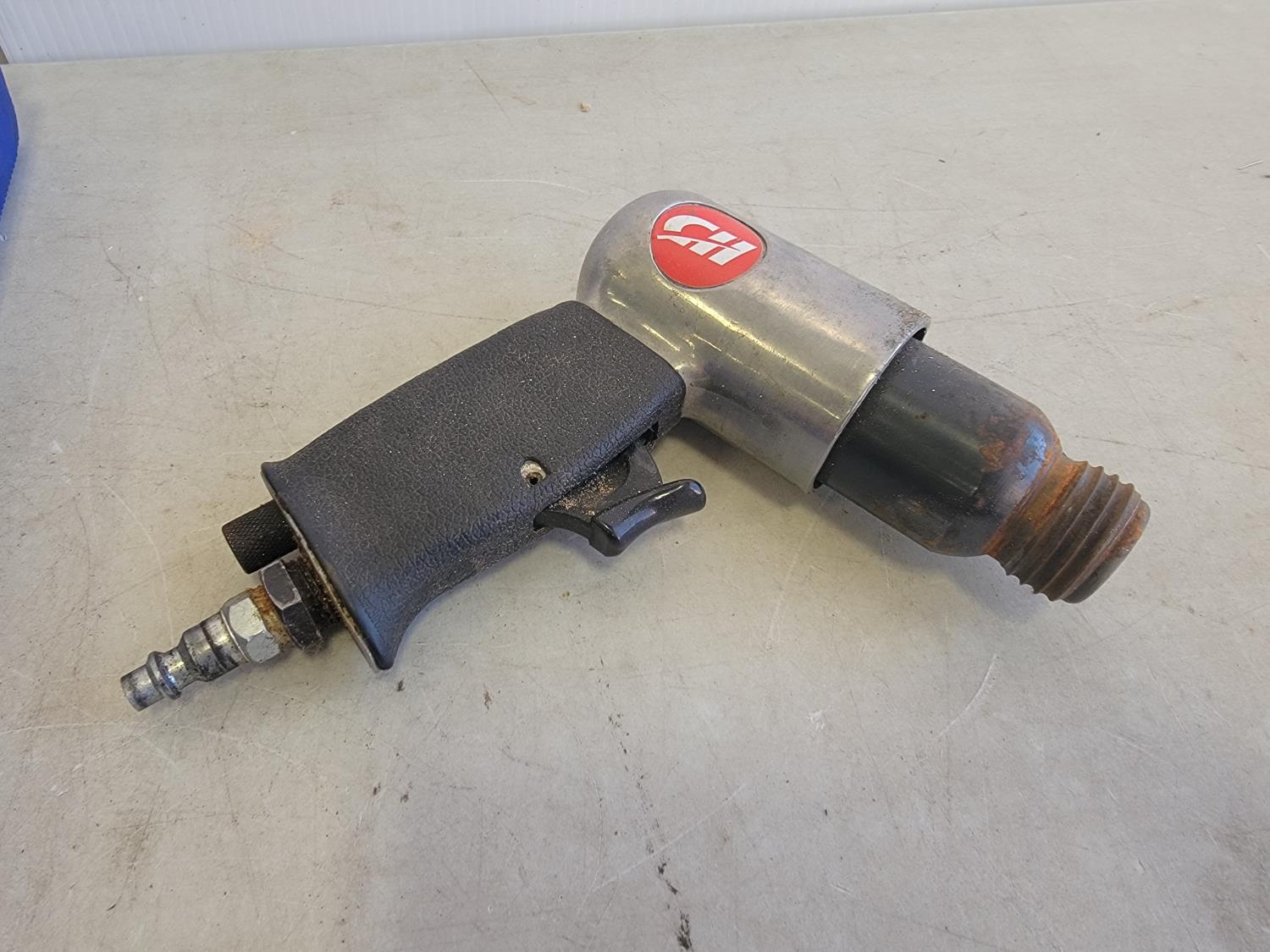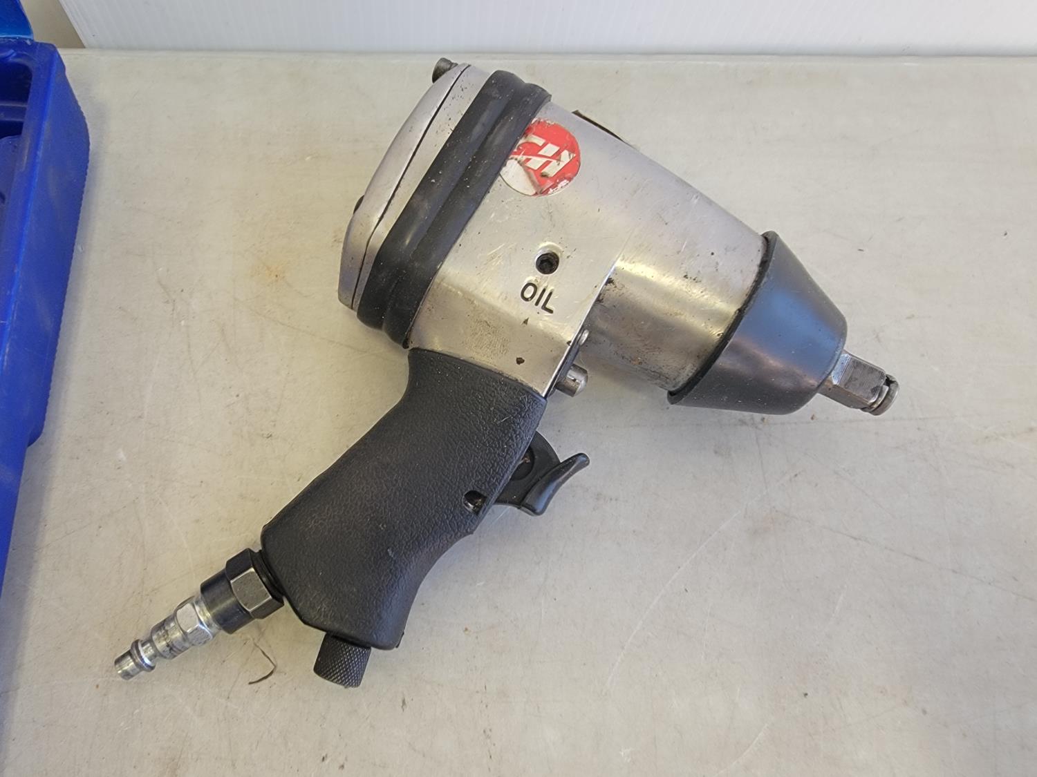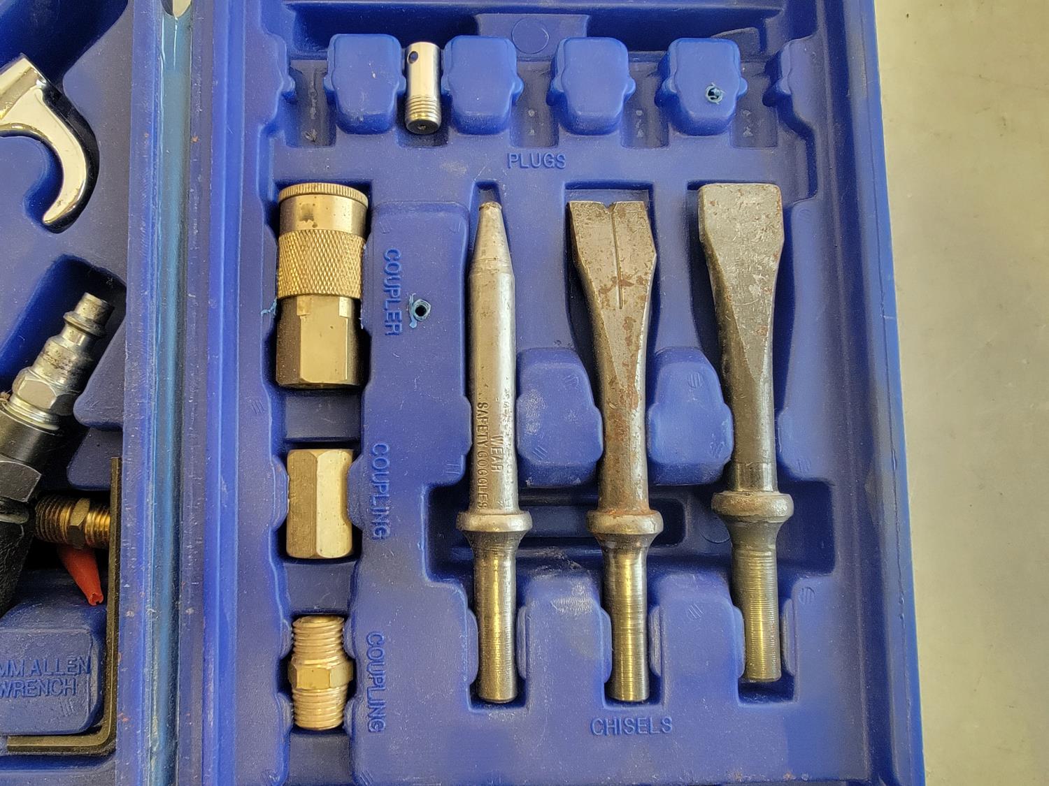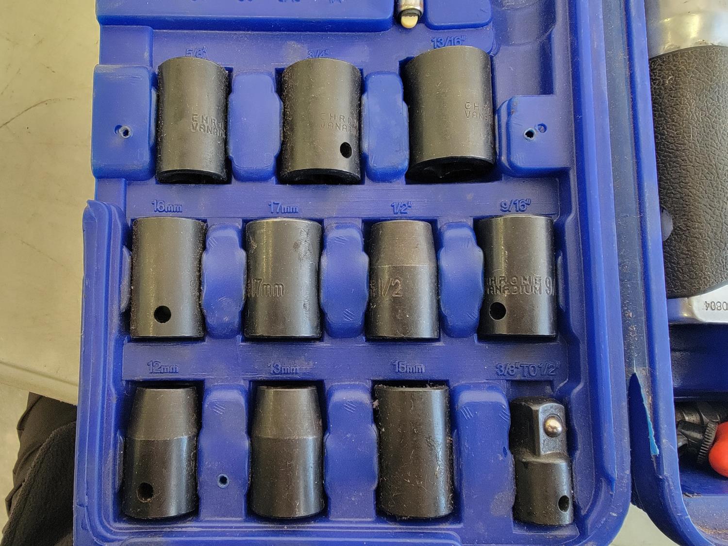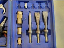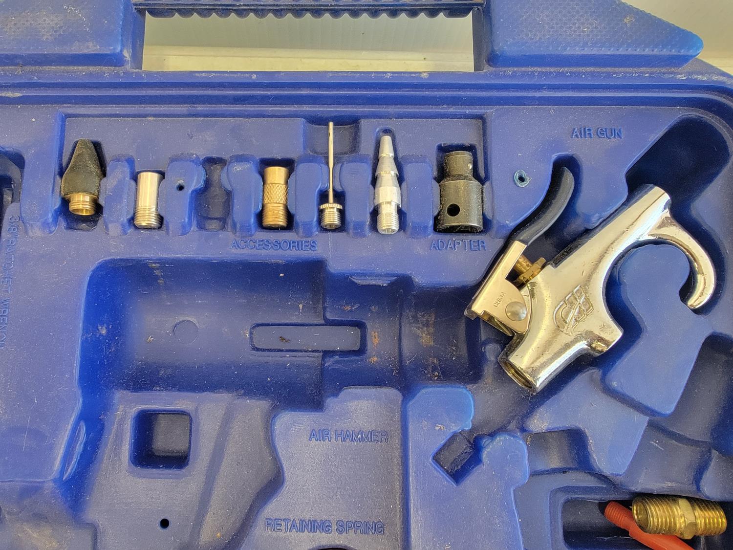 3/8 inch ratchet wrench, air hammer, 1/2 inch impact wrench, tire gauge, chisels