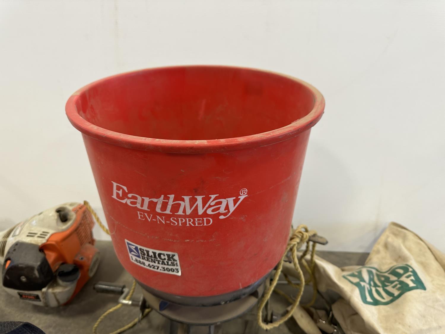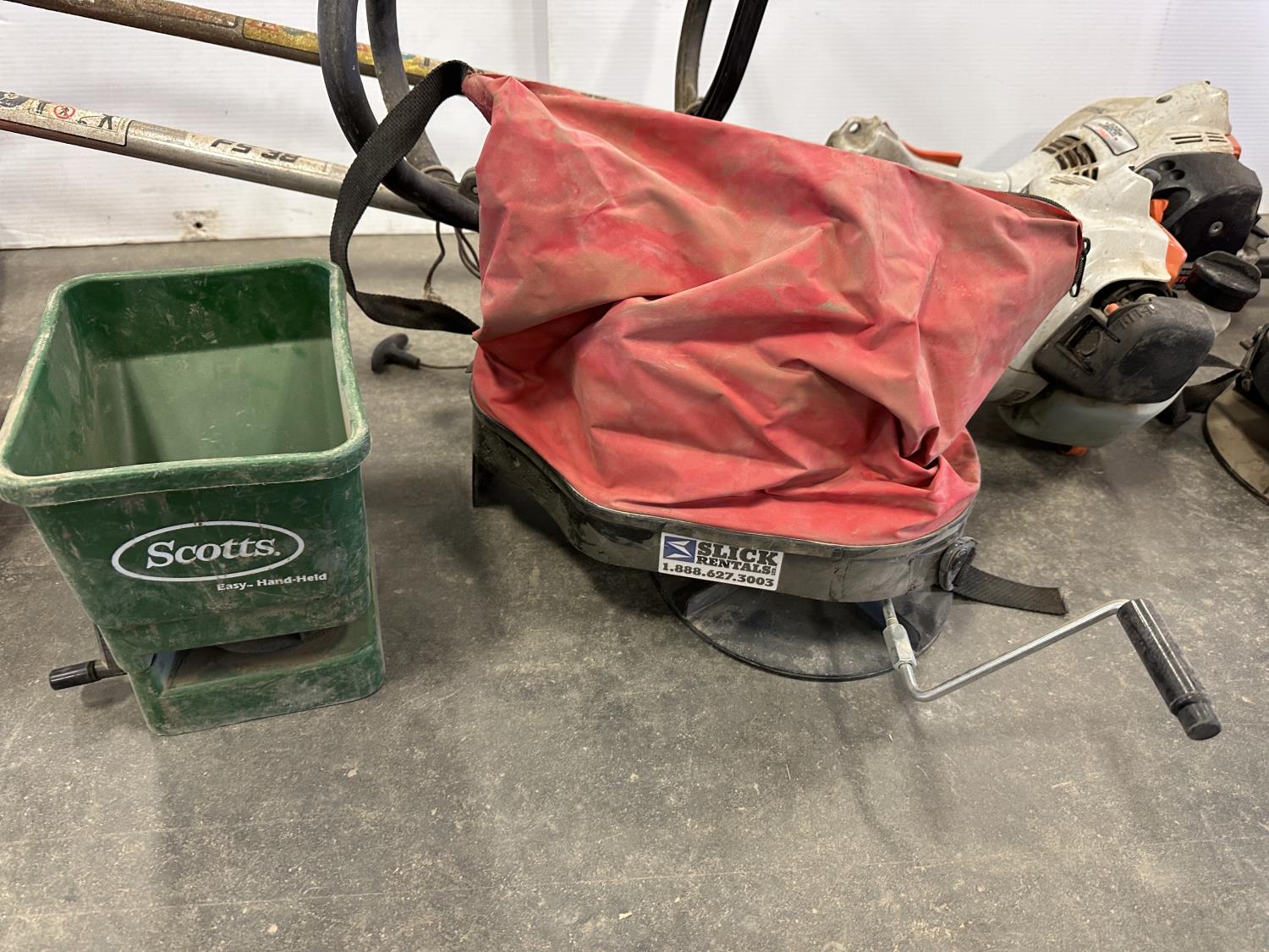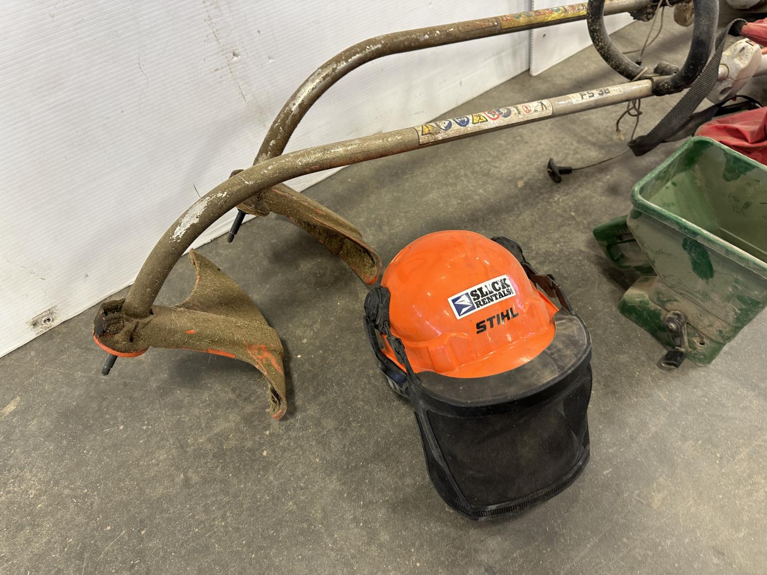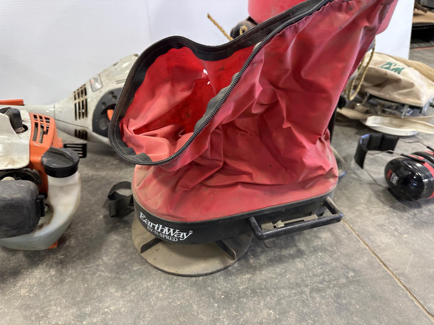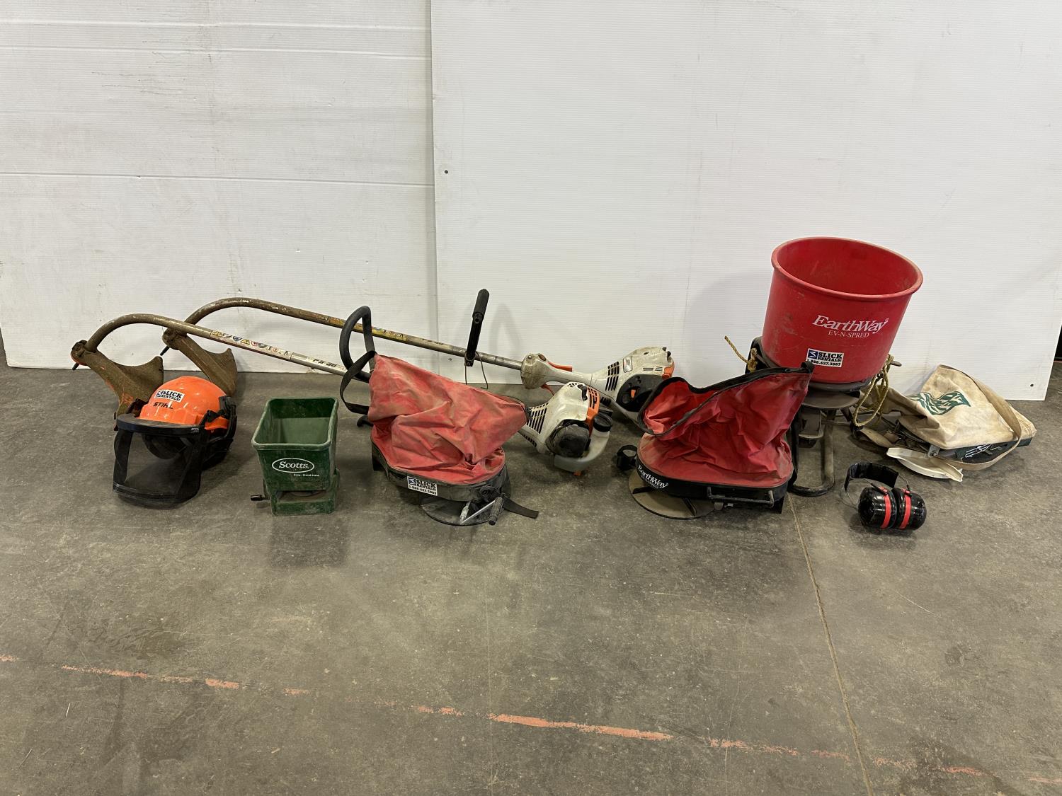 5280 Face Shield, Ear Muffs, (5) Broadcast Spreaders, (2) Stihl FS-38 Trimmers