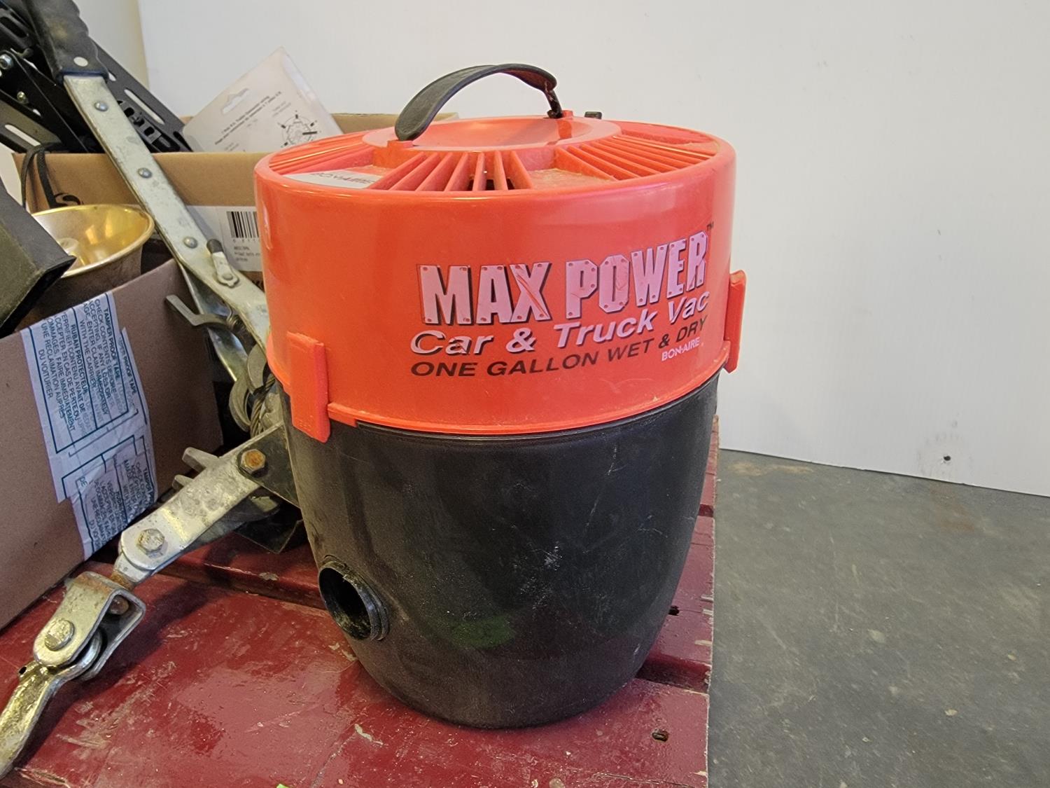 Max Power one gallon wet/dry vacuum, infrared sensor security light, Craftsman 20L shop vacuum, auto air cleaner, Spot Connect, (3) hitch balls, trailer connector, cable puller, cross wrench
