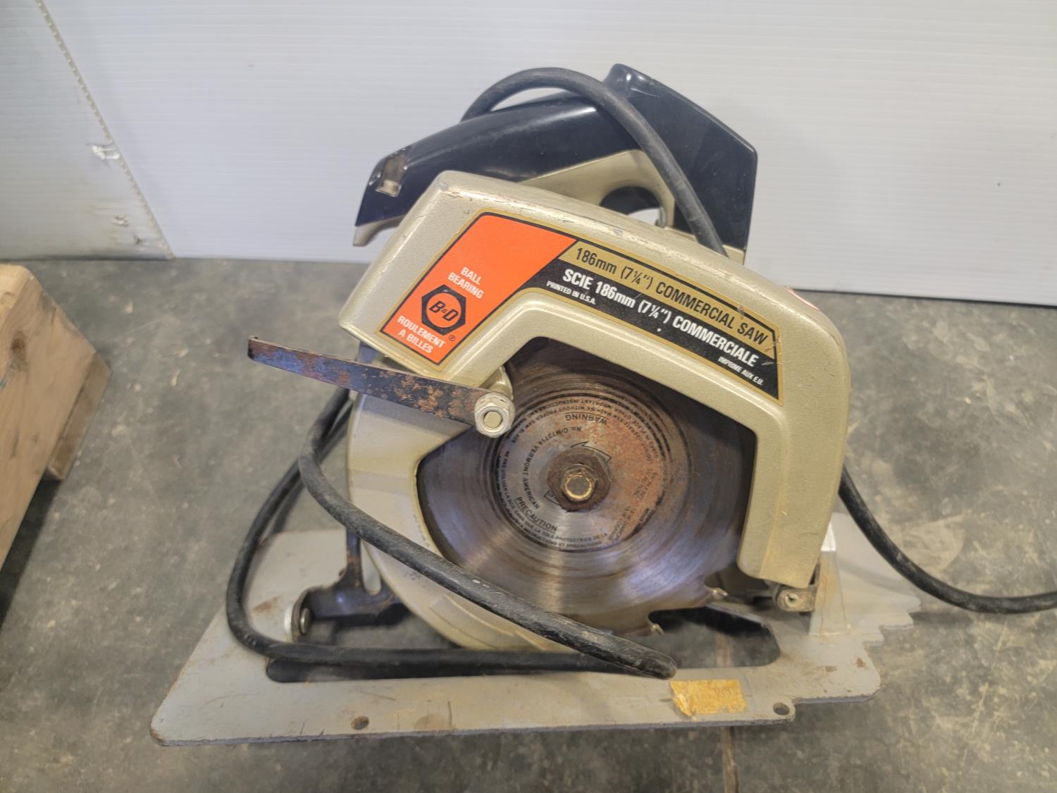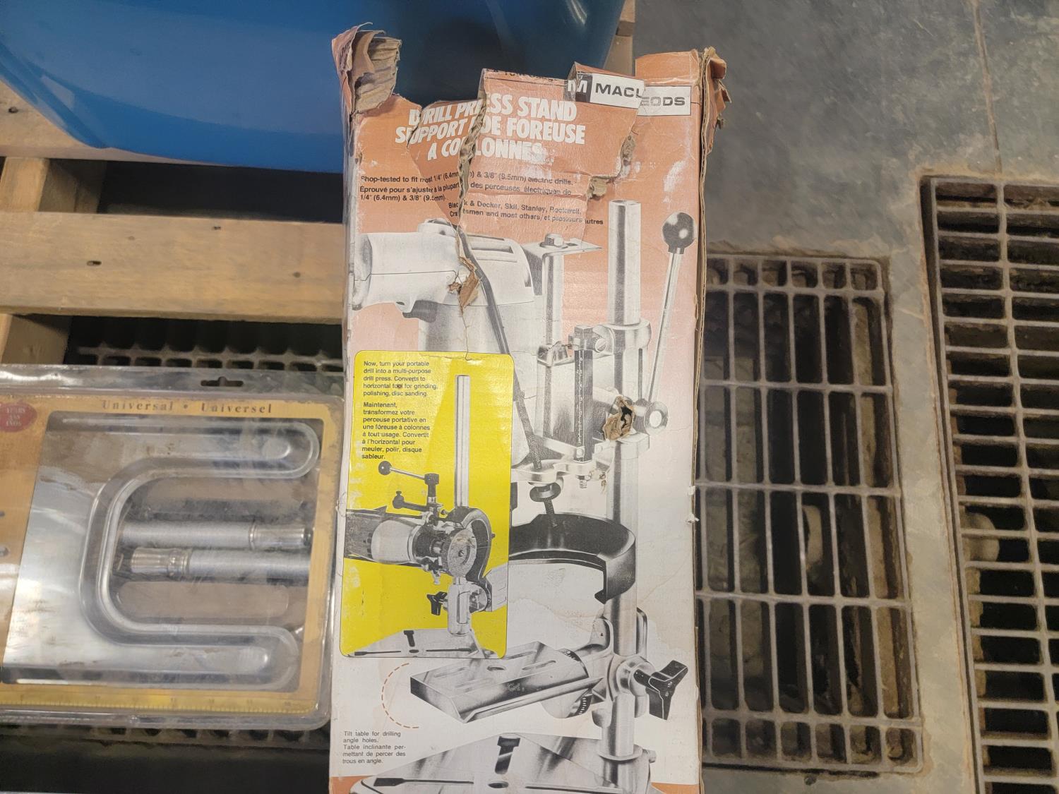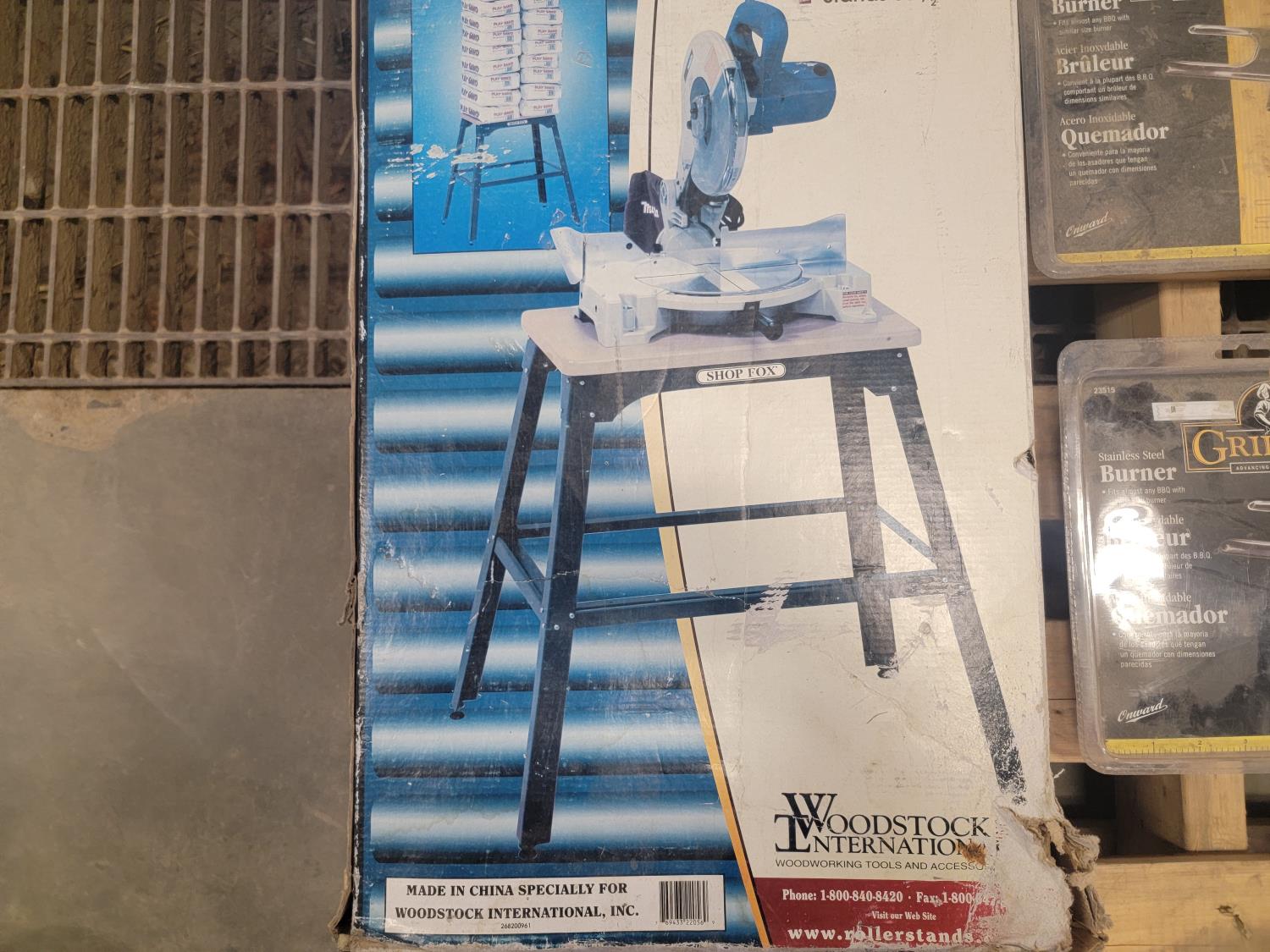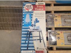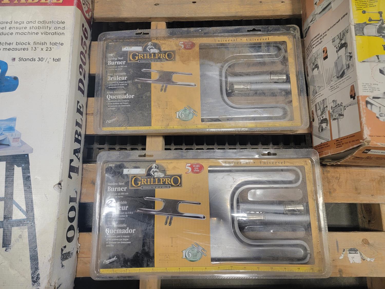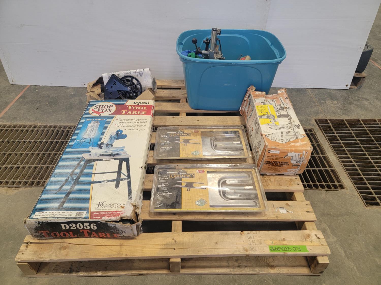 (2) stainless steel BBQ burners, Shop Fox tool table, (2) drill press stands, Black & Decker 7-1/4 inch circular saw