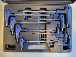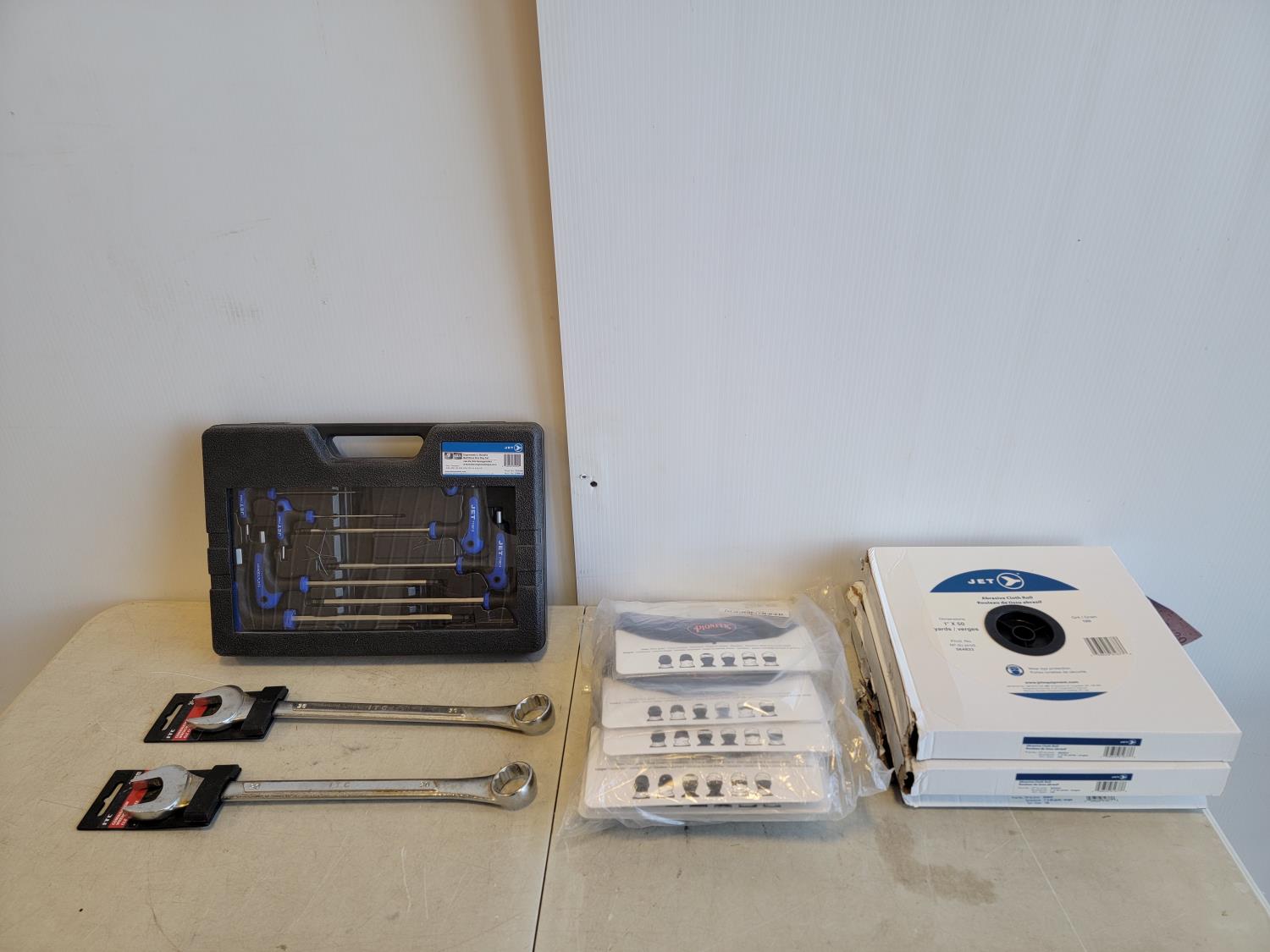 (3) 1 inch x 50 yard abrasive cloth rolls, (11) neck gaiters, (2) 30 mm combination wrenches, L-handle ball nose hex key set