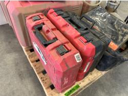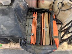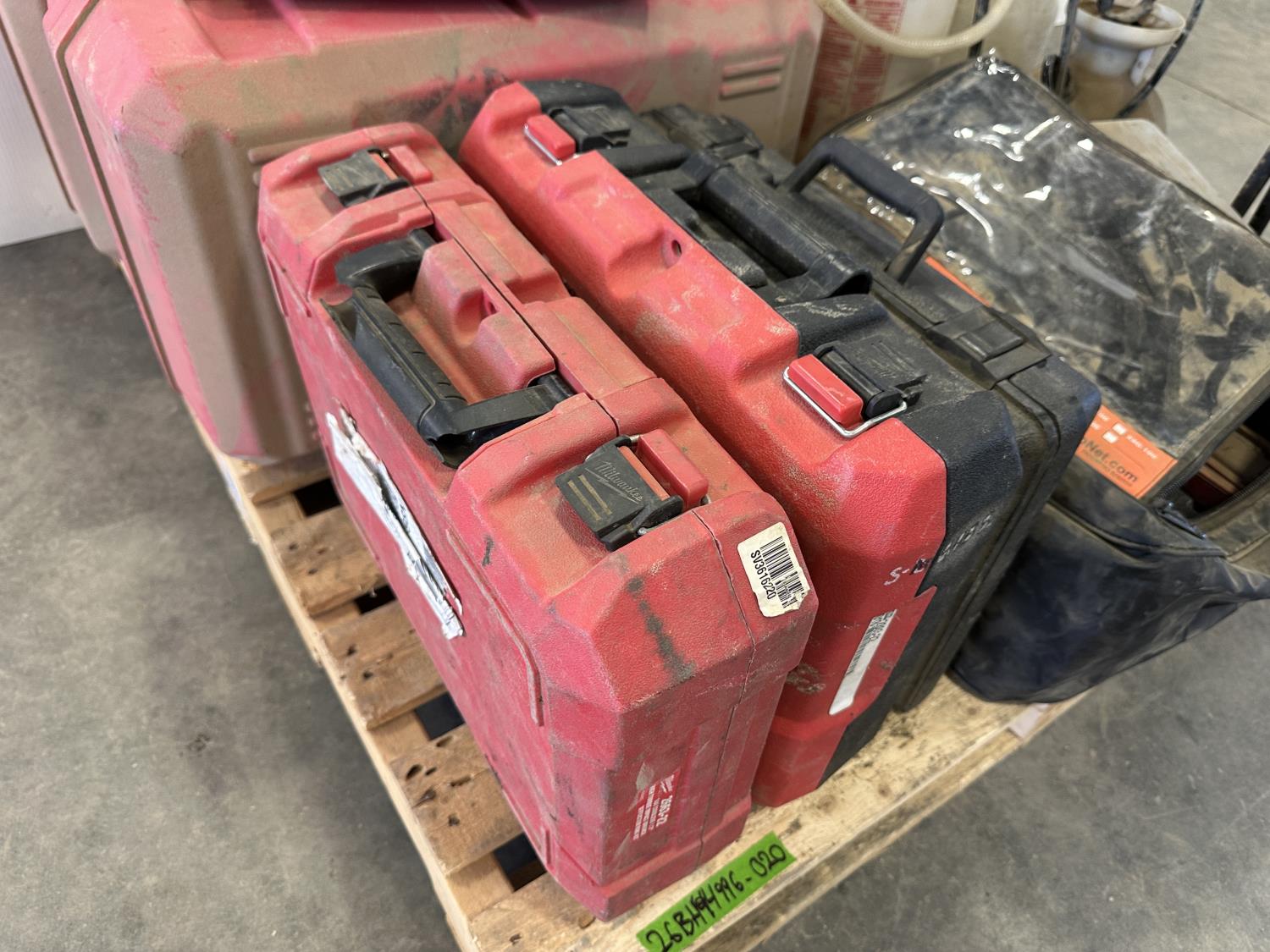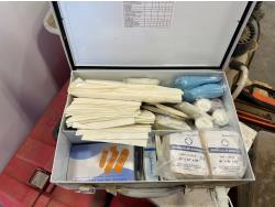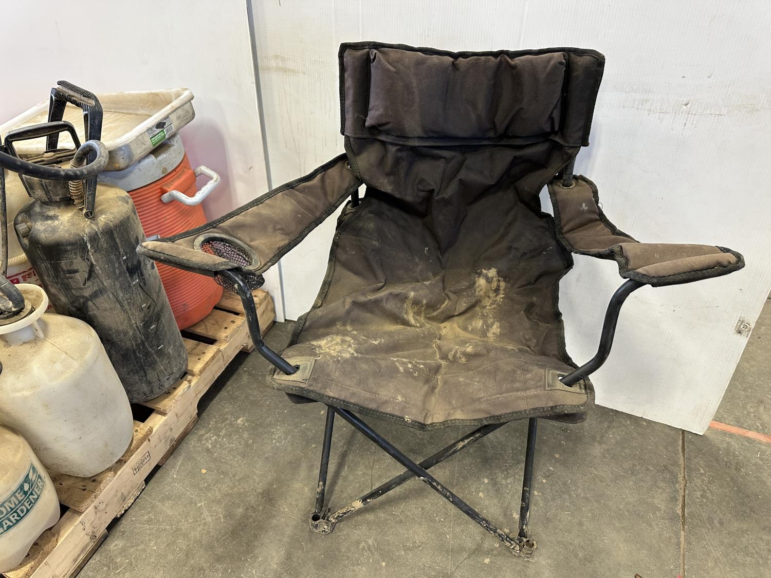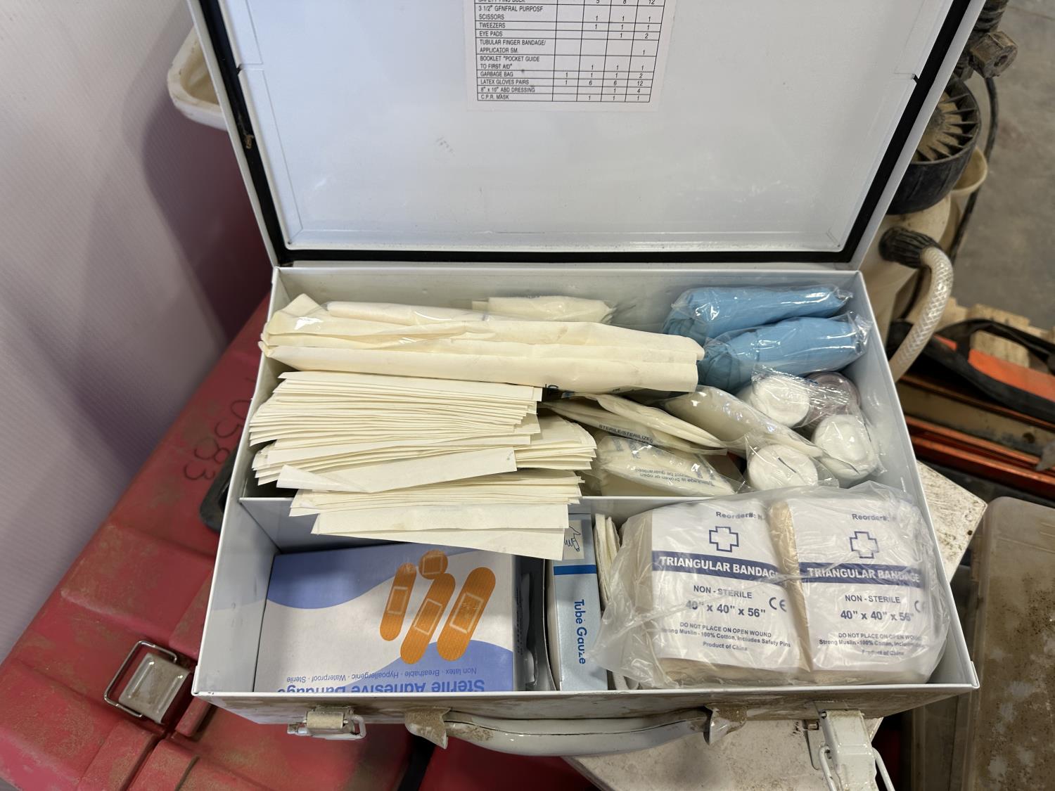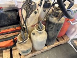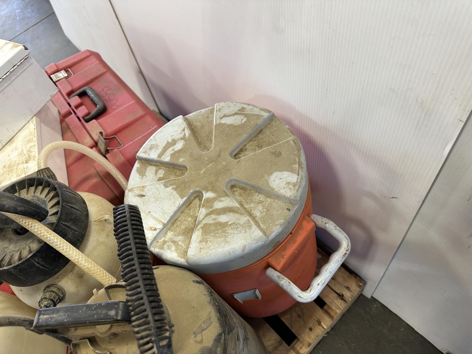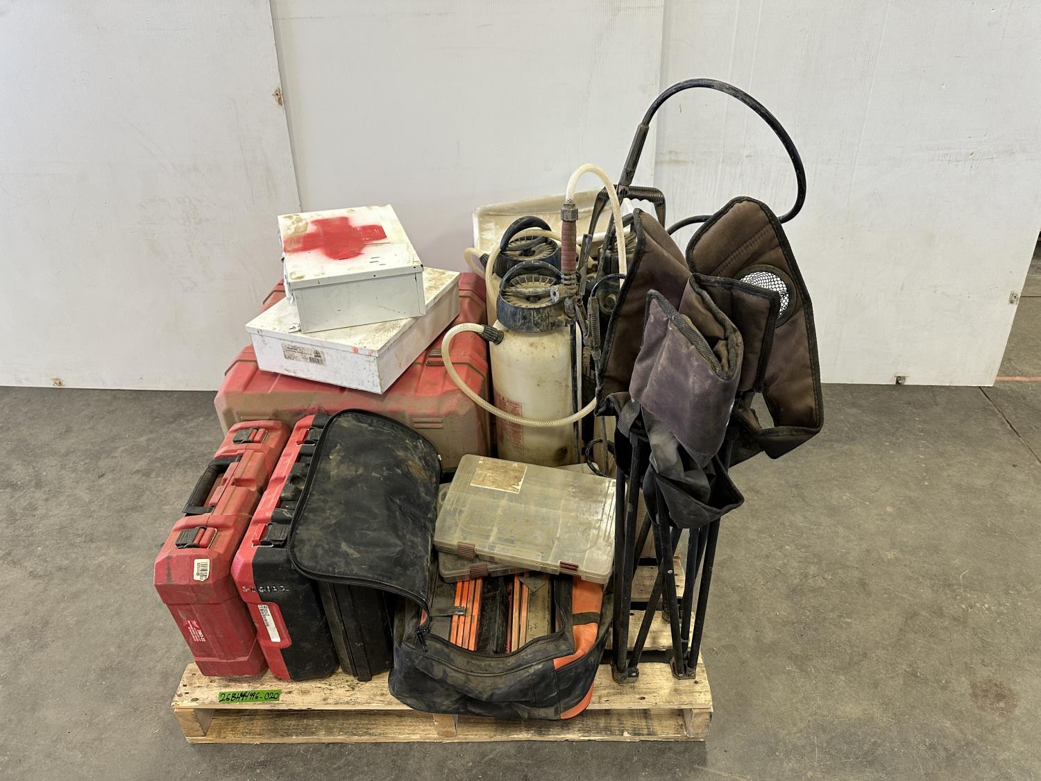 (5) empty tool cases, (5) pressure sprayers, used triangle road flares, cooler, (2) first aid kits, chair