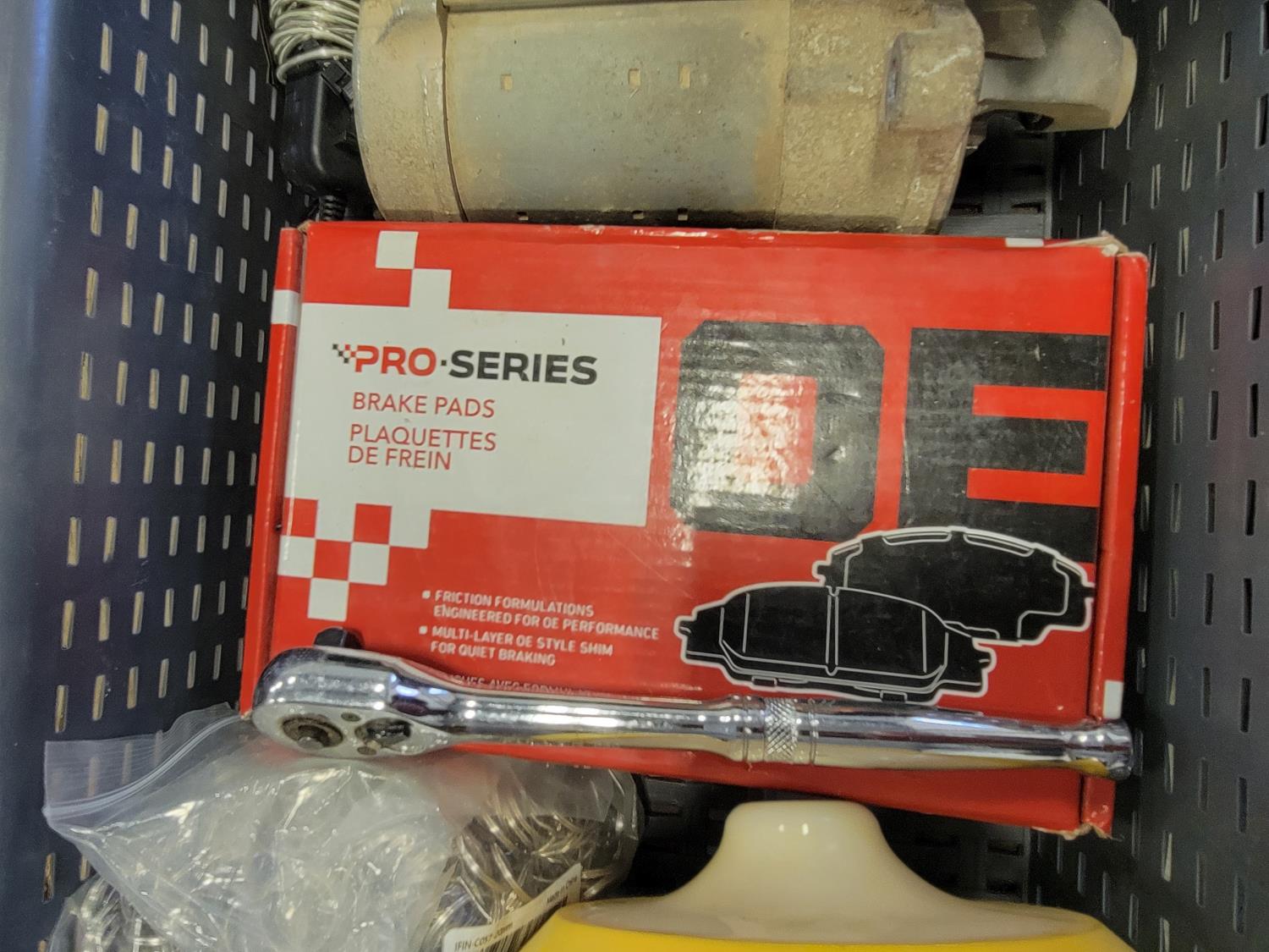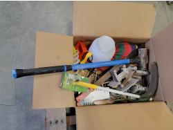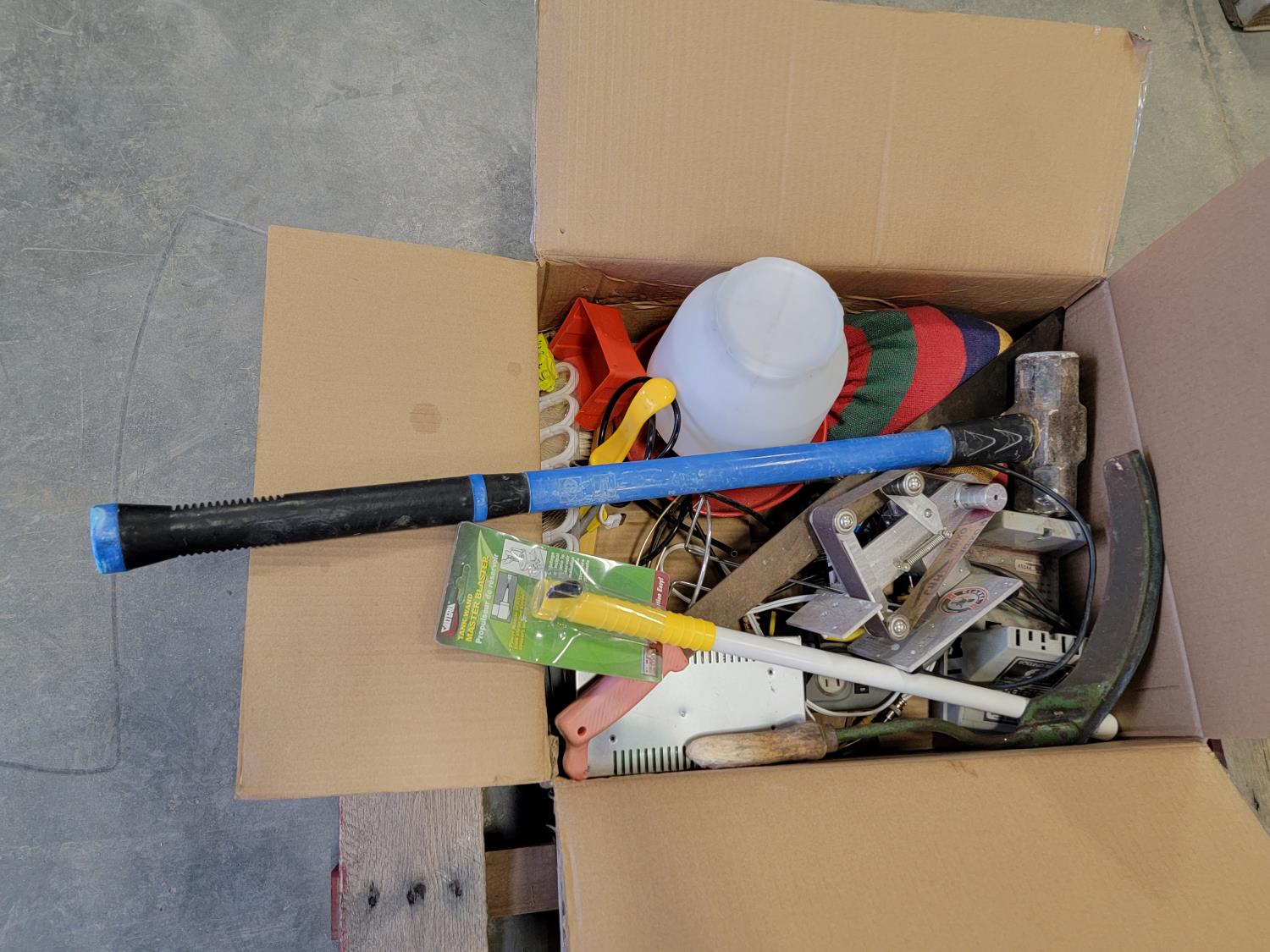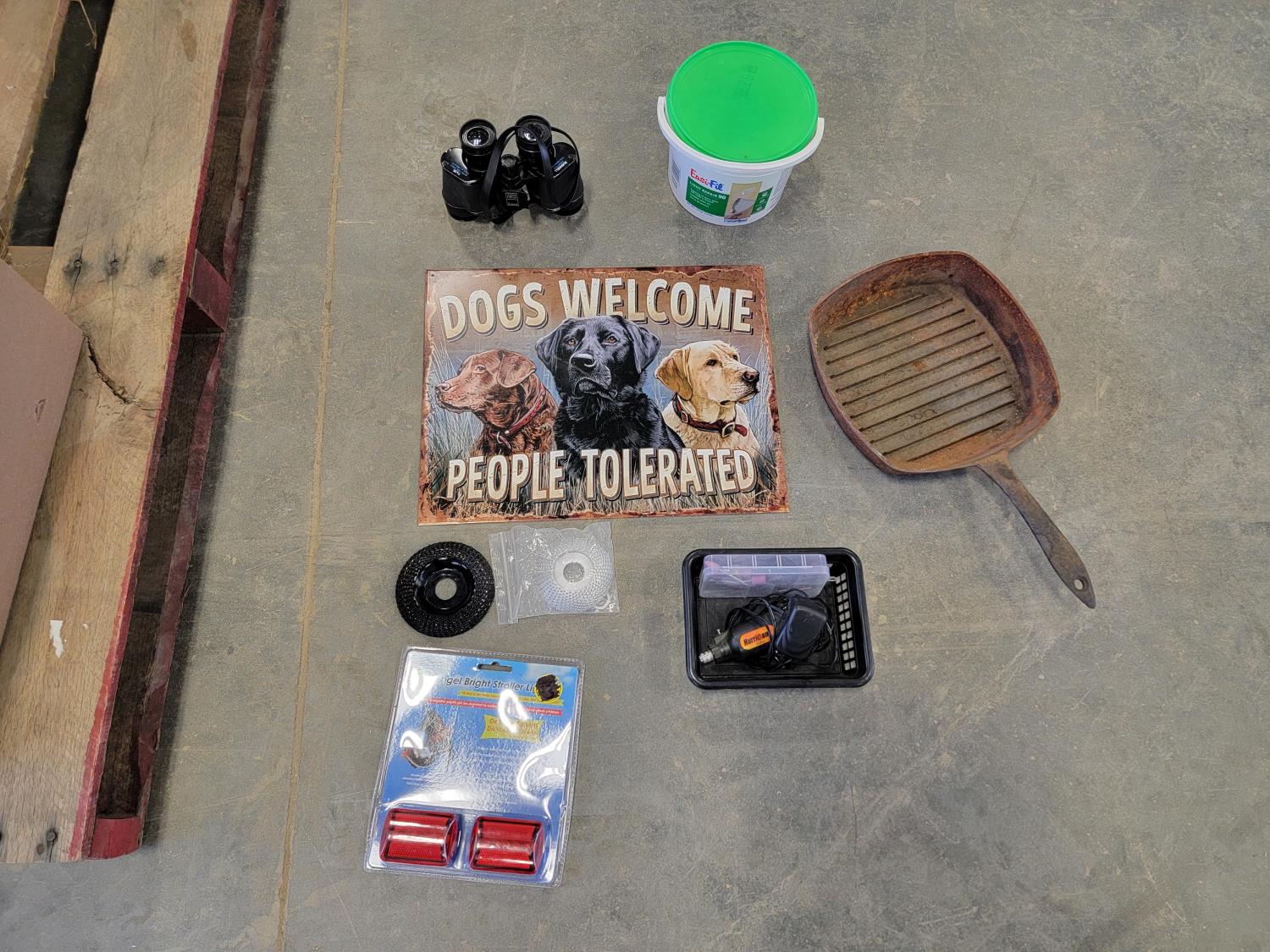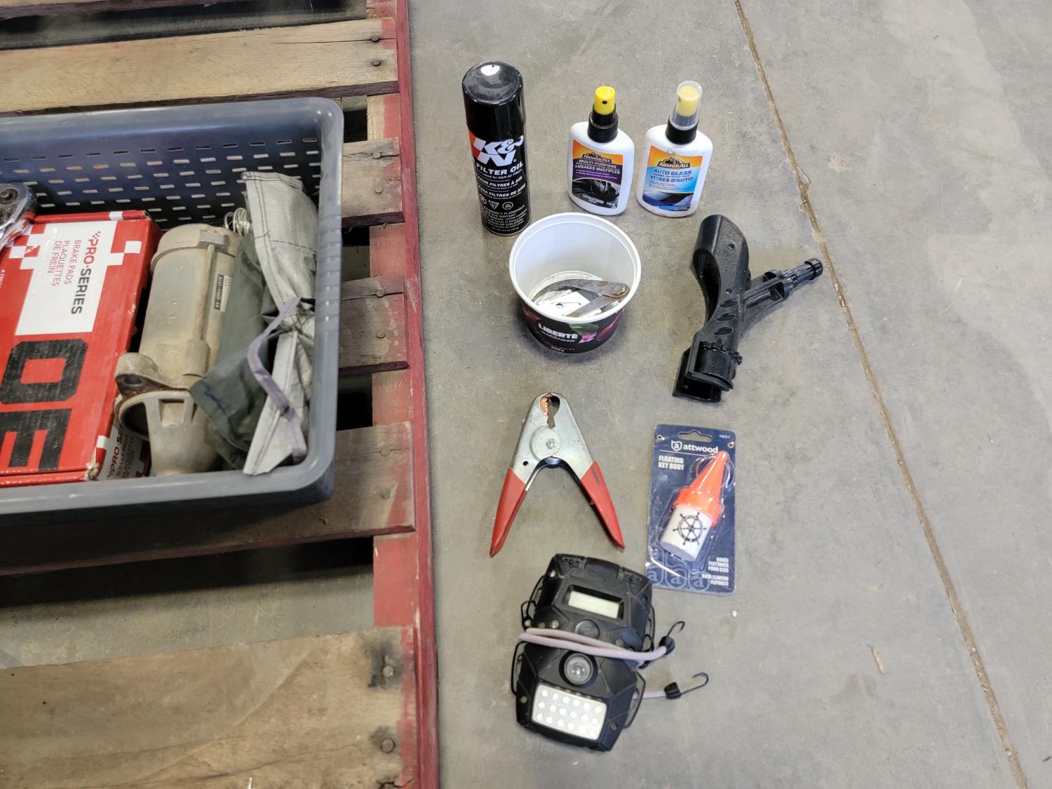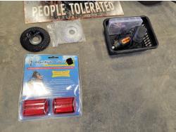 brake pads for Ford F150, rotary tool with bits, sledge hammer, tank wand, machete, belt sander, scythe