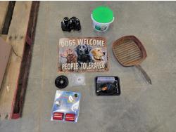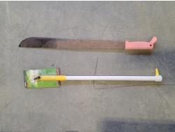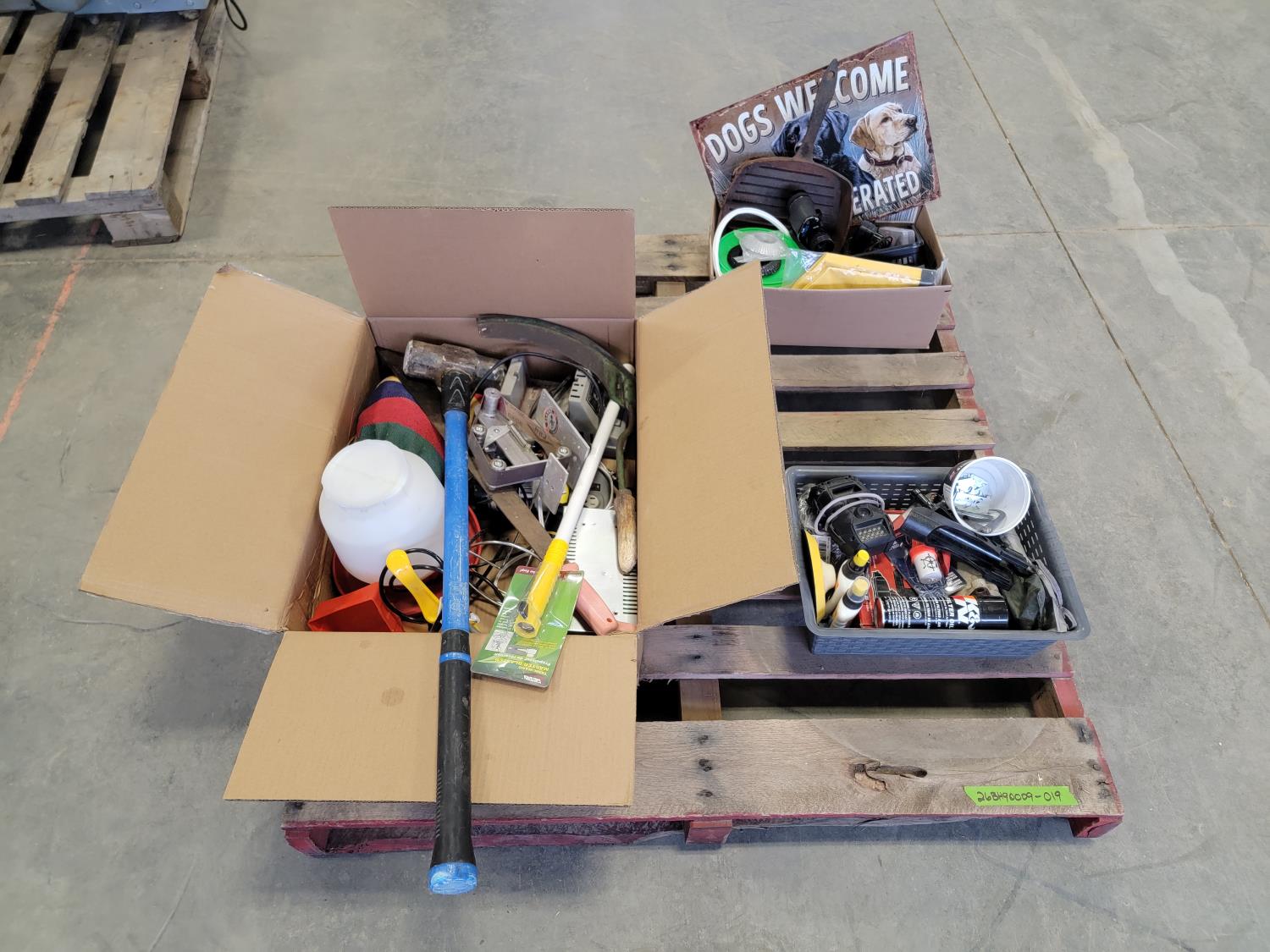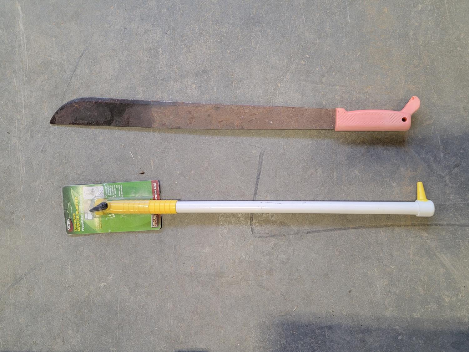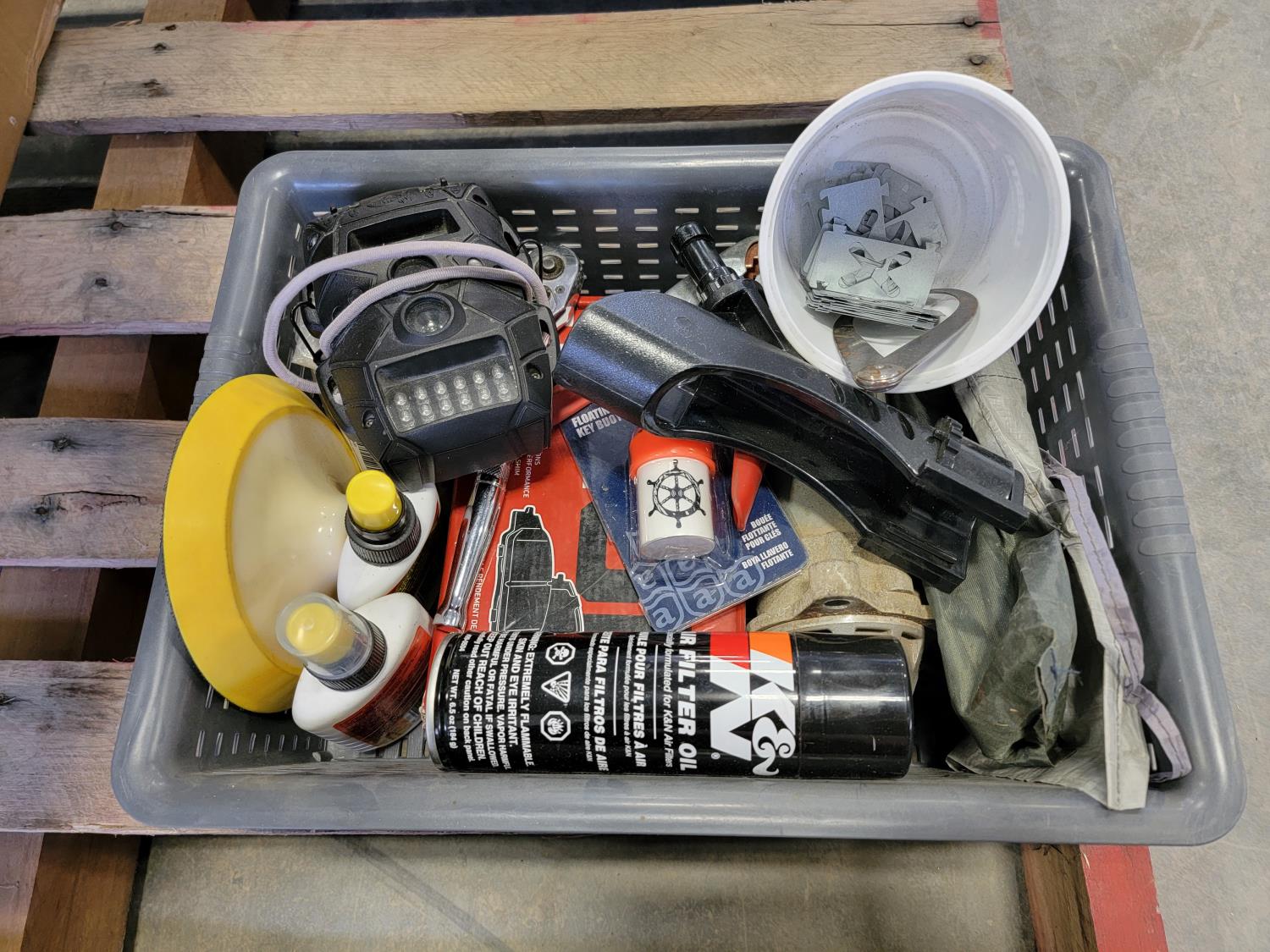 brake pads for Ford F150, rotary tool with bits, sledge hammer, tank wand, machete, belt sander, scythe