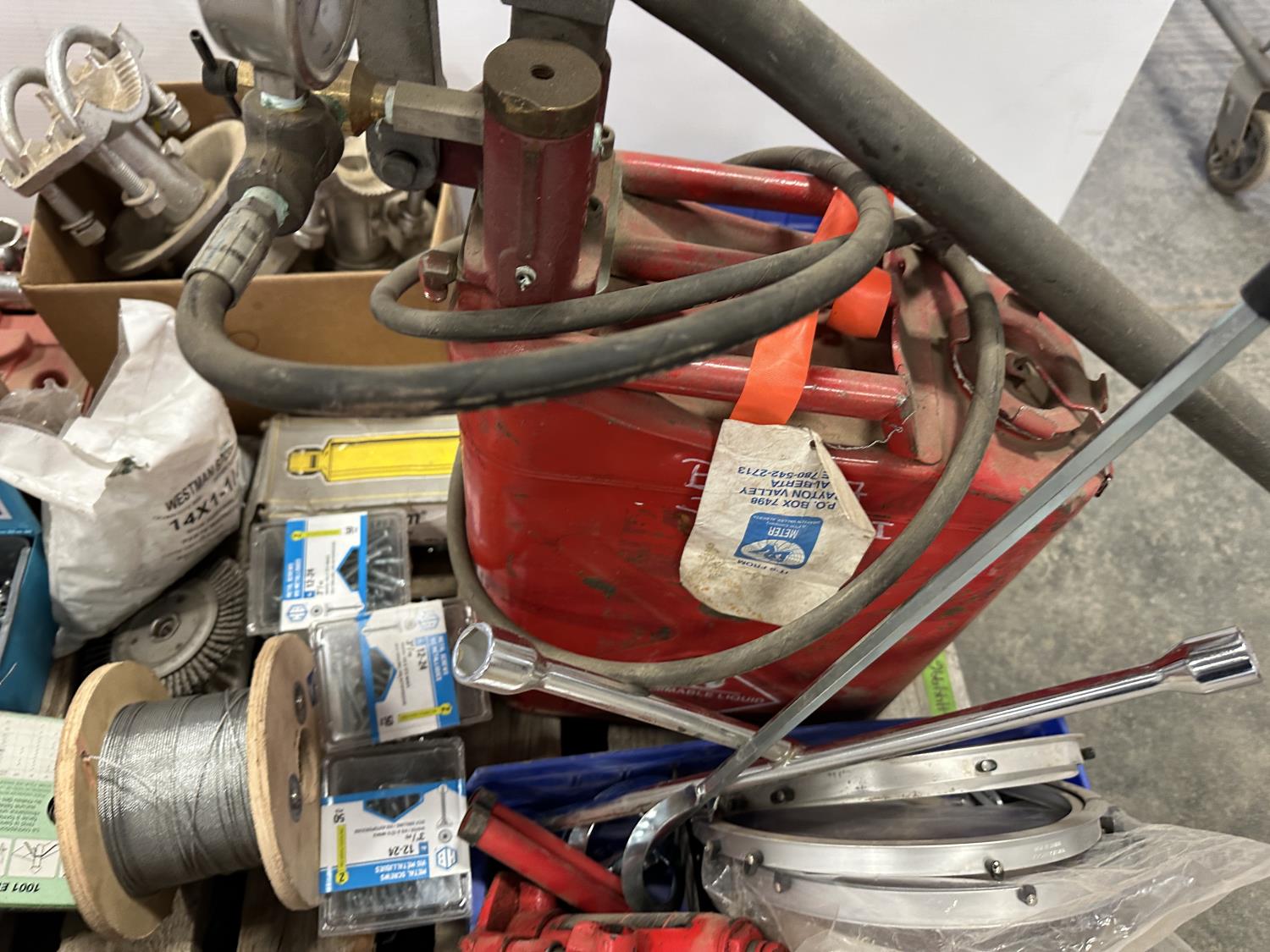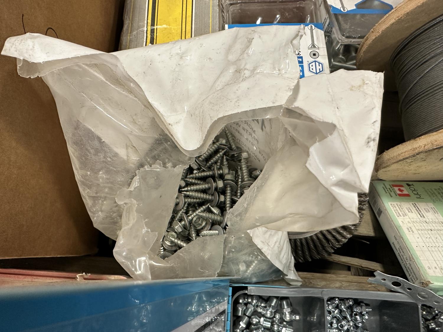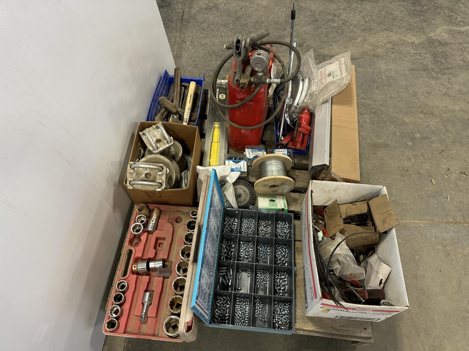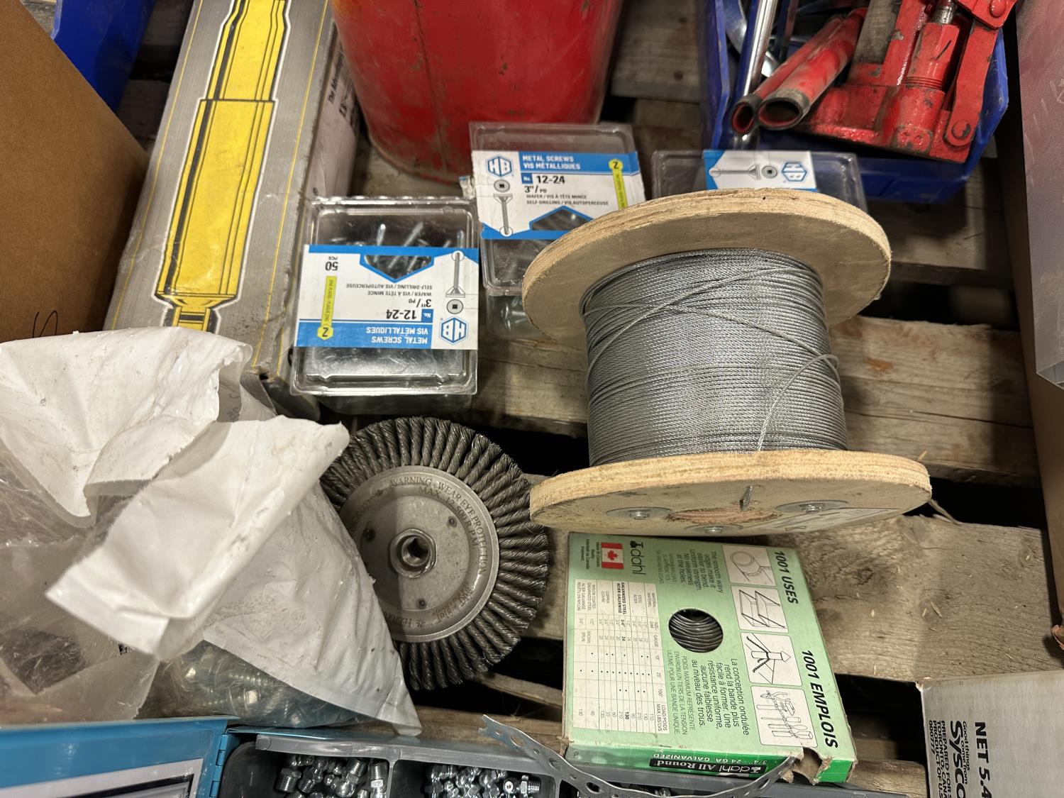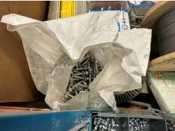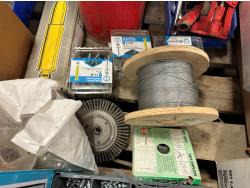 self-tapping screws, handpump jerry can, assortment of grease zerks, partial socket set assorted drive sizes, 1/8 inch metal cable, face shields with frames, chain-link fence gate rollers