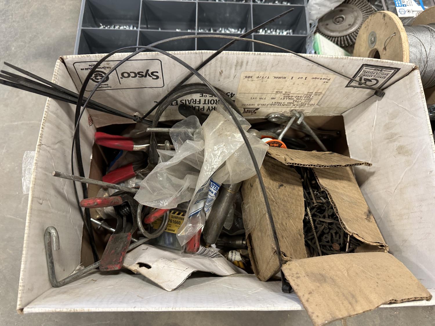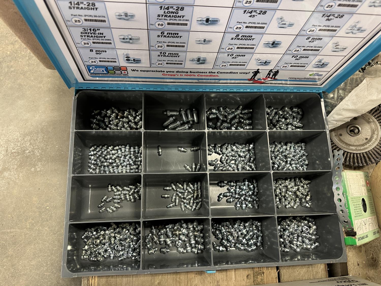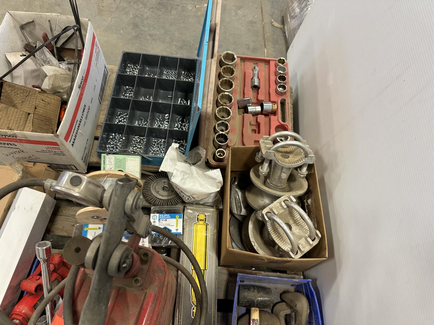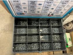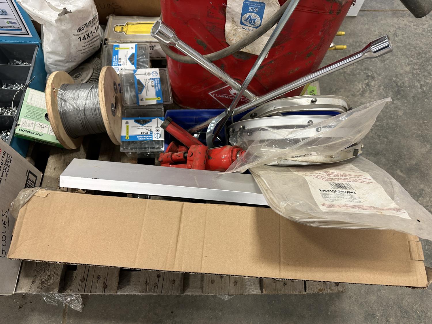 self-tapping screws, handpump jerry can, assortment of grease zerks, partial socket set assorted drive sizes, 1/8 inch metal cable, face shields with frames, chain-link fence gate rollers