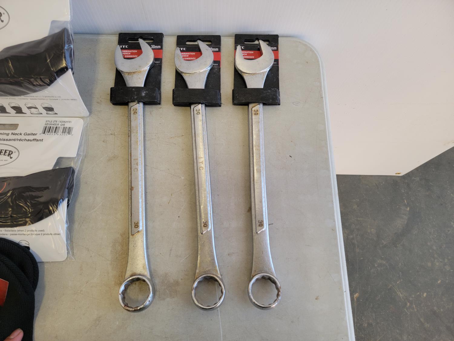 Qty of Work Wear and (3) 30 mm Combination Wrenches (Unused)
