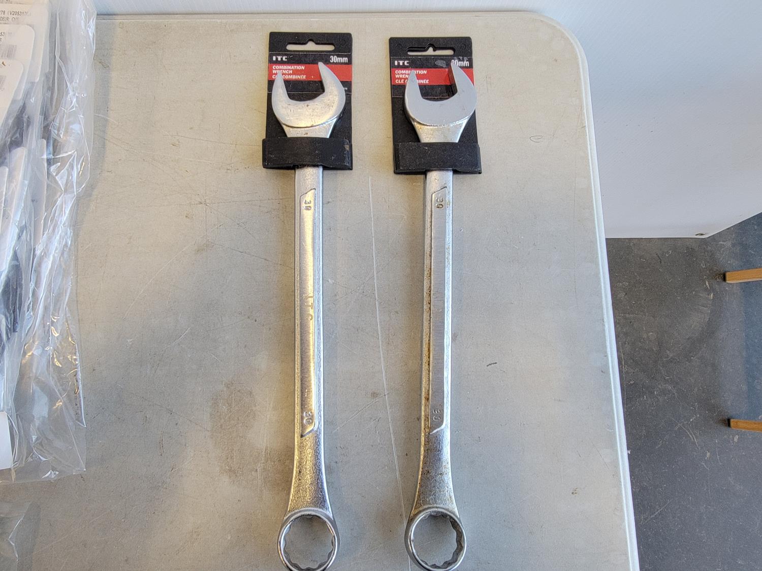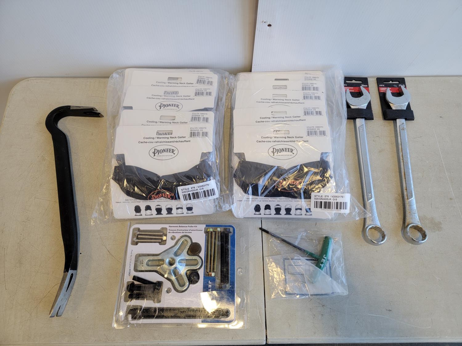 (2) 30 mm combination wrenches, (25) neck gaiters, crowbar, T hex key, harmonic balancer puller kit