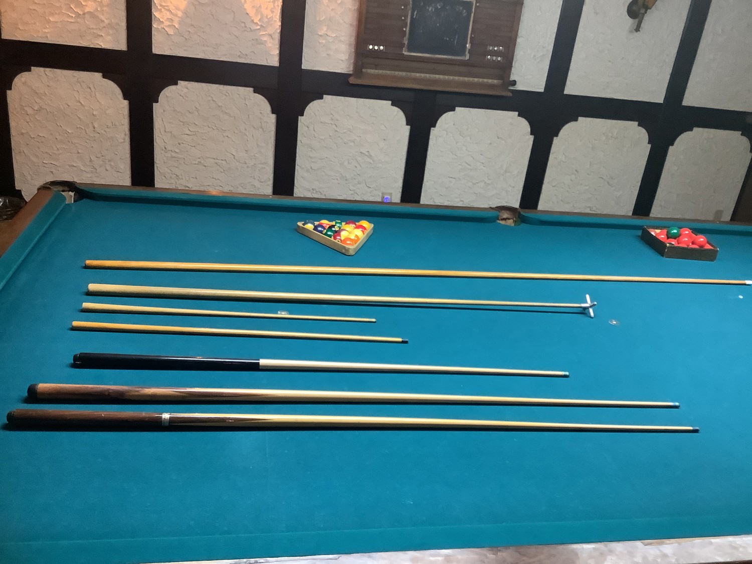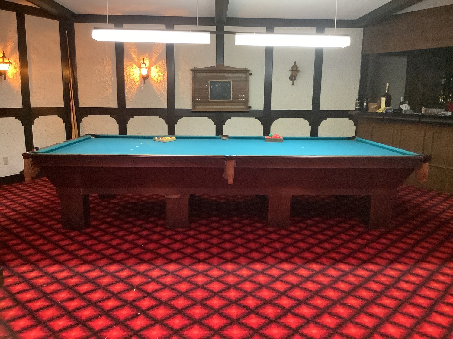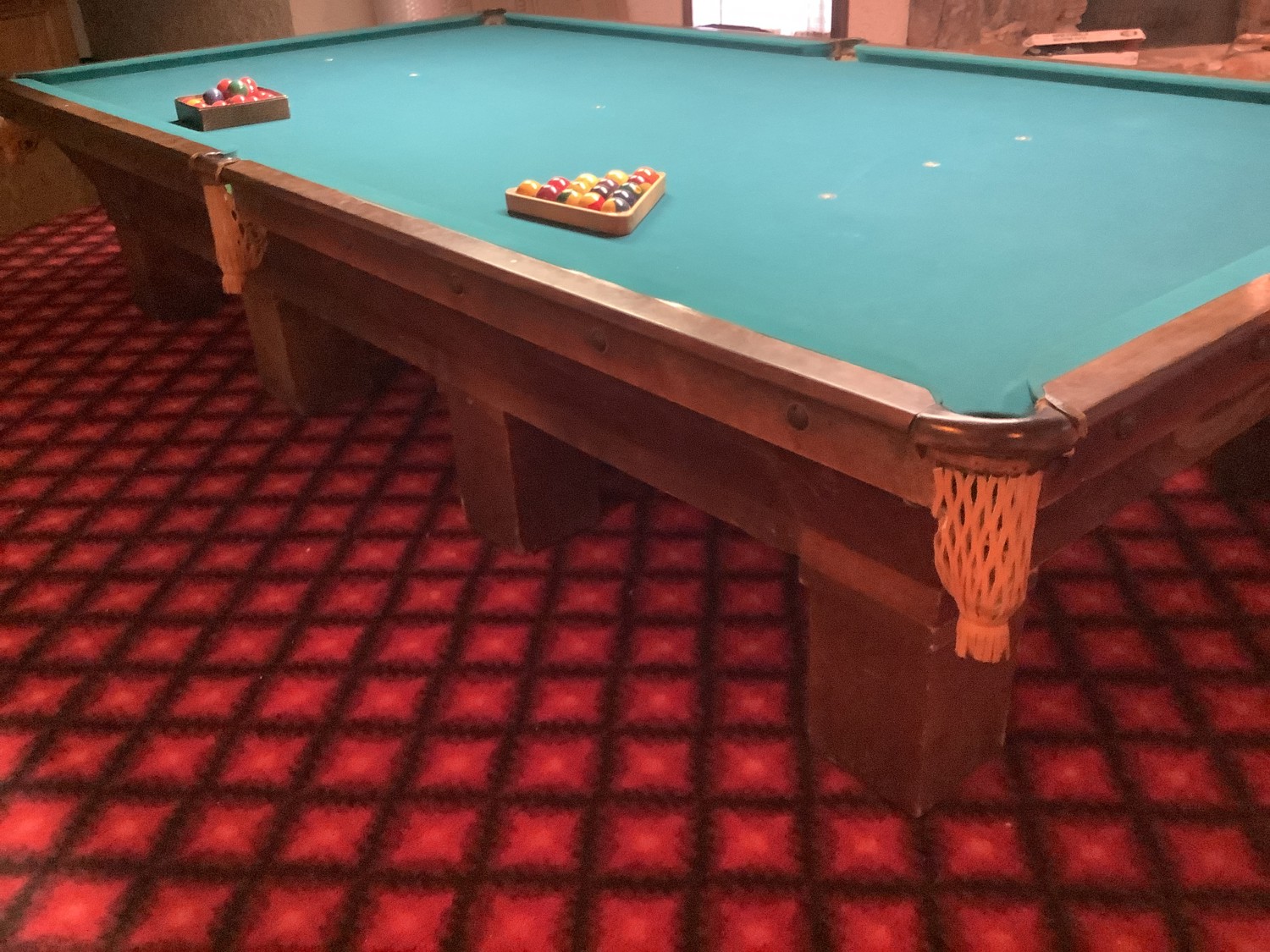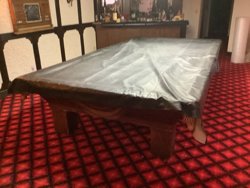 comes with 2 sets of balls, several cues, score board and cue stand. All sells as one lot approximately from the late 1950 area. Note buyer will have to bring help and all tools needed to take it apart and remove it from the home. Buyer will be able to back up to the walk out basement door about 50 ft away. Located on the far west side of Edmonton on acreage. Buyer will have up to April 1 to remove the pool table. You will need to call Al at 780-719-9277 to set up a date and time to pick it up