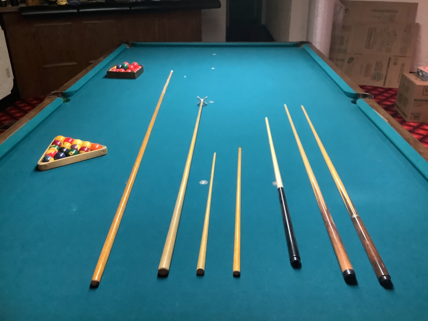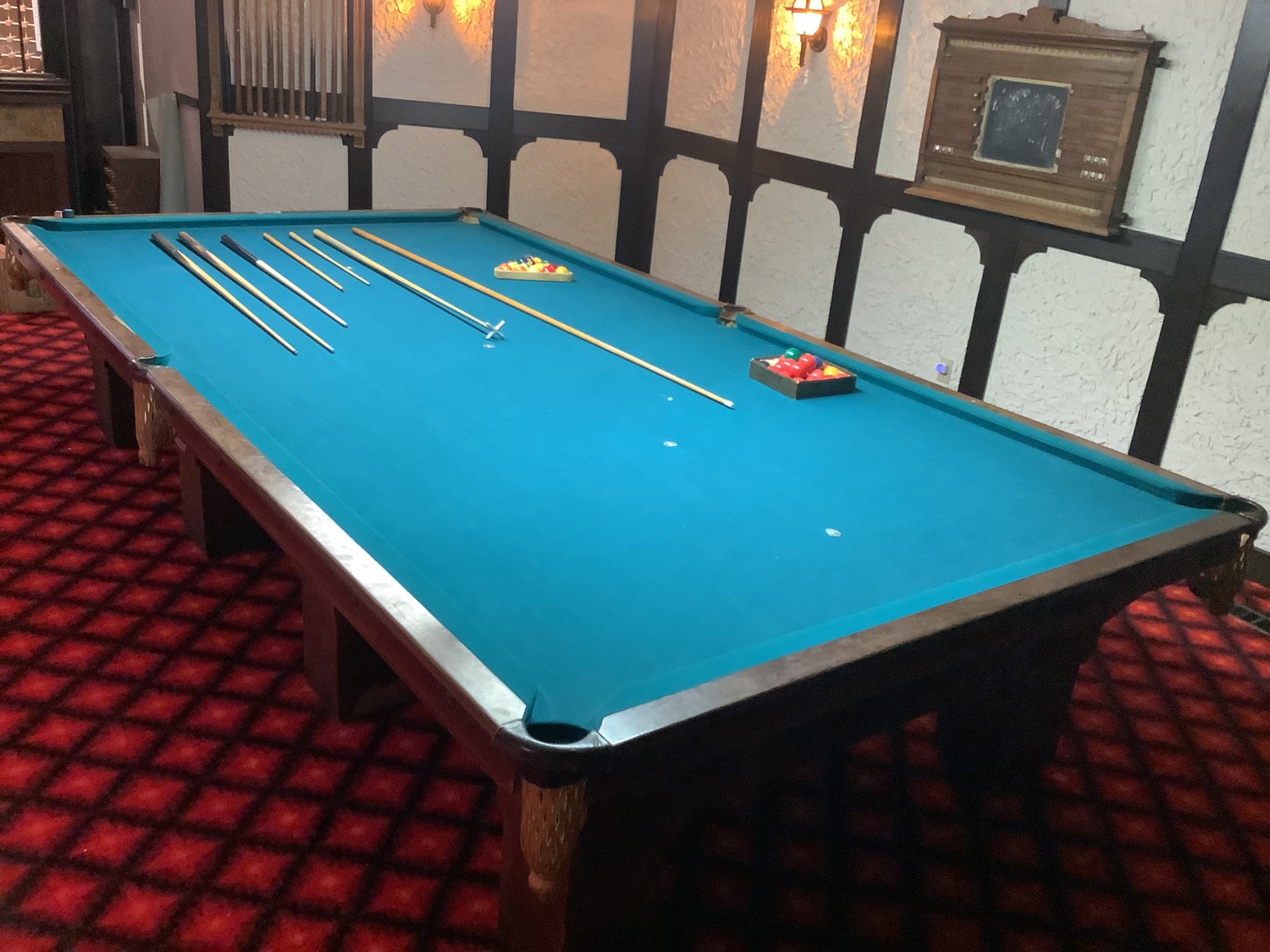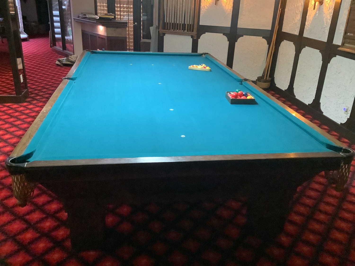comes with 2 sets of balls, several cues, score board and cue stand. All sells as one lot approximately from the late 1950 area. Note buyer will have to bring help and all tools needed to take it apart and remove it from the home. Buyer will be able to back up to the walk out basement door about 50 ft away. Located on the far west side of Edmonton on acreage. Buyer will have up to April 1 to remove the pool table. You will need to call Al at 780-719-9277 to set up a date and time to pick it up