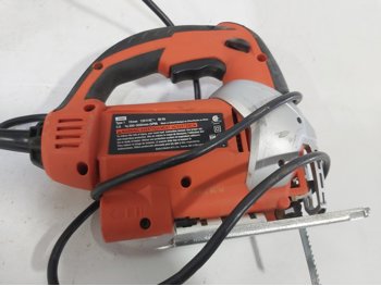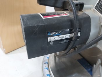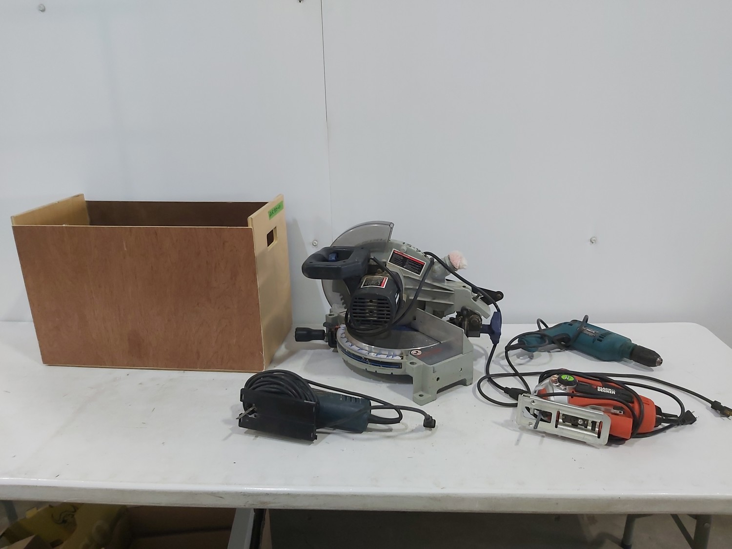Bosch jigsaw, Black & Decker jigsaw, Makita drill, Delta Shopmaster 10 inch compound miter saw, wooden box 24 inch x 12 inch x 15 inch h