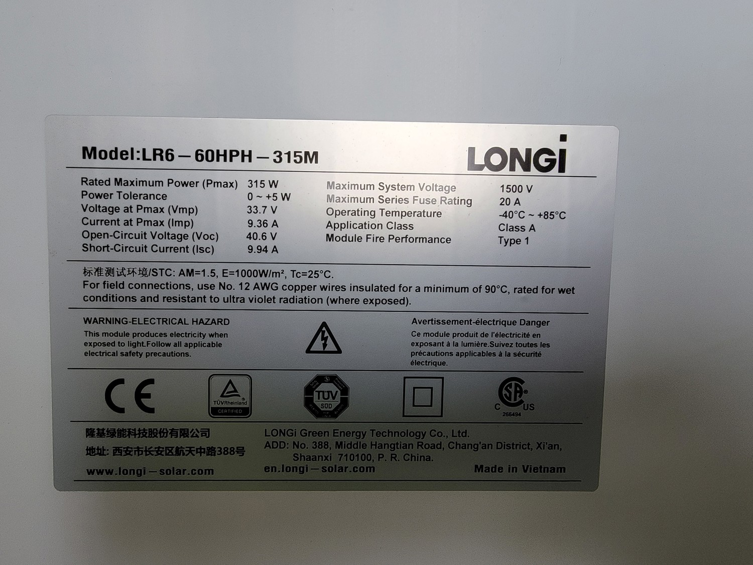 1018 Longi 315 W Solar Panel