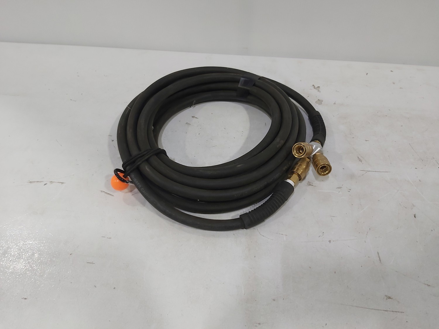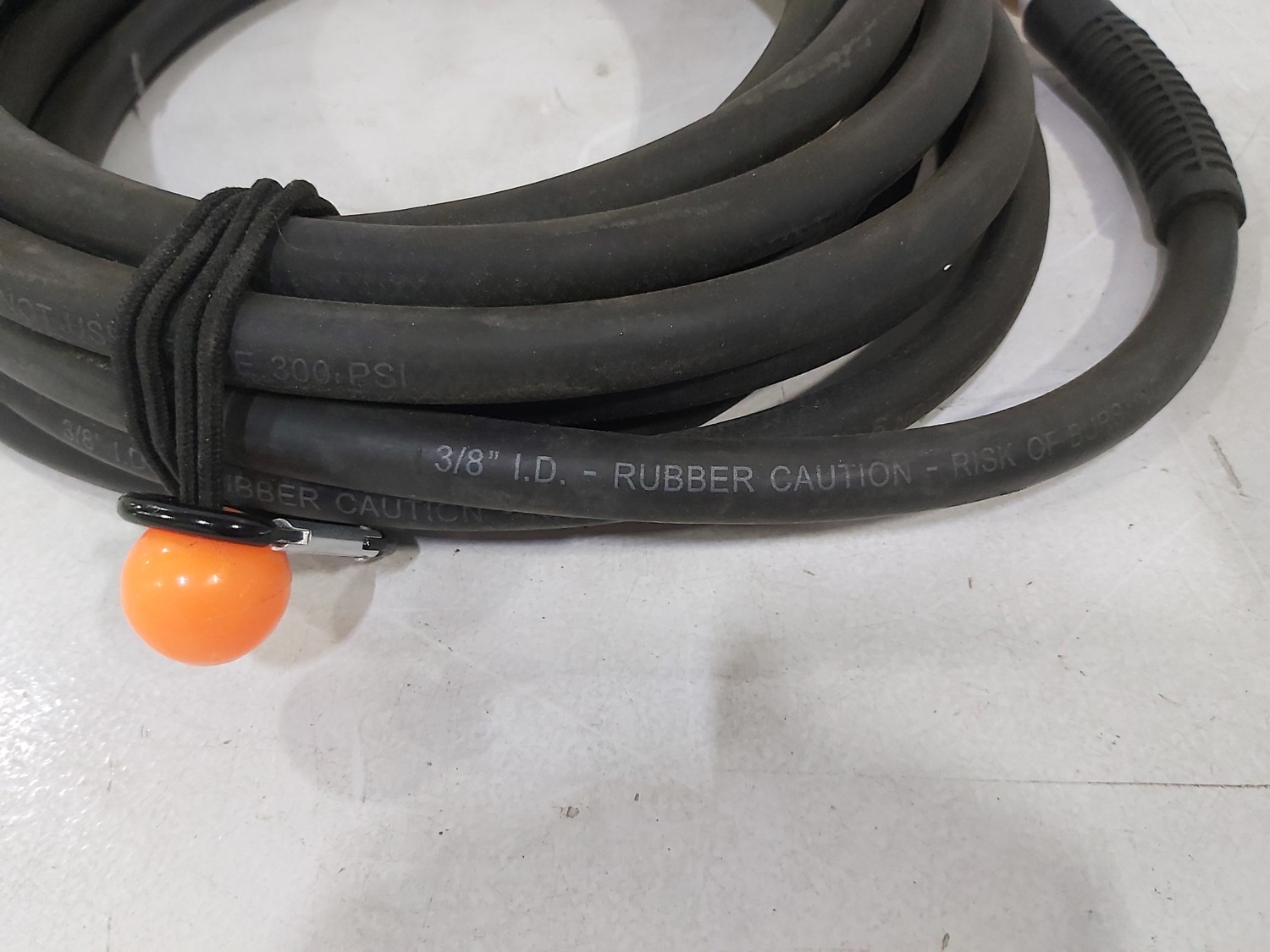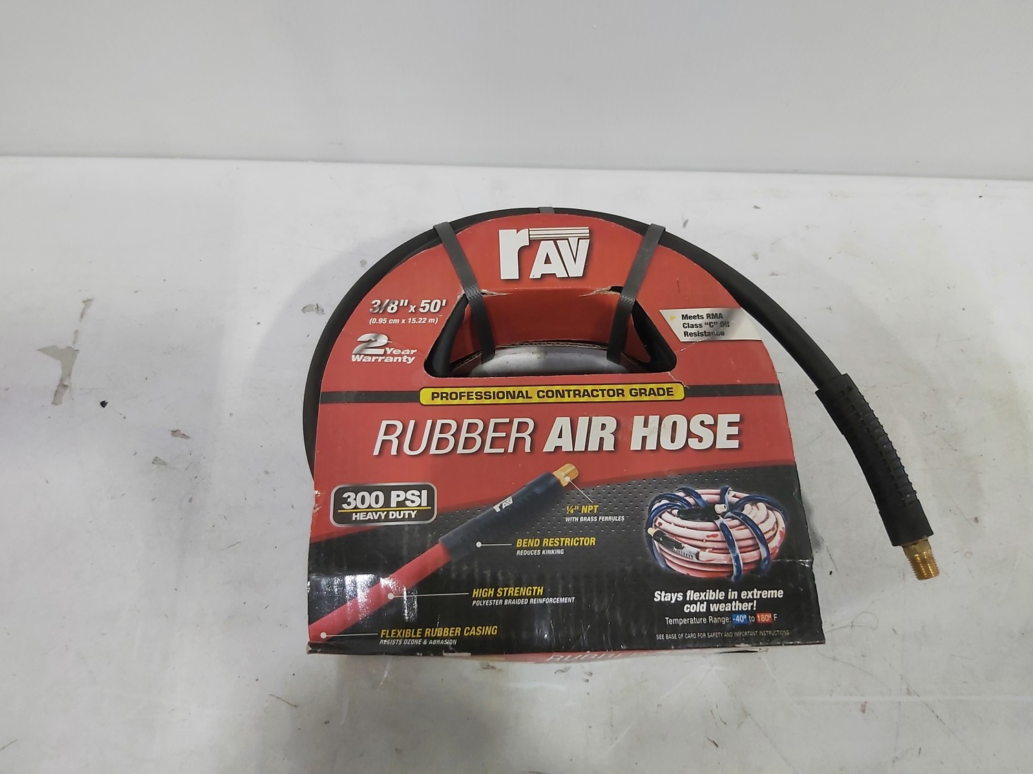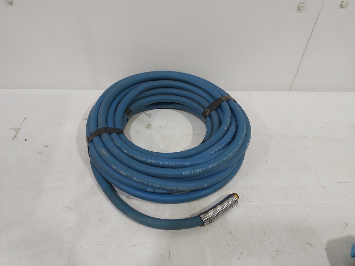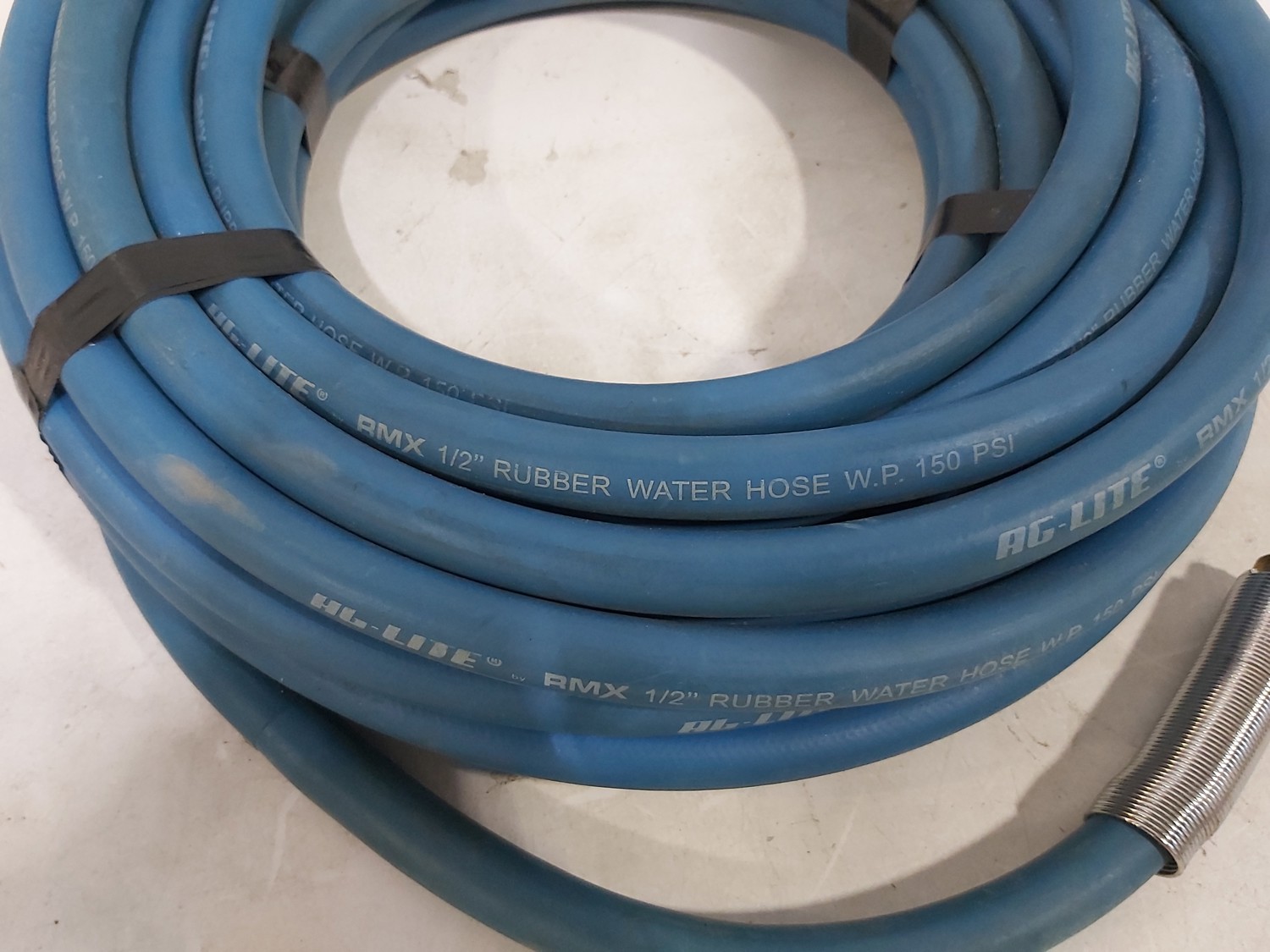 3/8 inch x 50 ft rubber air hose (unused), 1/2 inch rubber water hose, 3/8 inch rubber air hose