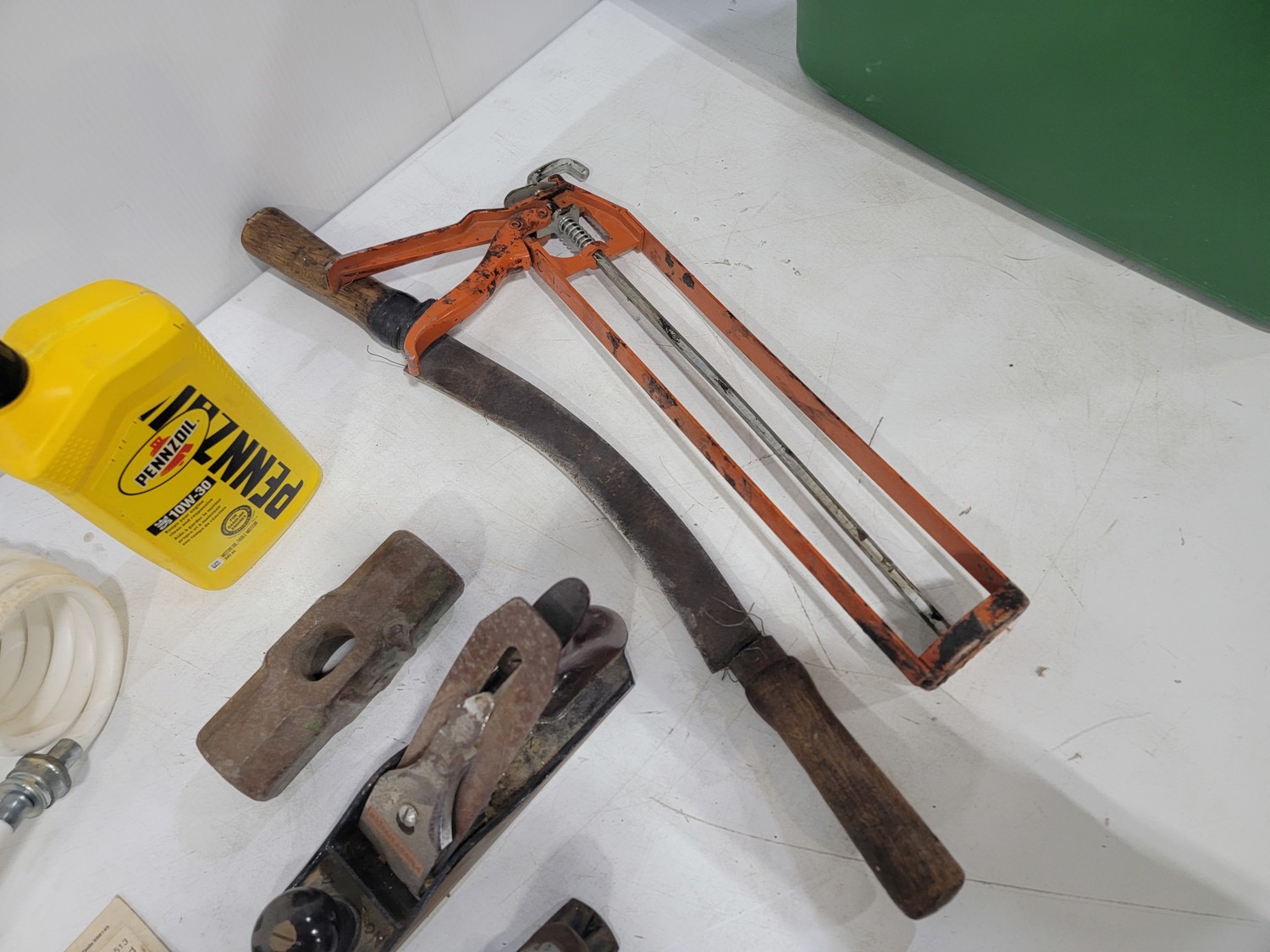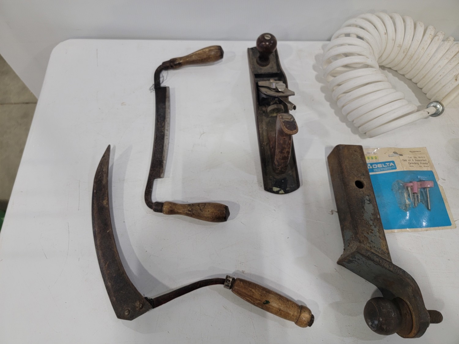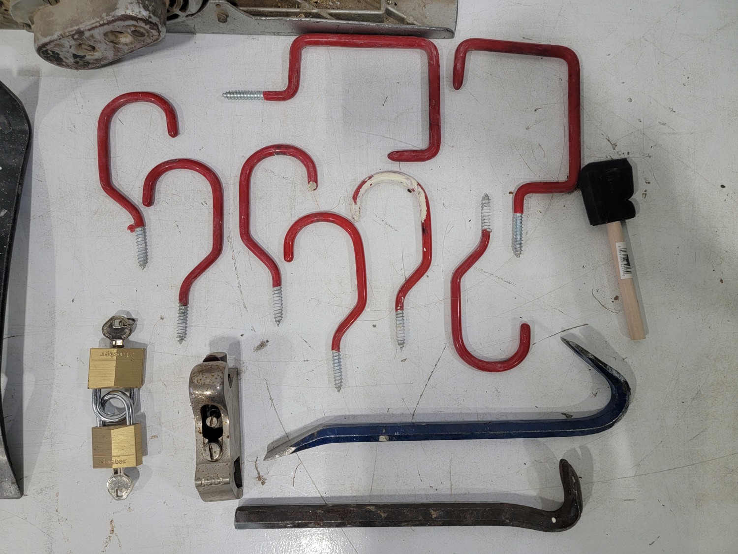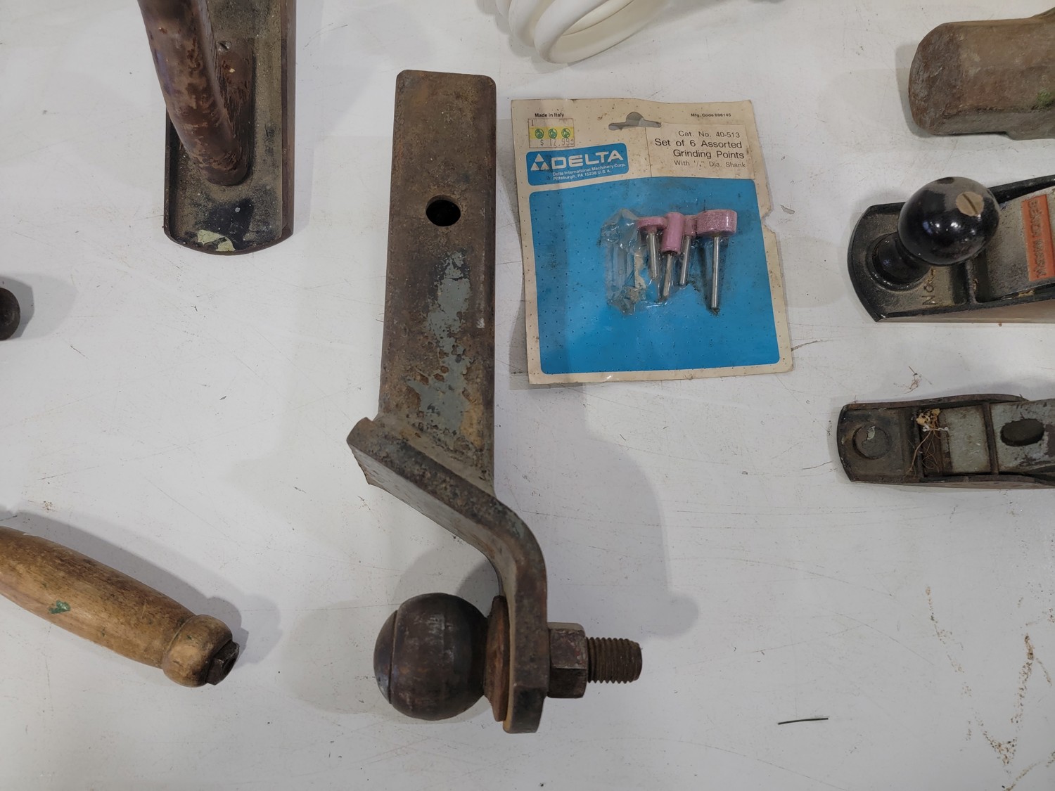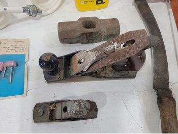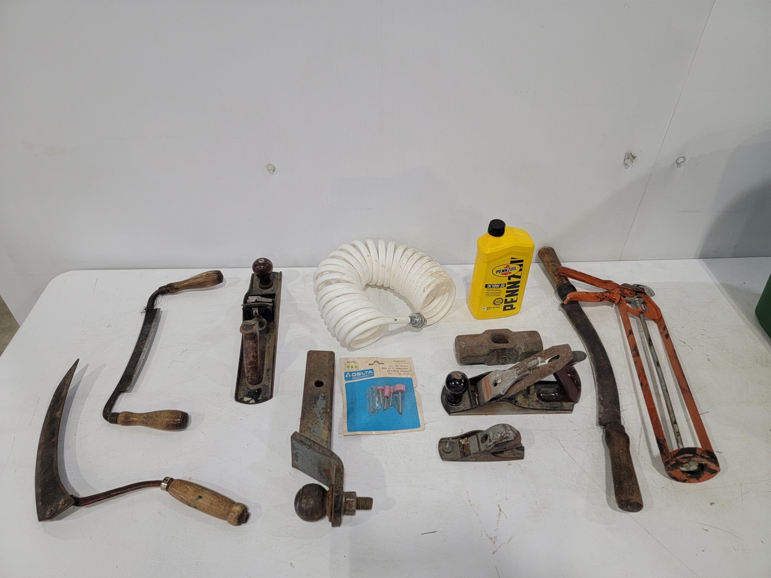 work light, hand planners, pry tools, draw knife, hand scythe, ball hitch, garage storage hooks, pipe wrench