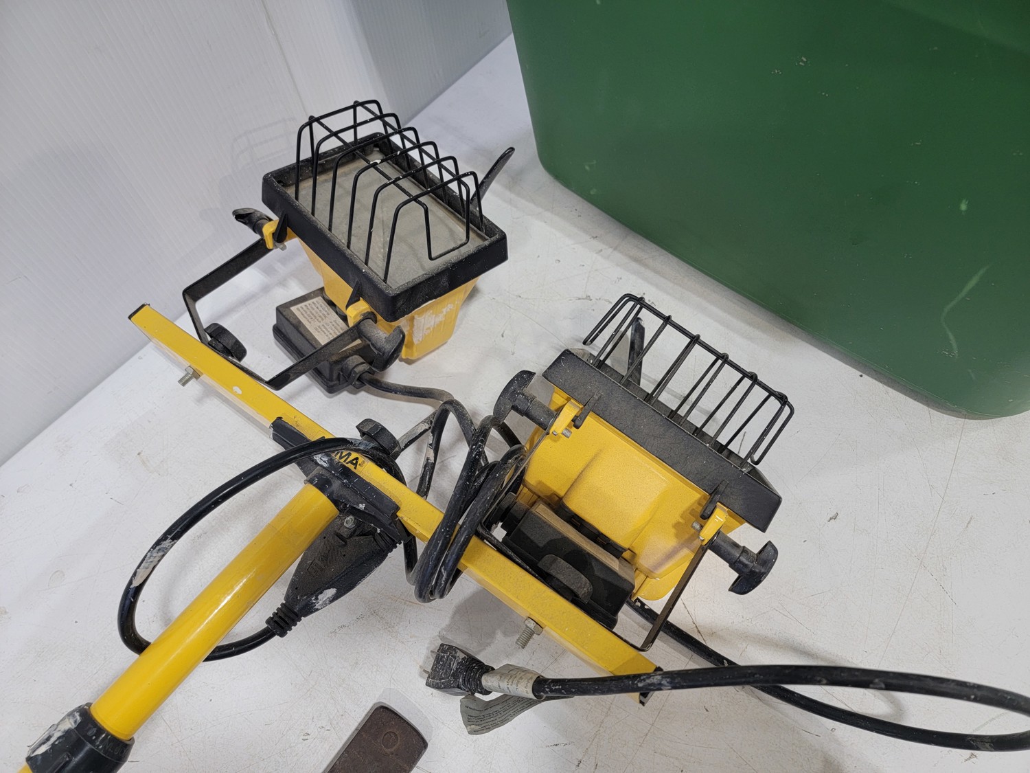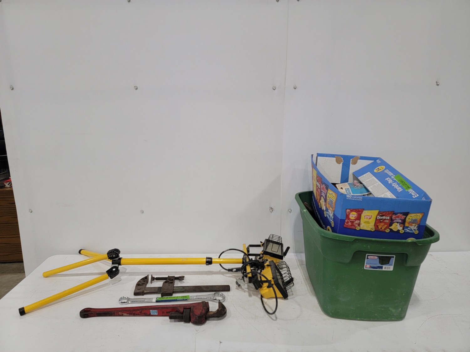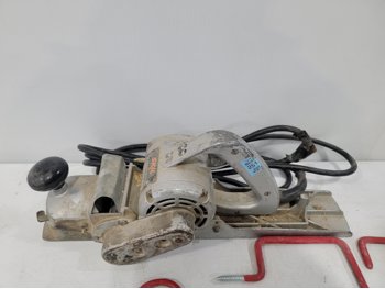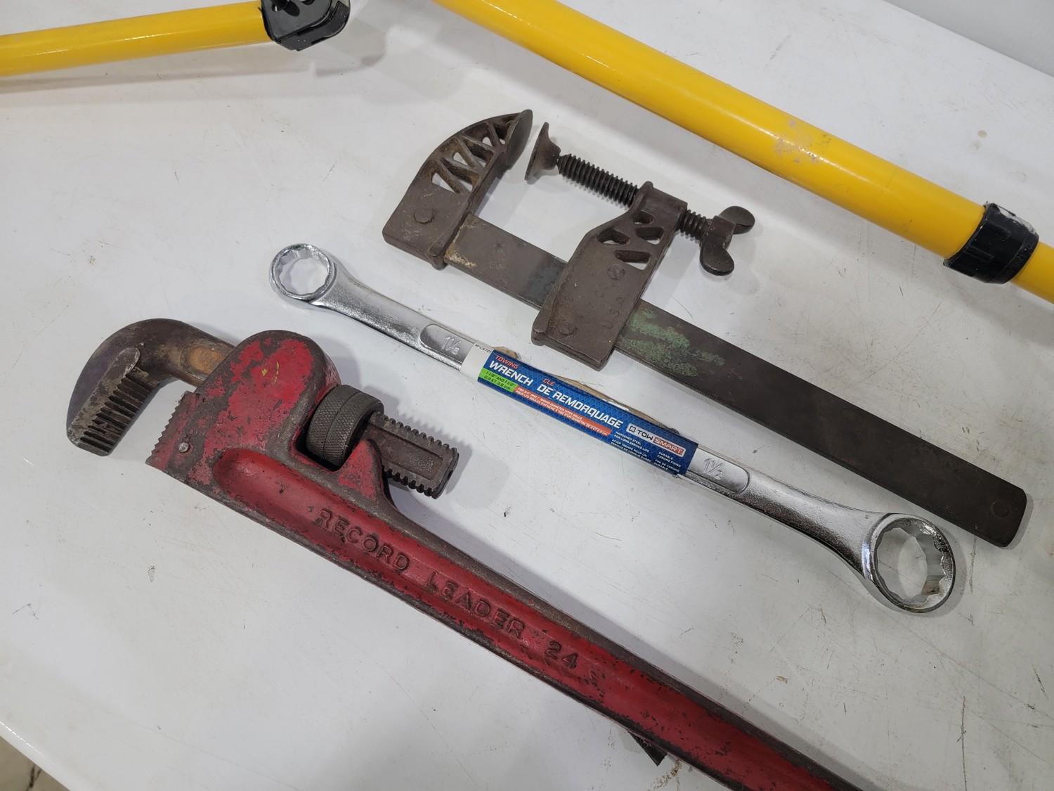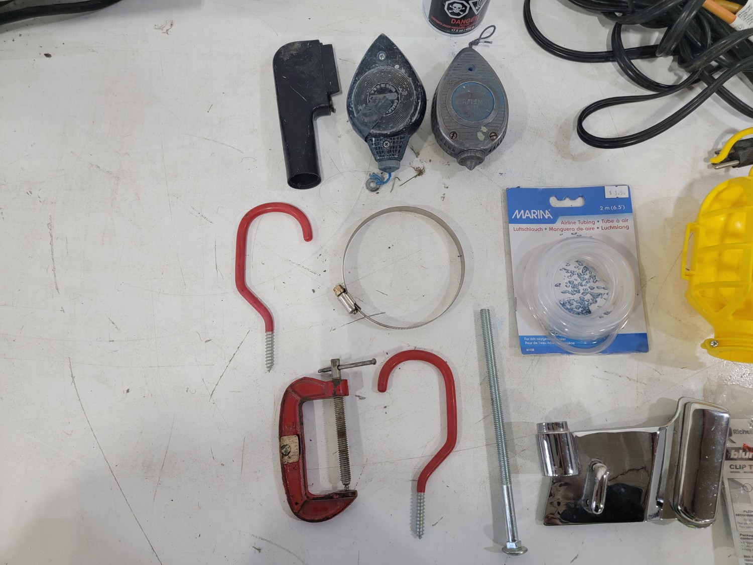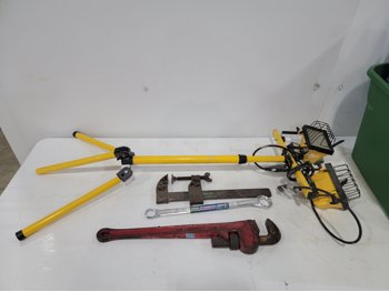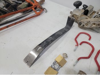 work light, hand planners, pry tools, draw knife, hand scythe, ball hitch, garage storage hooks, pipe wrench