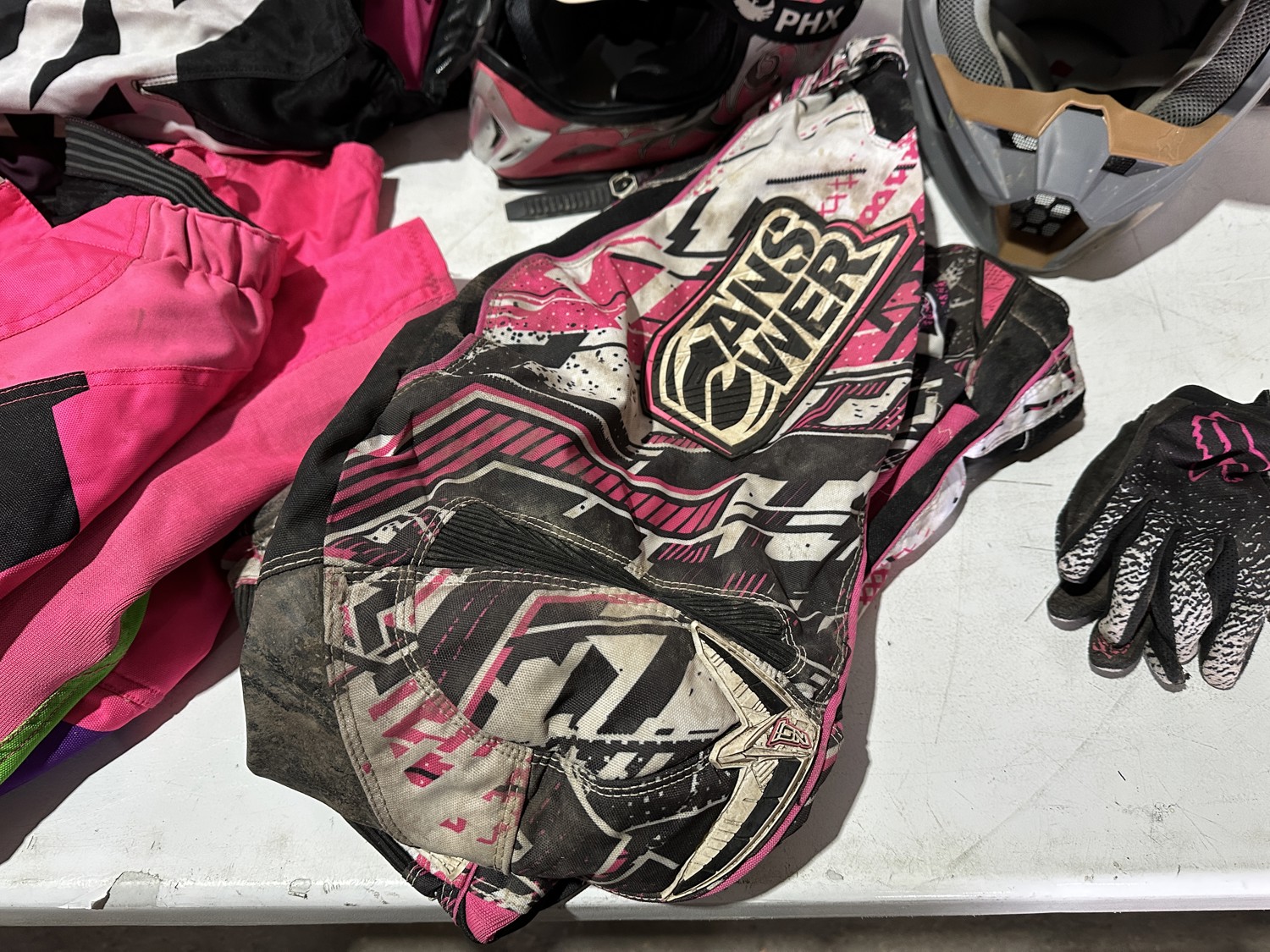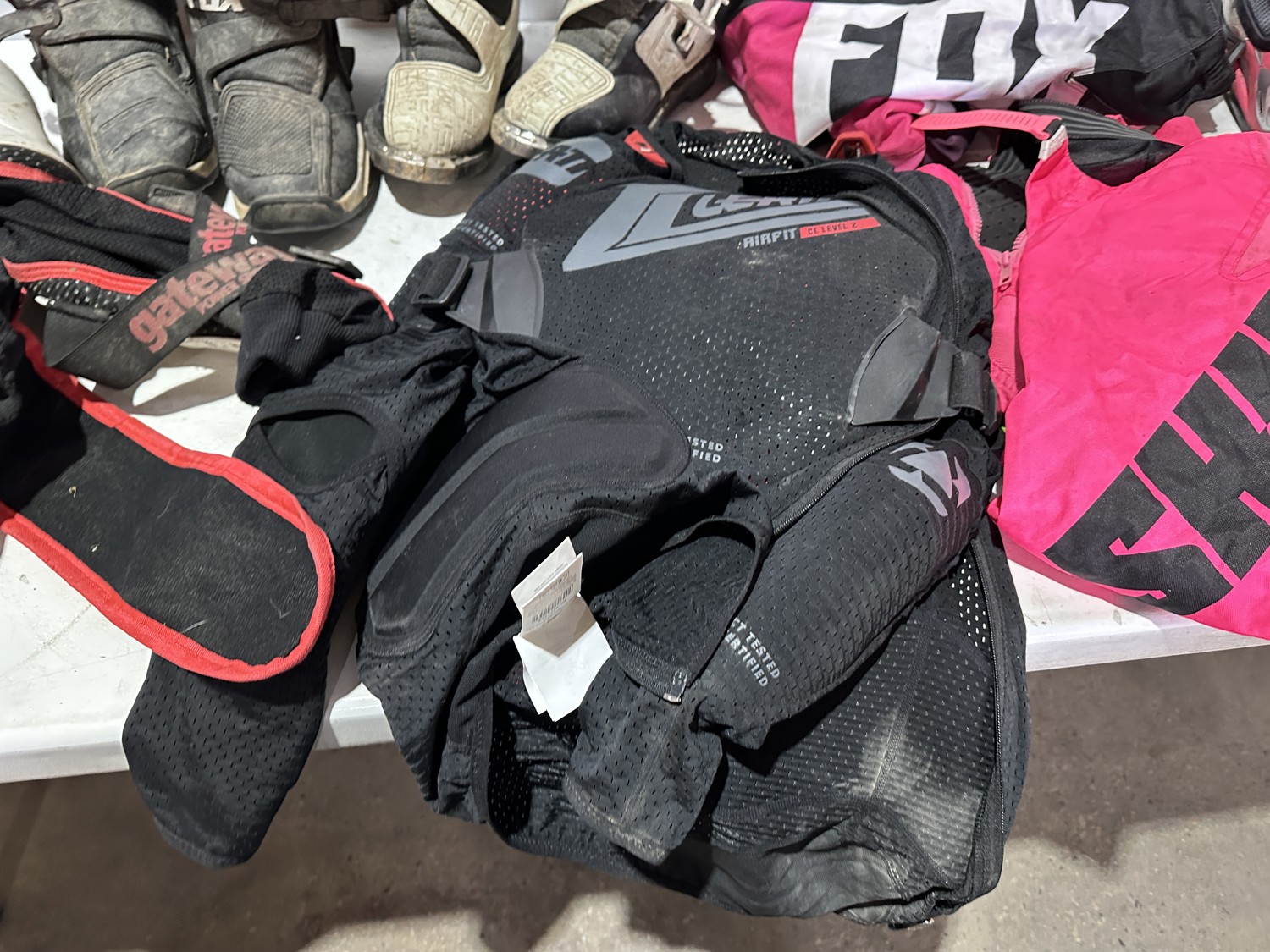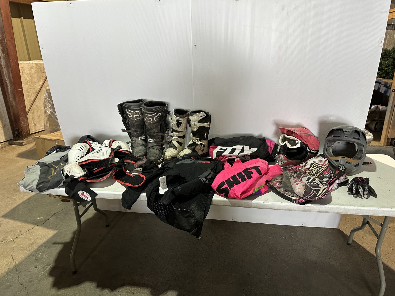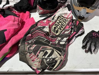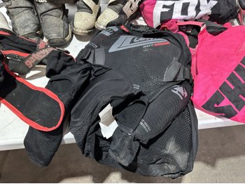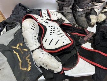 girl's riding pants sizes: 8, 28,12, girl's helmet size large with goggles, men's size XXL and medium body armor, men's size 34 pants, men's size large riding shirt, women's size 7 boots, men's size 10 boots, men's size large helmet, gloves
