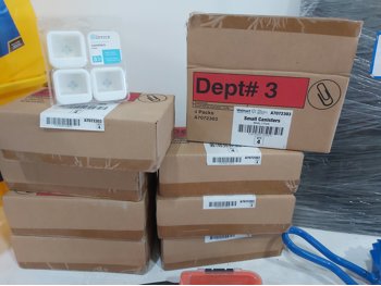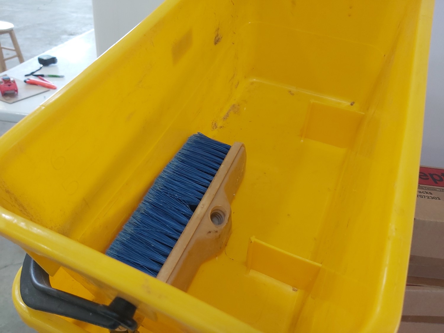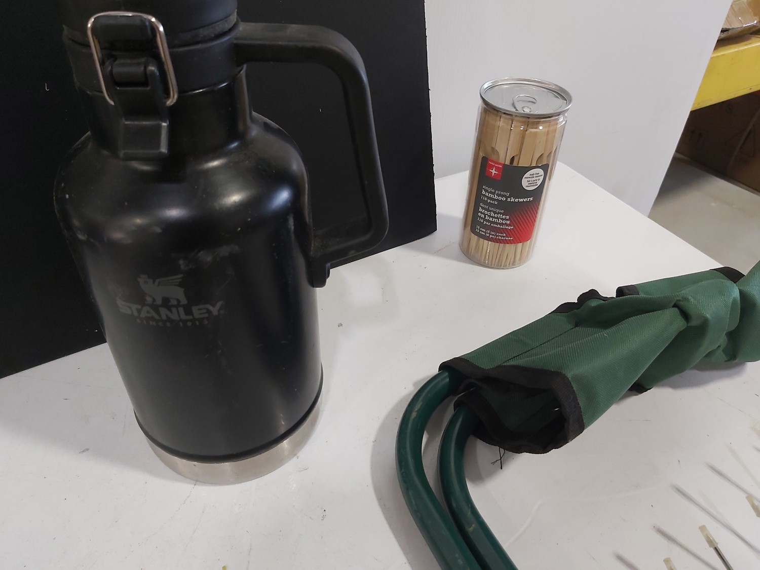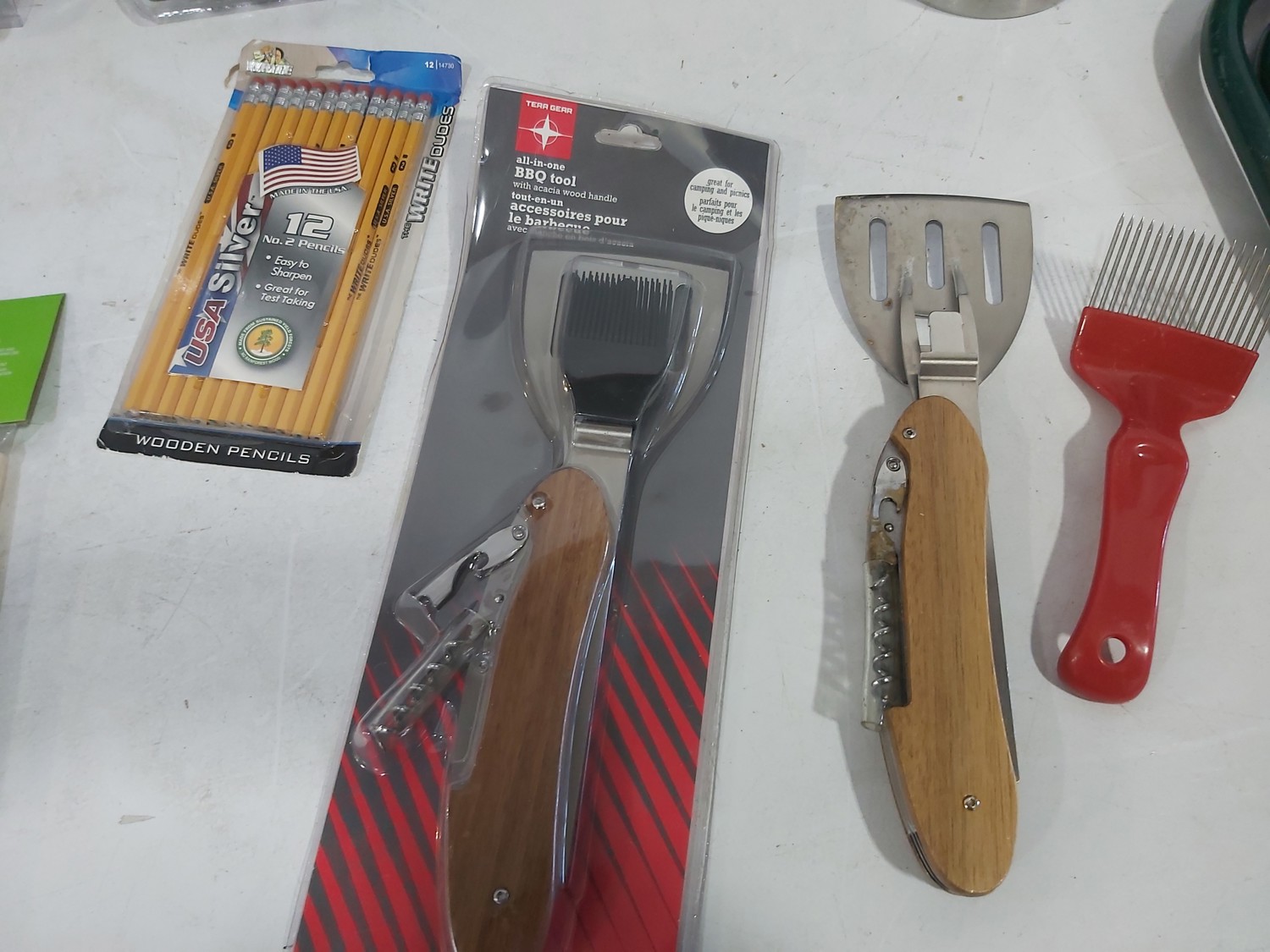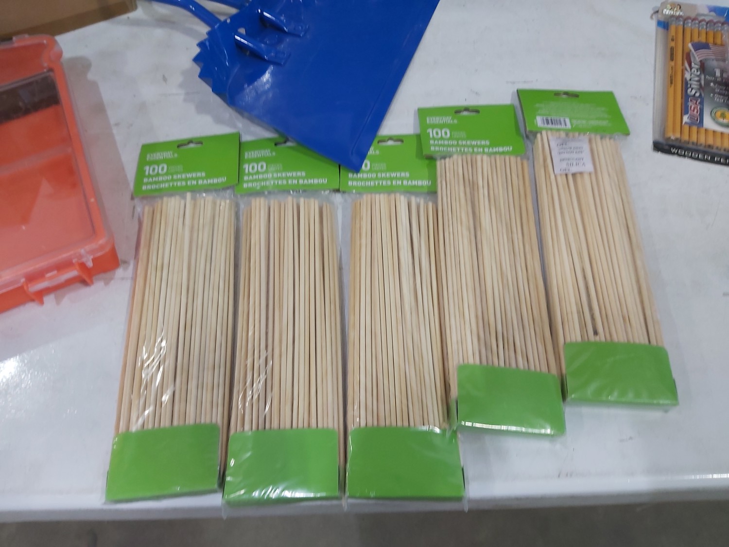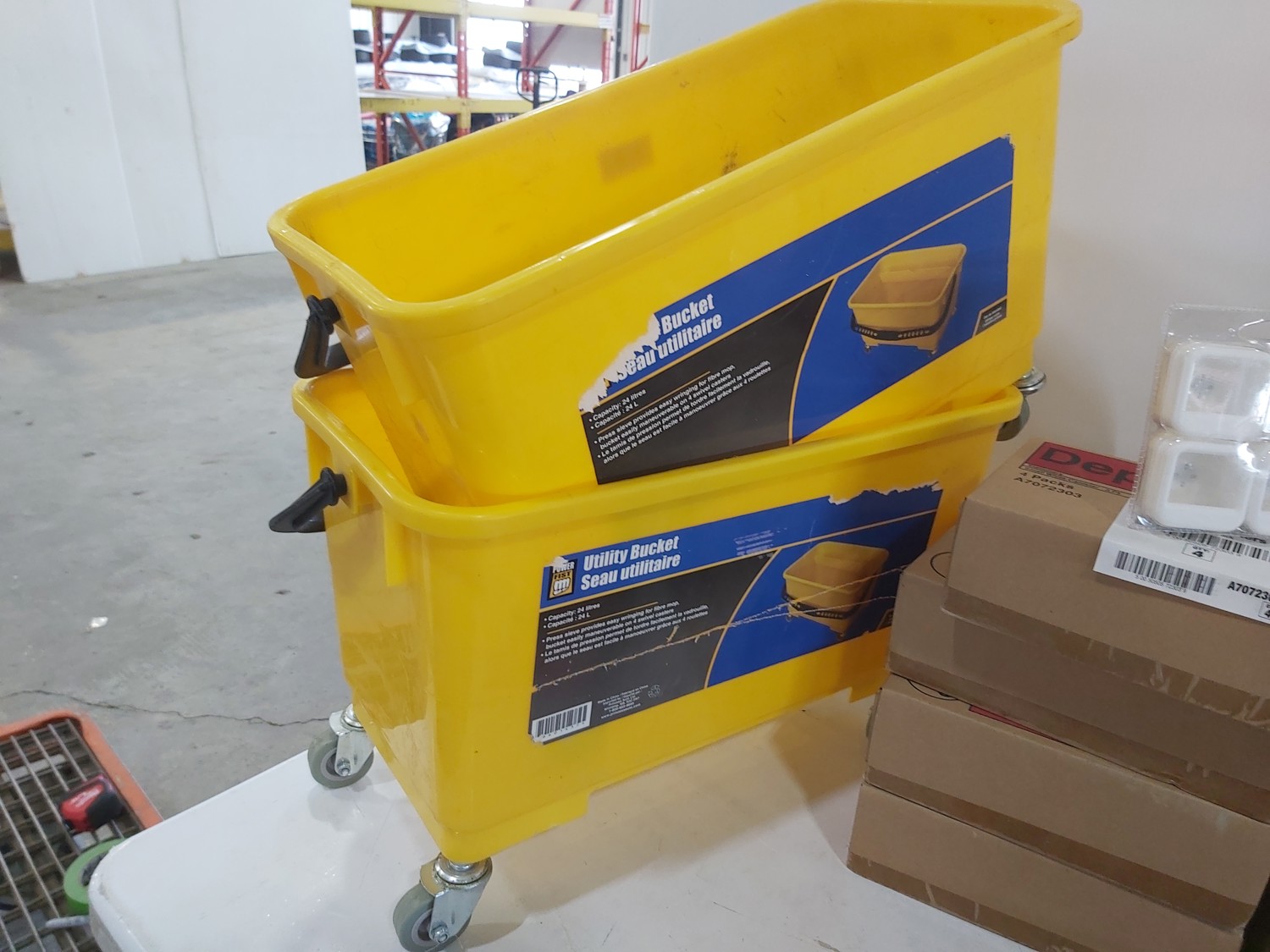 (2) 24L utility buckets, (112) small magnetic canisters, office equipment, bamboo skewers, BBQ utensils