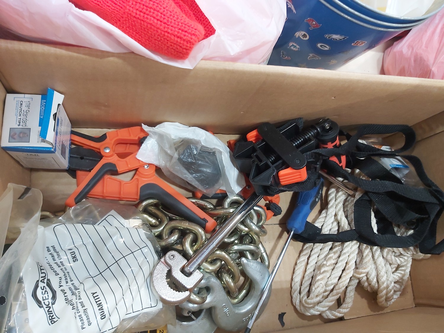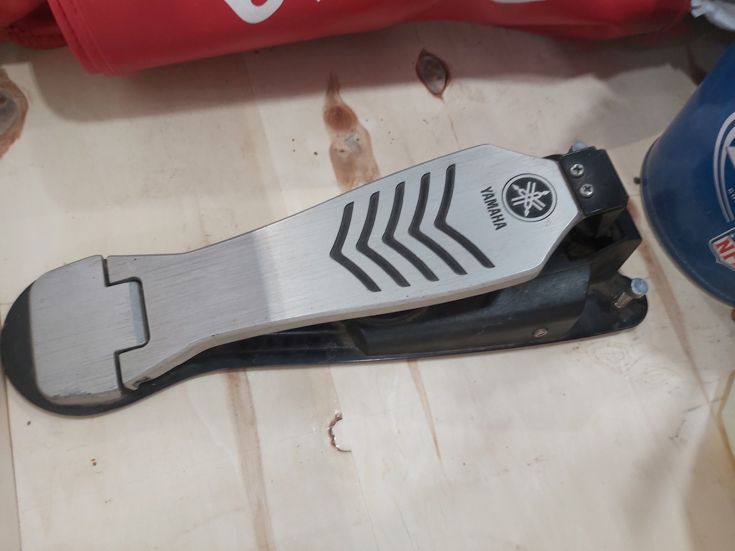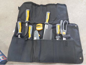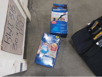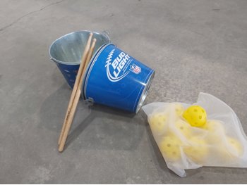(2) pole caddy organizers, Yamaha foot pedal, drumsticks, golf bag, Eastman butcher set, sck sliders, hi-vis safety wear