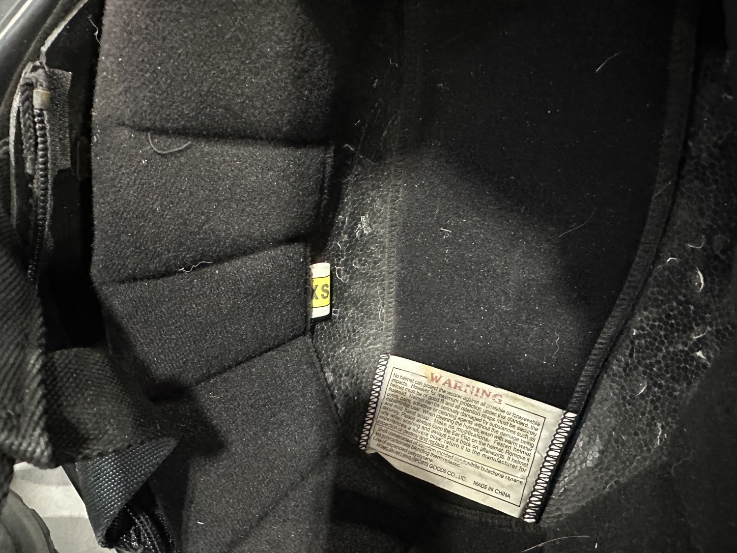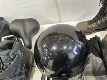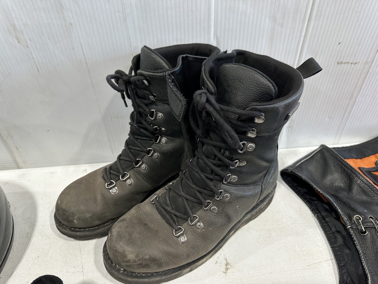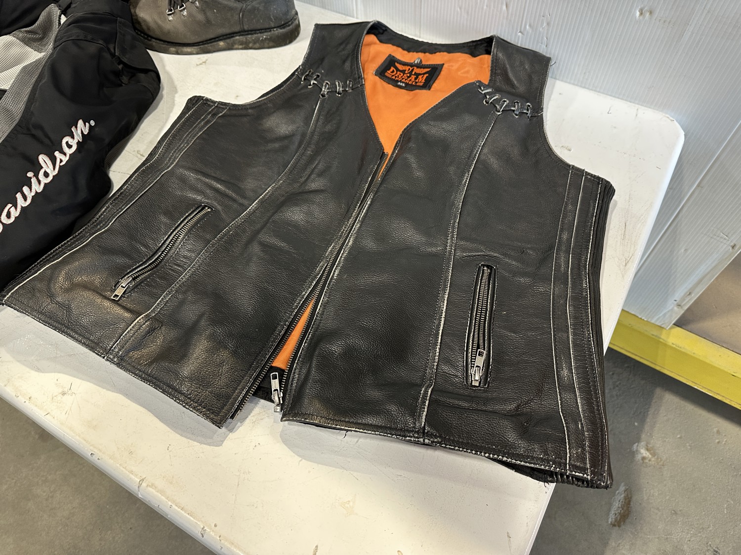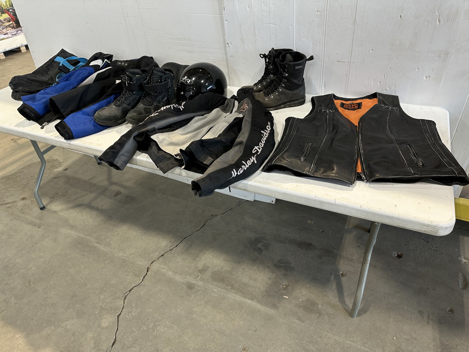 3XL vest, size 8-1/2 M Harley-Davidson boots, size 10 boots, Harley-Davidson jacket (size unknown), size XS helmet, Shift size XXL jacket