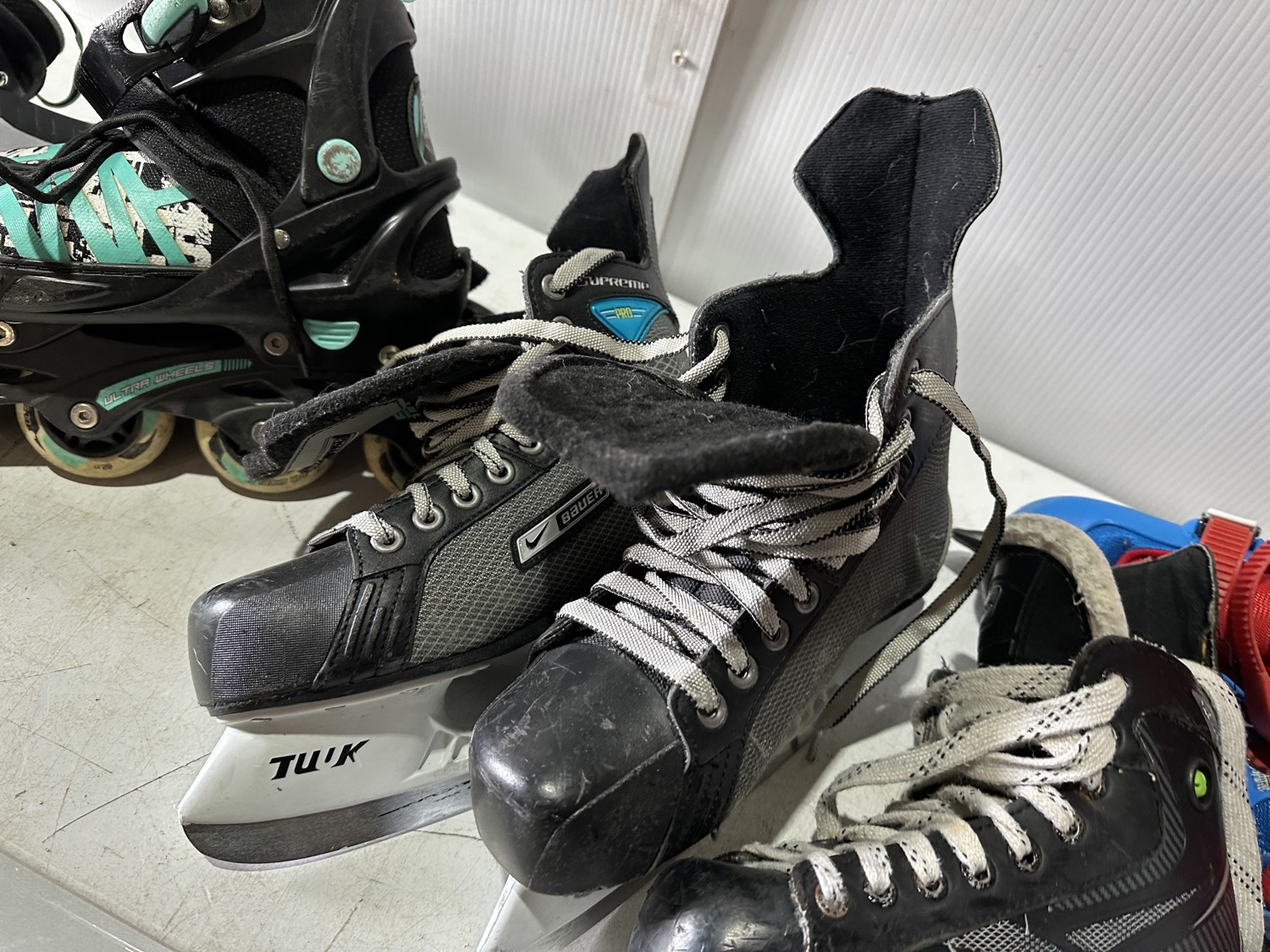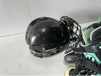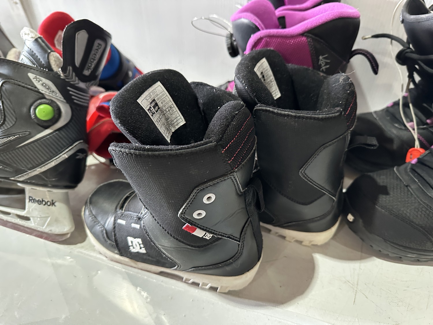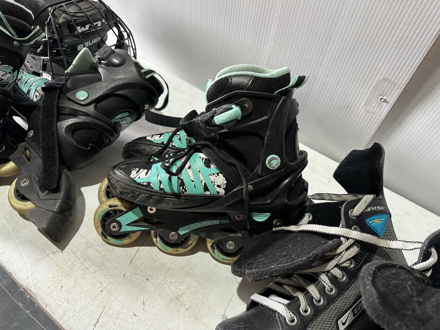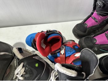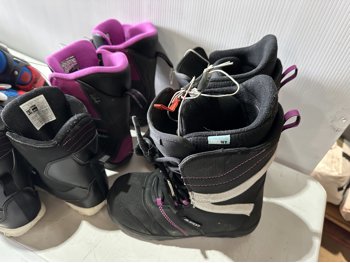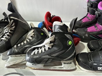 158 cm snowboard, ladies size 8 snowboard boots, girls size 5 snowboard boots, boys size 3 snowboard boots, adjustable Y8-Y11 skates, (2) pairs of ice skates, (2) pairs of roller blades, helmet