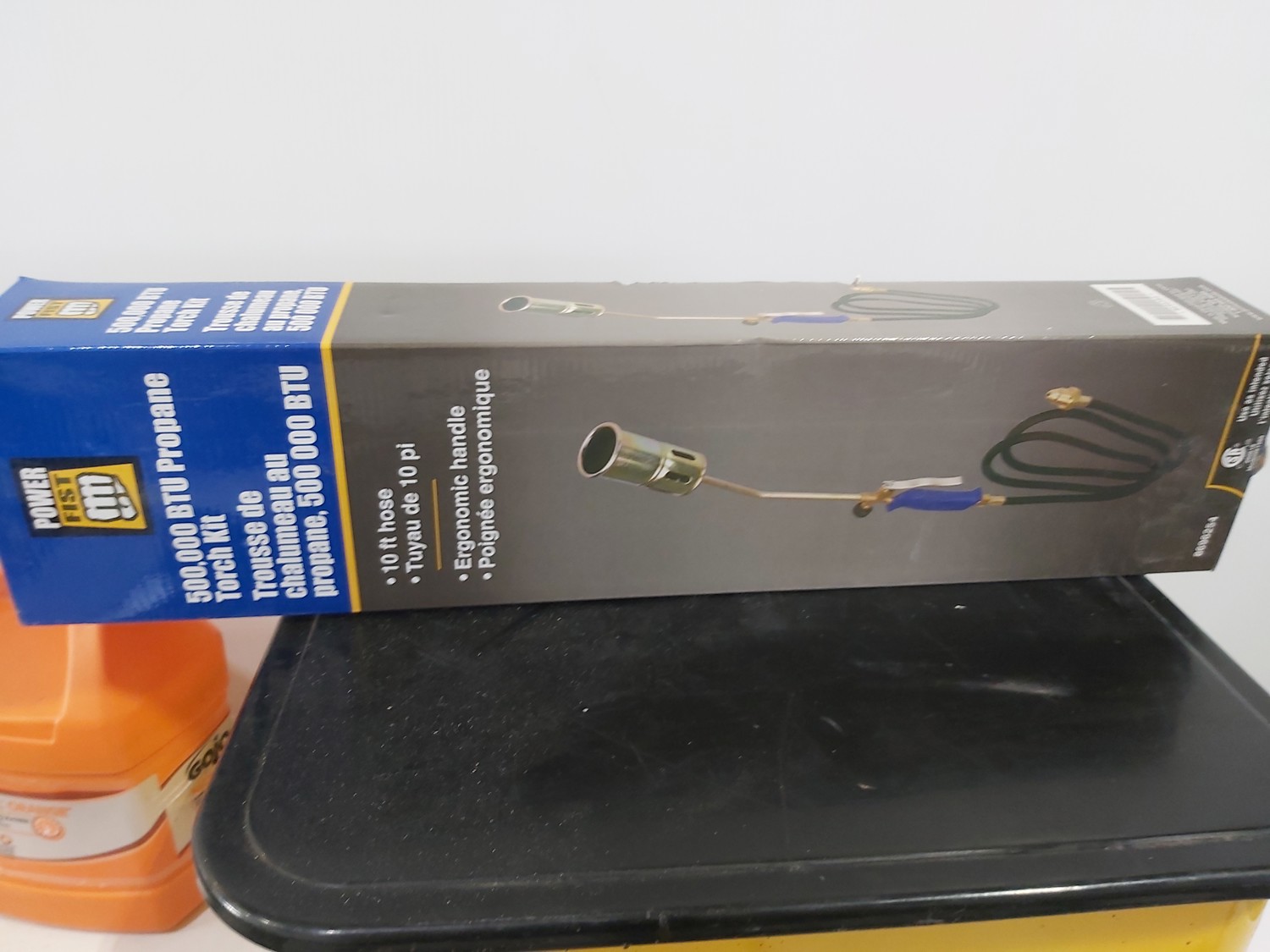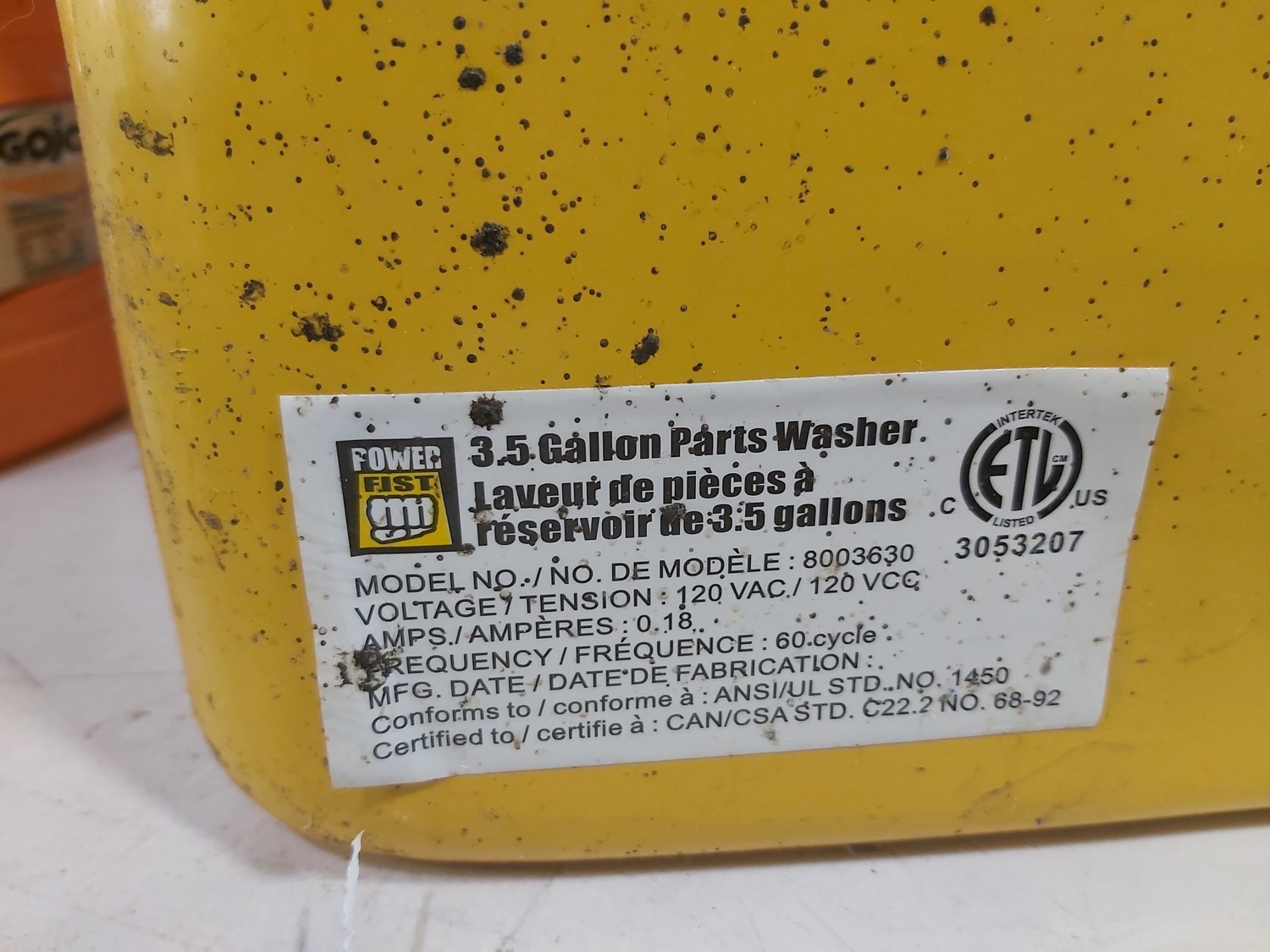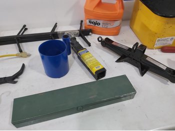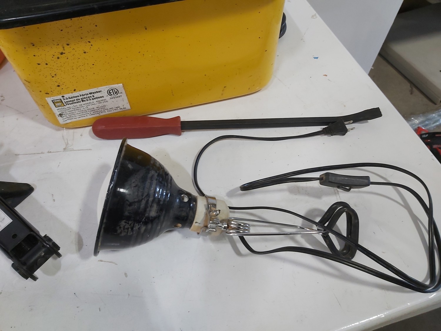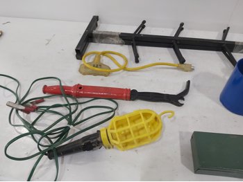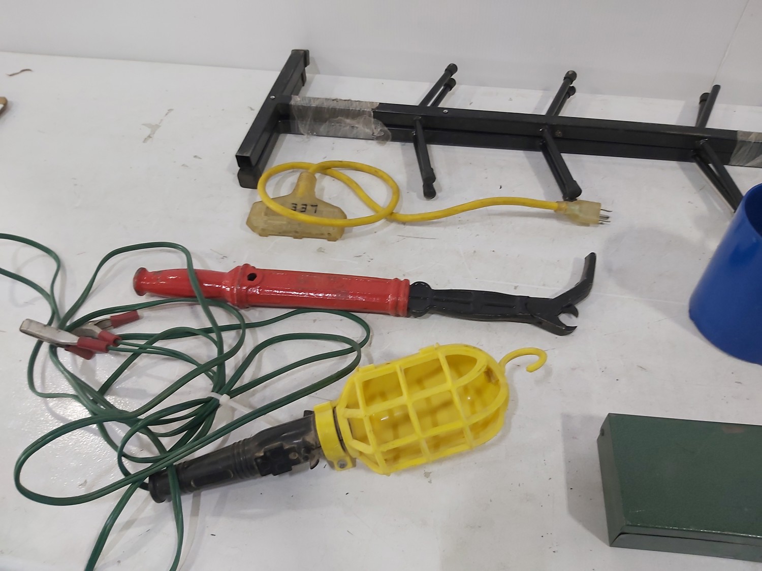 Powerfist 3-1/2 gallon parts washer, Powerfist 500,000 BTU propane torch, scissor jack, hitch receiver reducer, metal pole stand, (2) metal racks, slide hammer, pry bar, (2) inspection lamps, Gojo hand cleaner