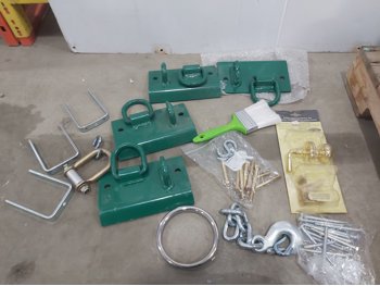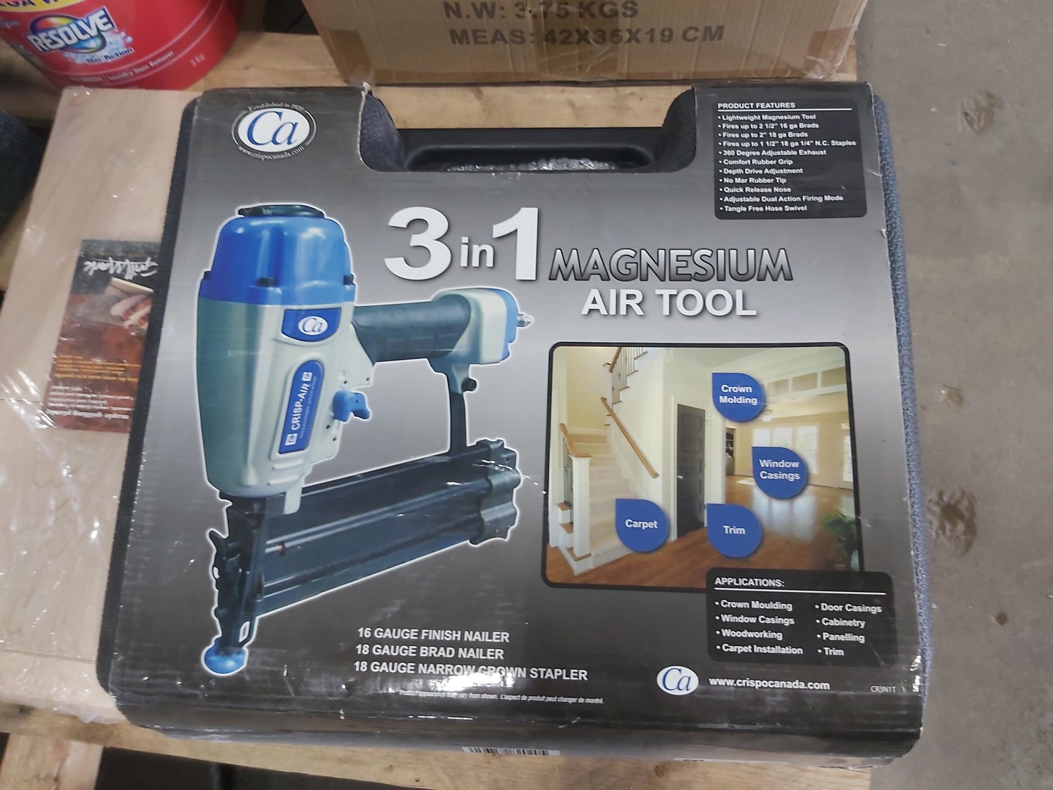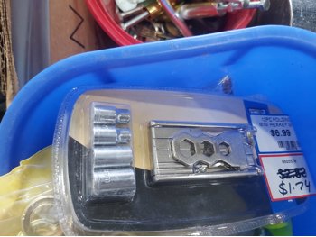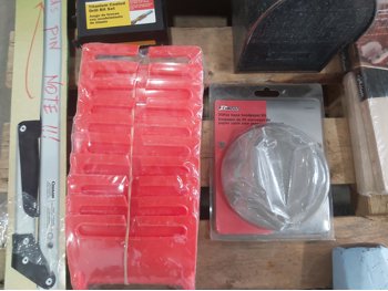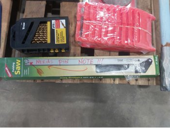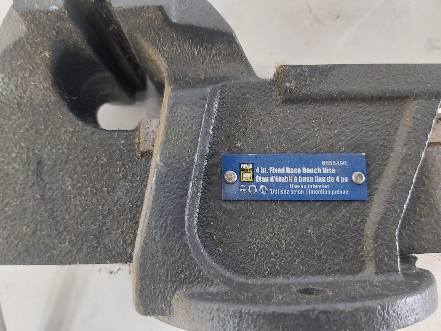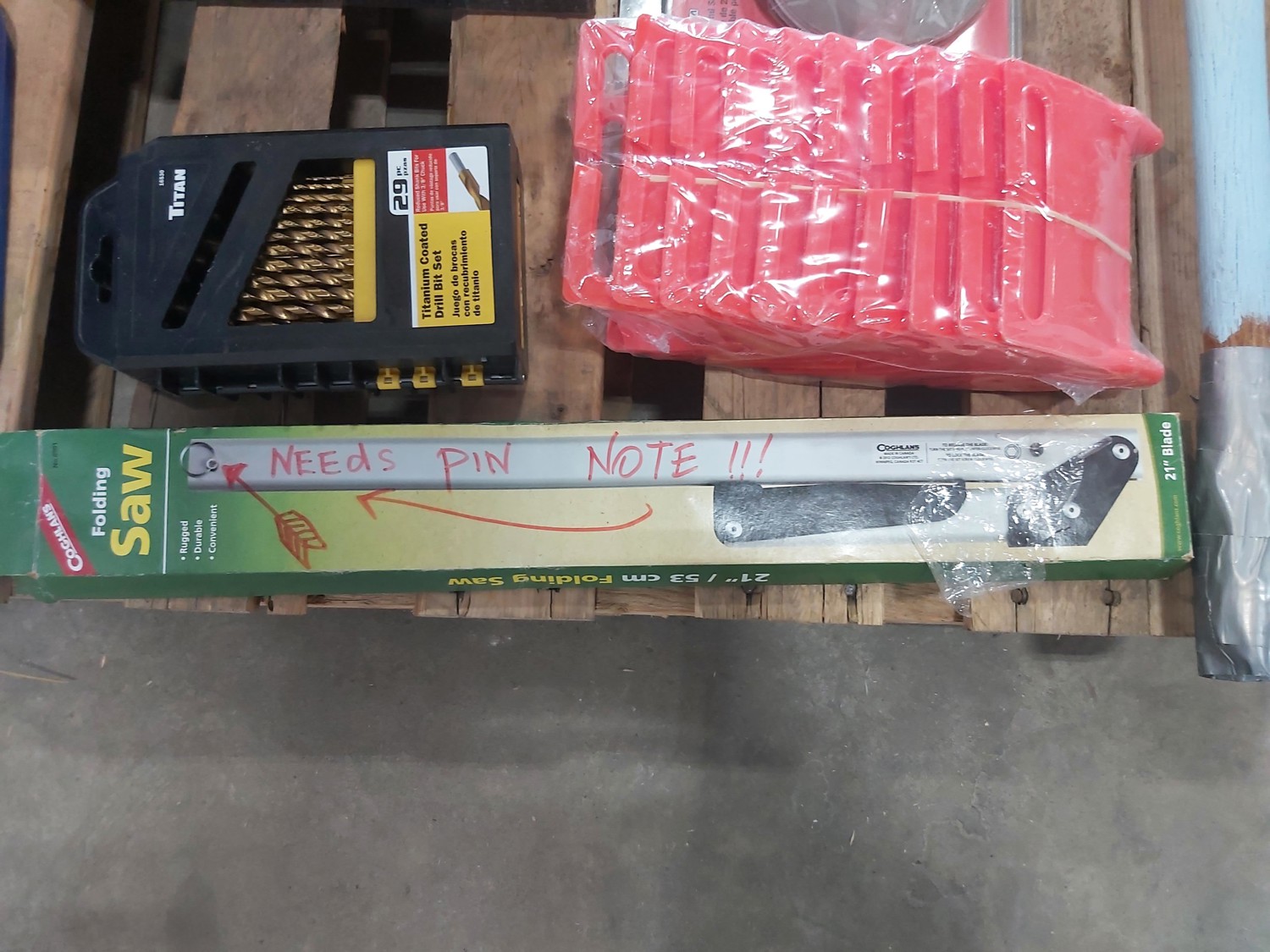 4 inch bench vise, 3-in-1 Magnesium air tool, 10 inch blade set, Titan drill bit set, dolly wheels, metal lunch box, corner web protectors, hardware