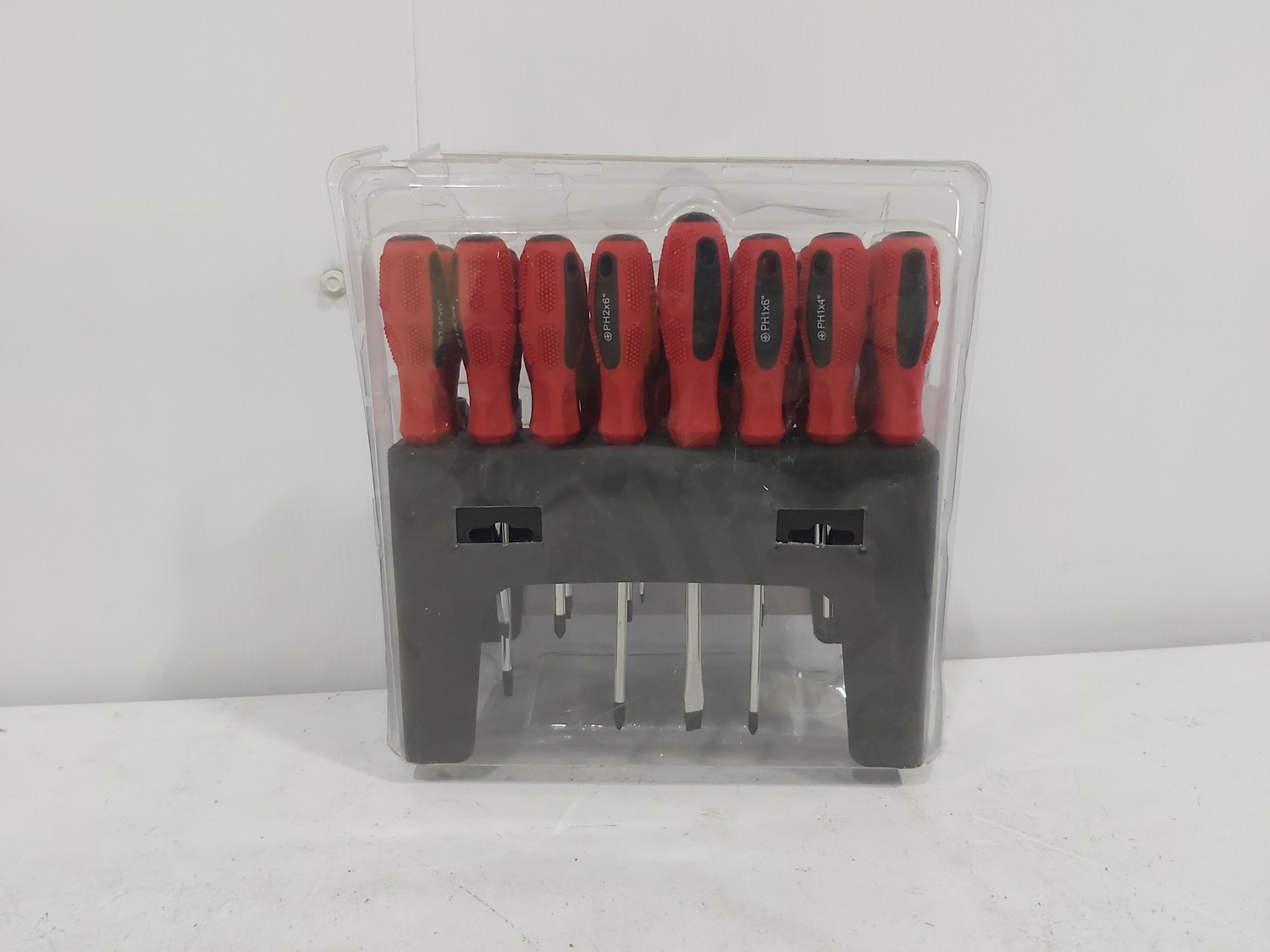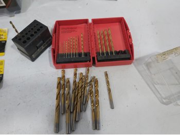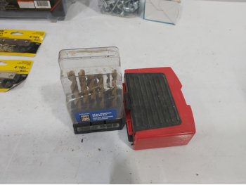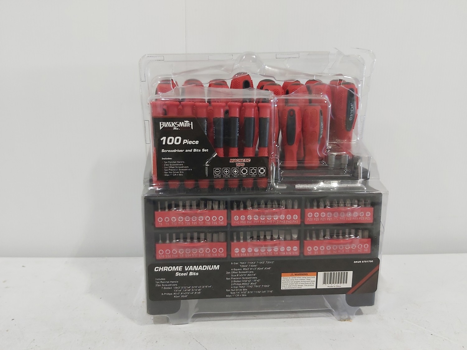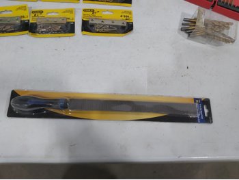 12 inch rasp, drill bits, wall anchors, Stanley mending plates, Mastercraft tool bag, mini claw hammer, mini ratchet, 100 piece Mr. Blacksmith screwdriver and bit set