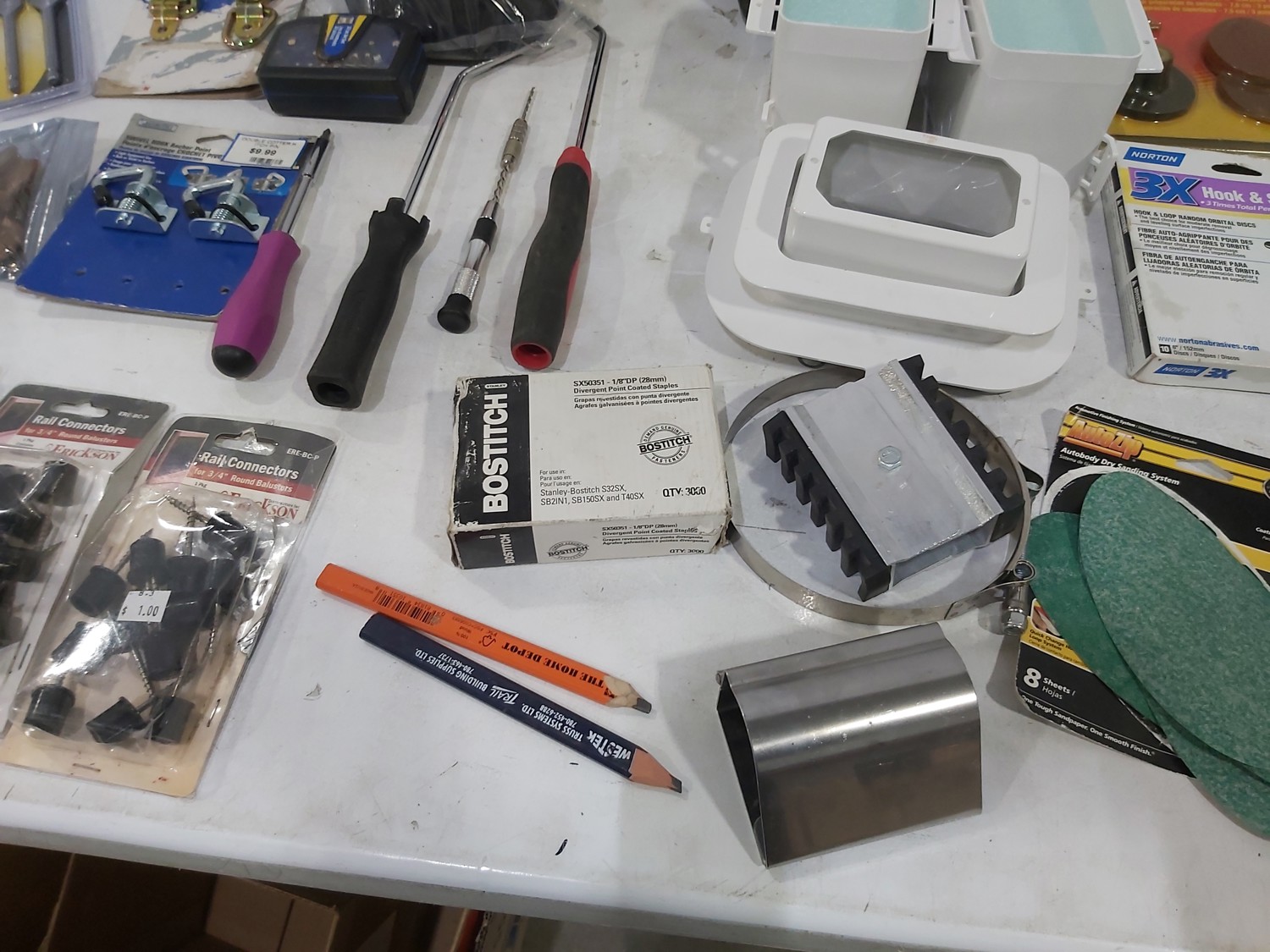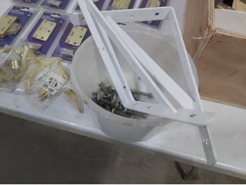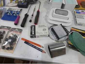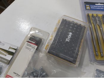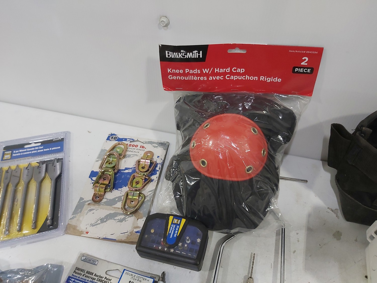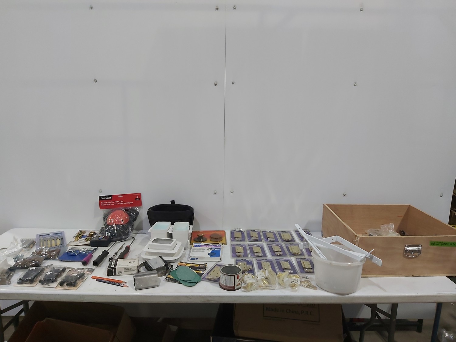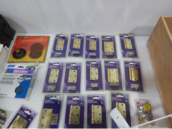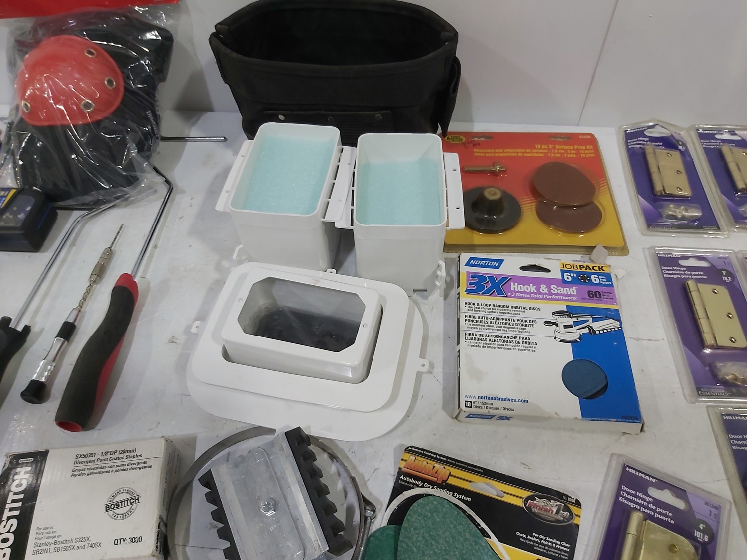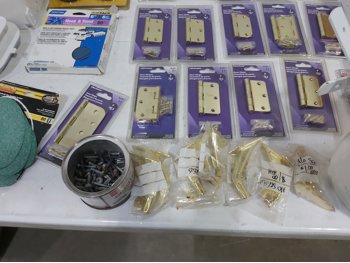3 inch door hinges, 4 inch door hinges, sanding discs, knee pads, hardware, tools