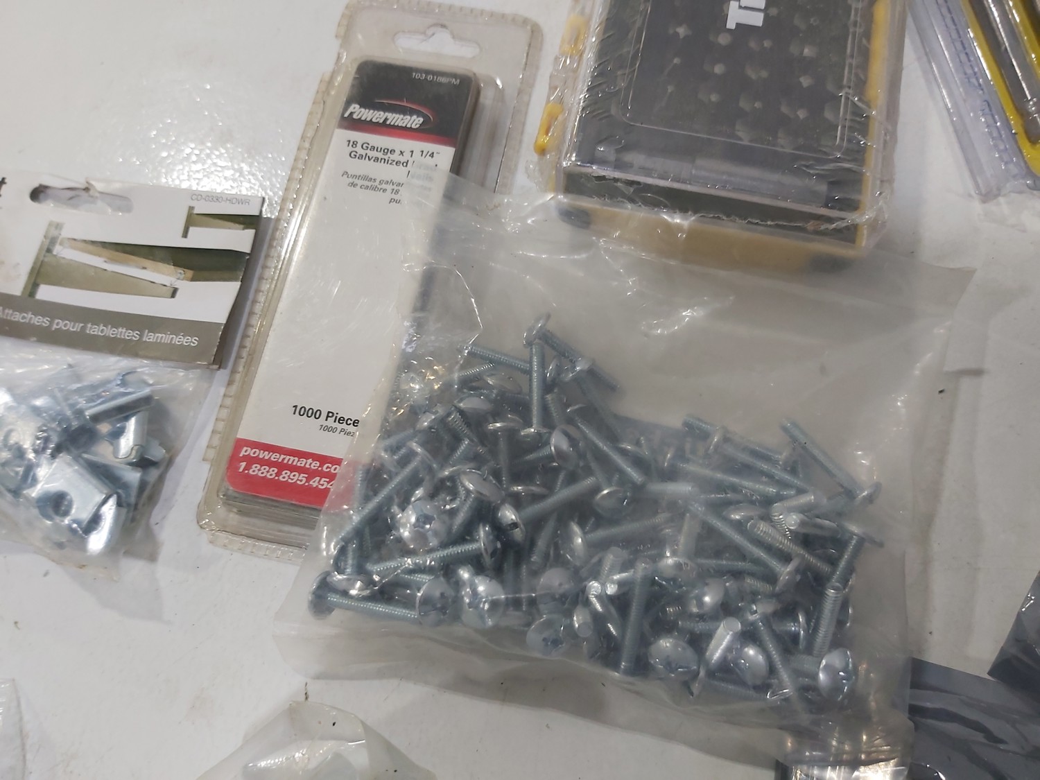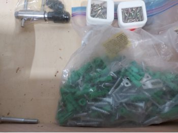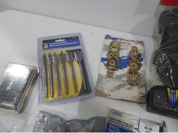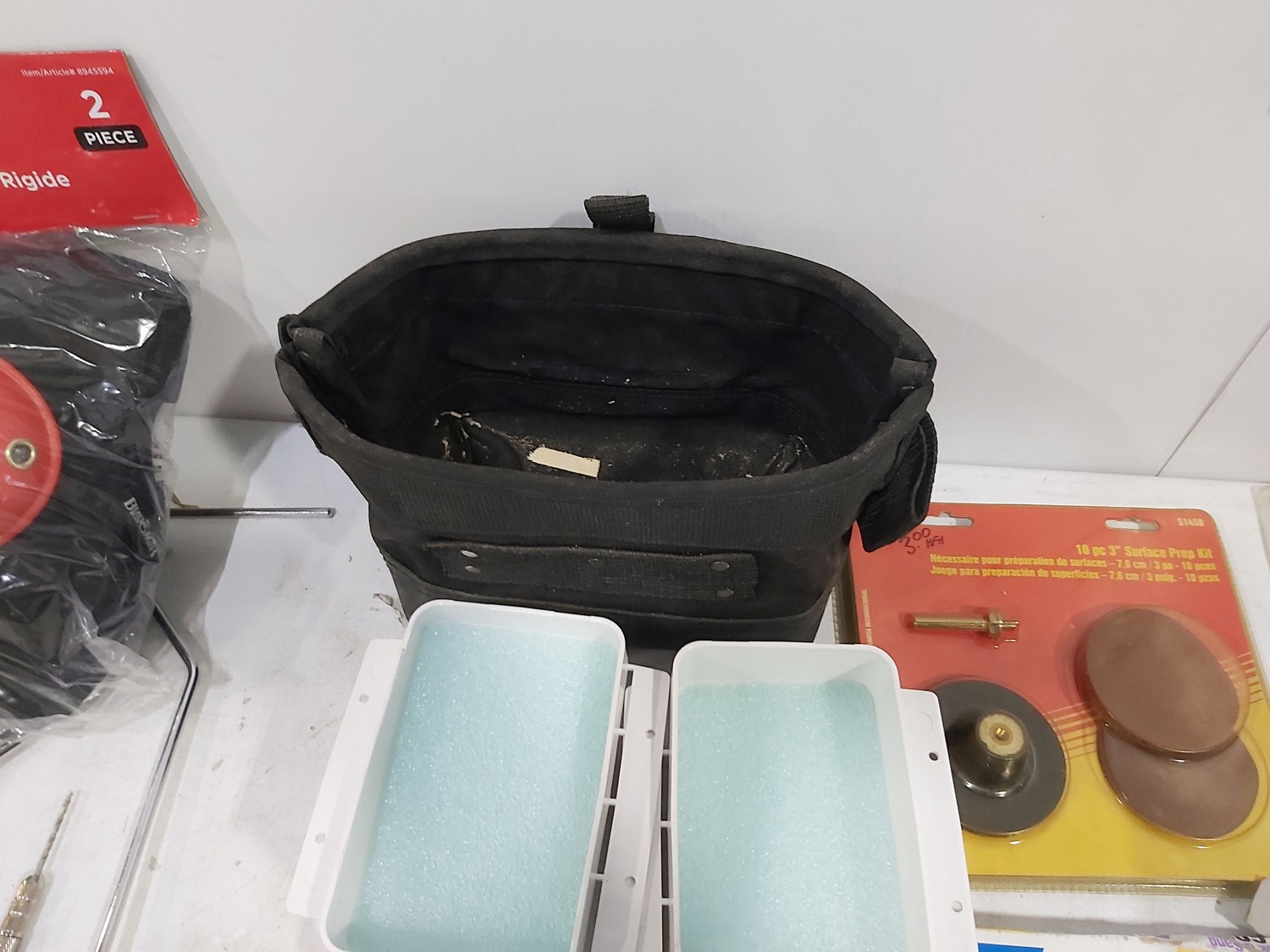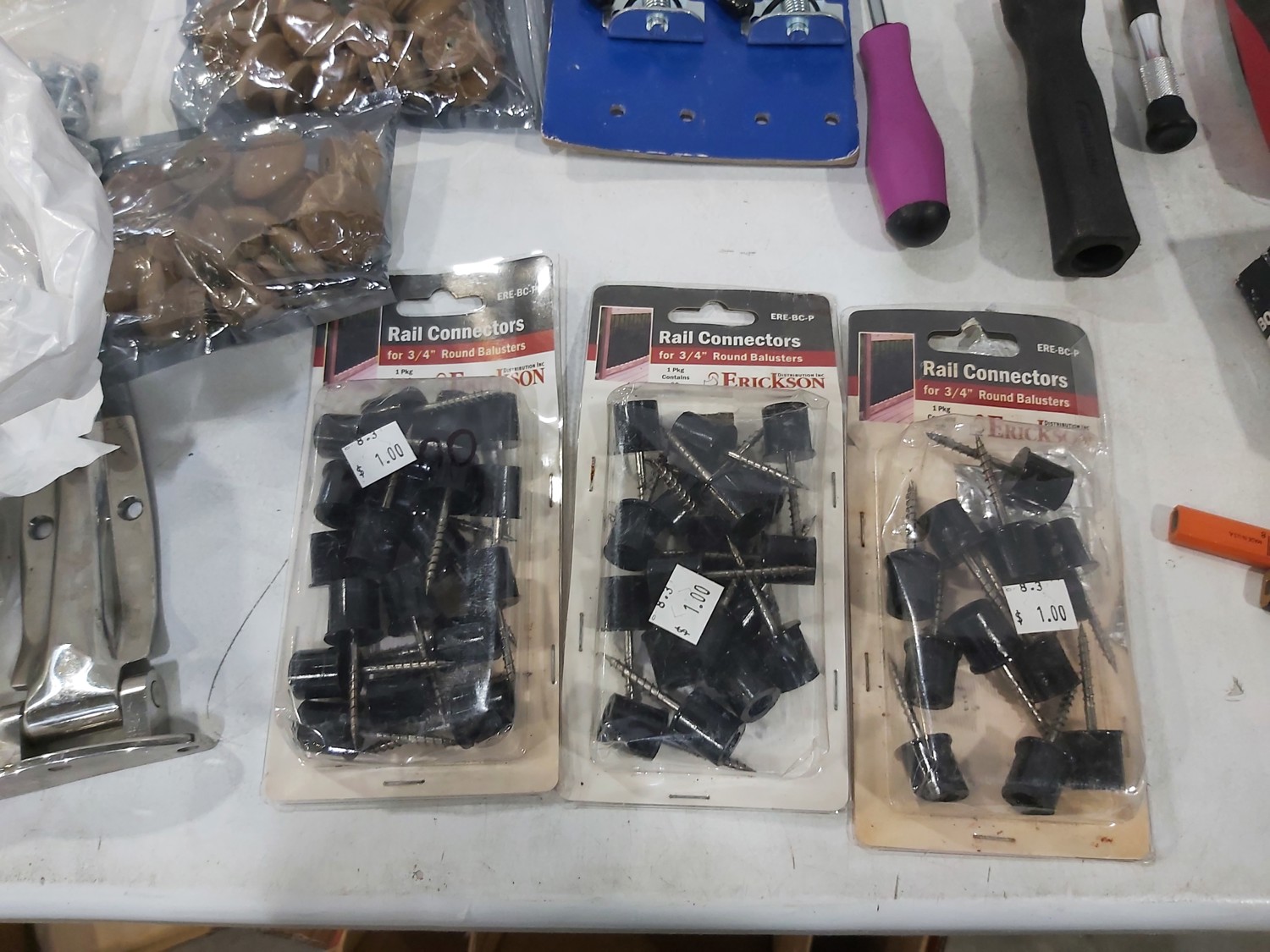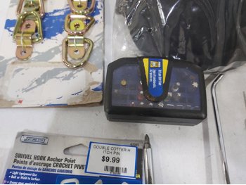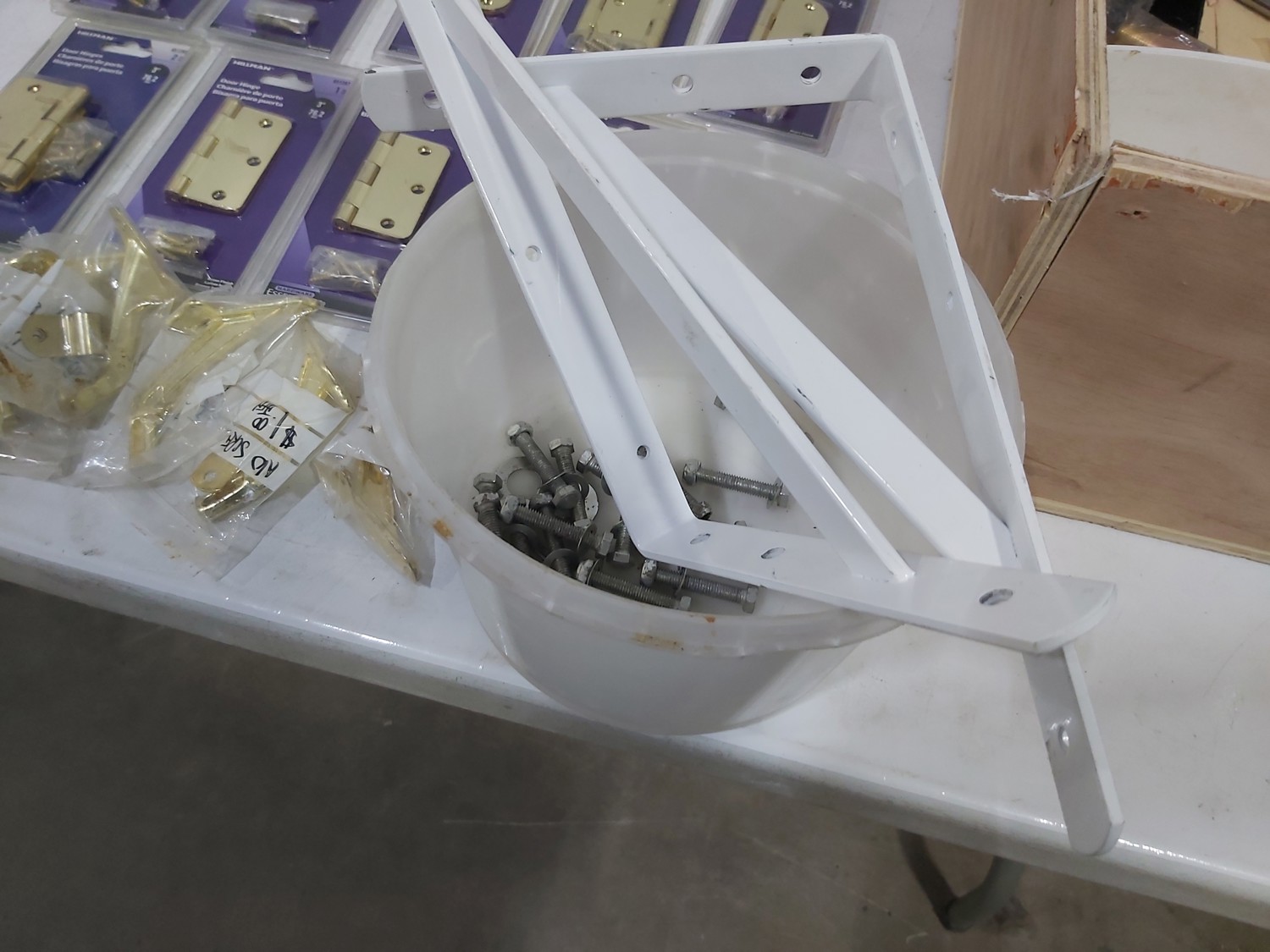 3 inch door hinges, 4 inch door hinges, sanding discs, knee pads, hardware, tools