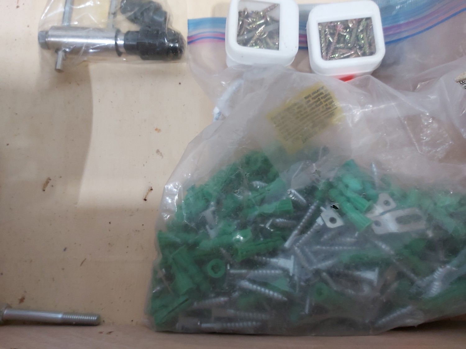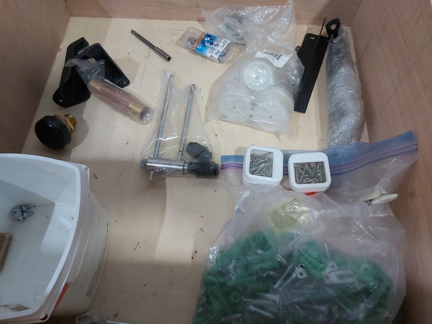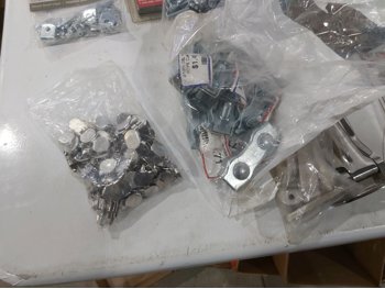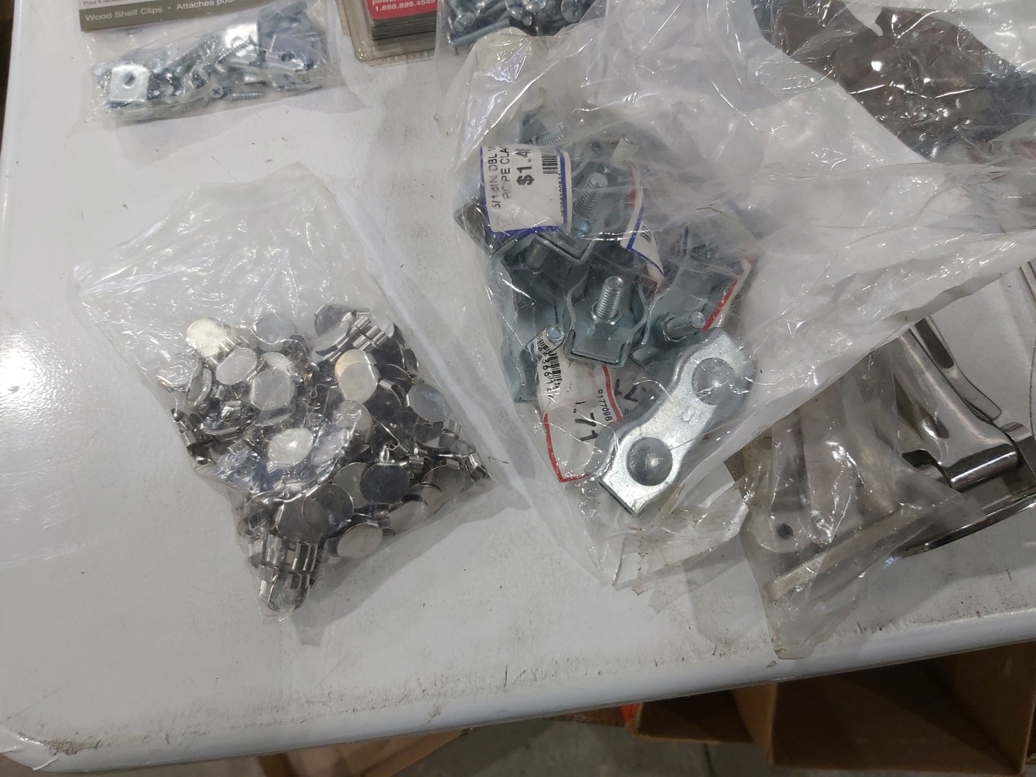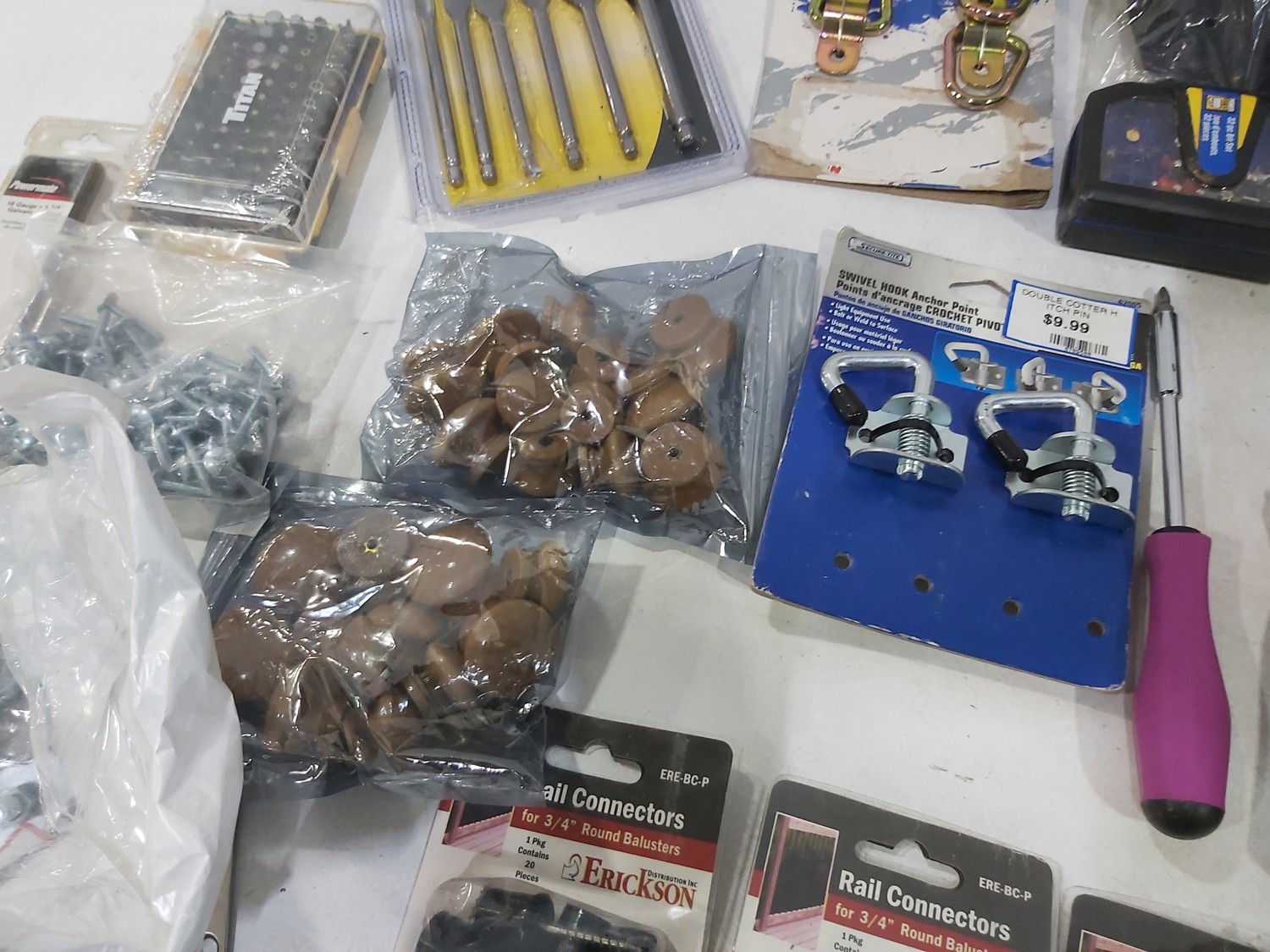 3 inch door hinges, 4 inch door hinges, sanding discs, knee pads, hardware, tools