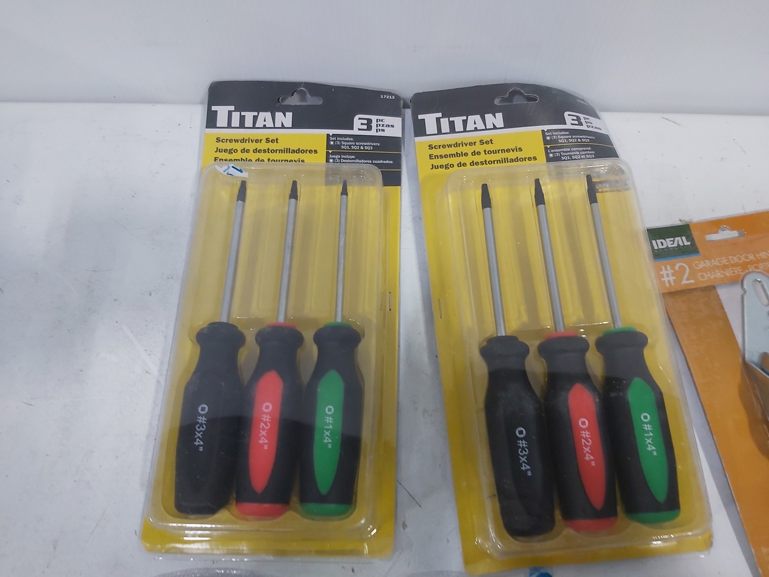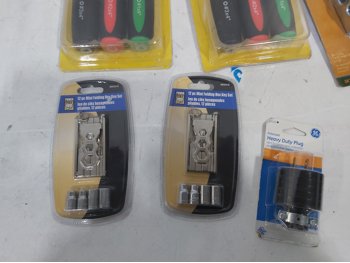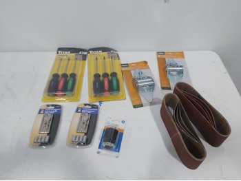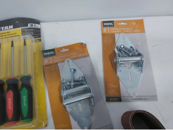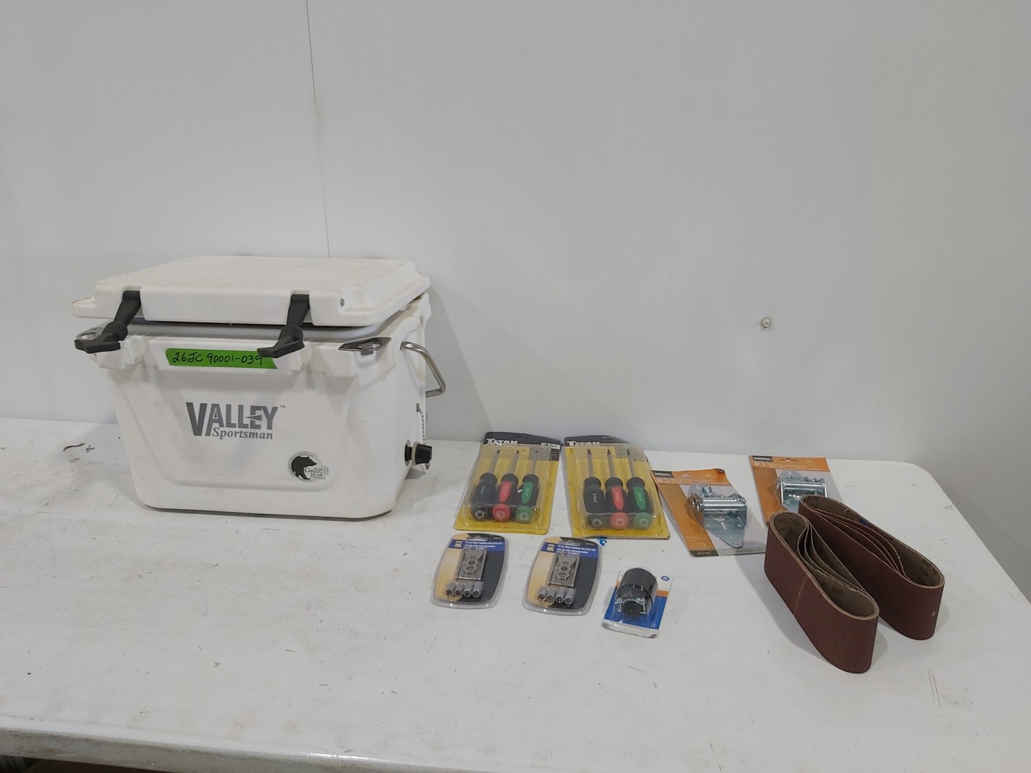 Valley Sportsman cooler 18 inch w x 13 inch d x 14 inch h, (2) Titan screwdriver sets, (2) Powerfist mini folding hex key sets, polarized heavy duty plug, (2) garage door hinges, (8) A80 sanding belts
