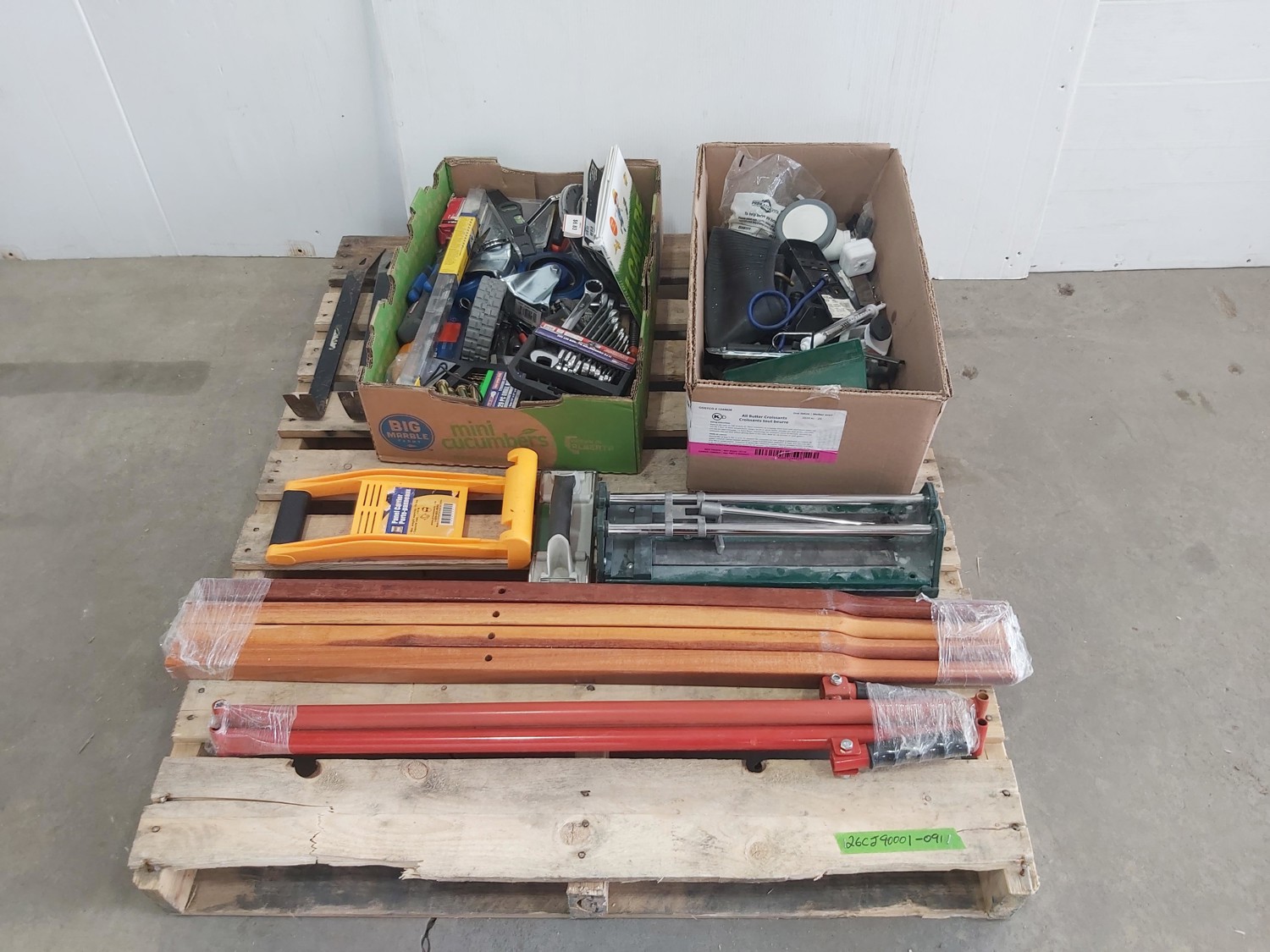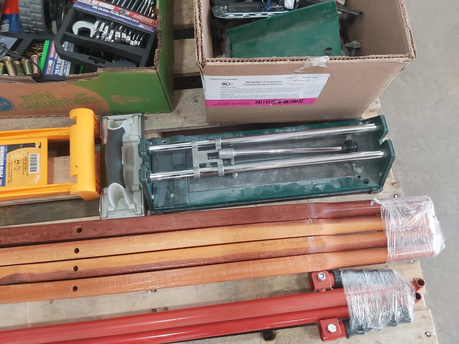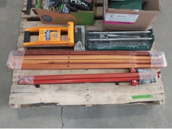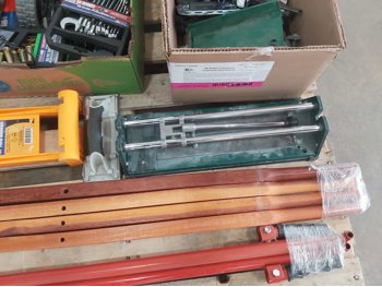 (4) wheelbarrow handles, panel carrier, tile cutter, (2) pry bars, 11 piece combination wrench set