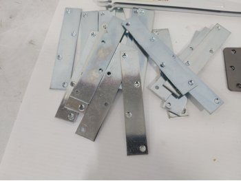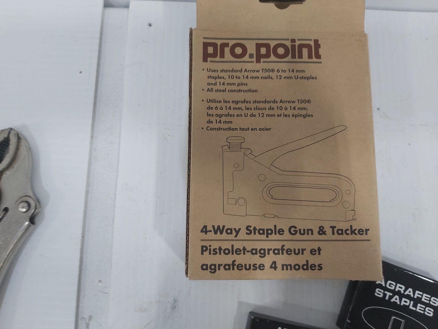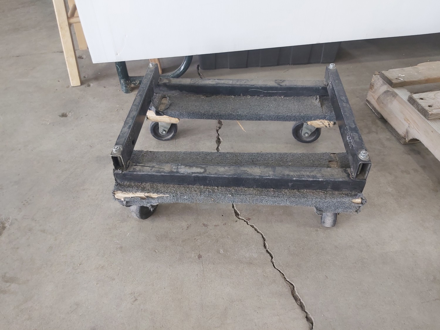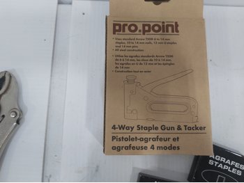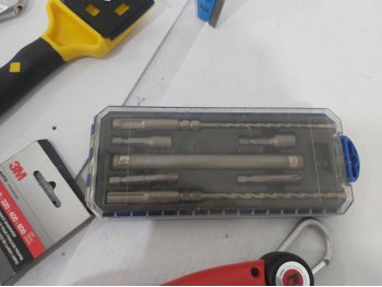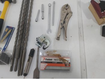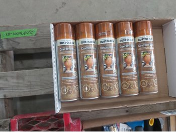 (5) Rust-Oleum concrete stain, dolly, wheeled bucket, 34 inch long metal step, Pro-point staple gun, (4) 18 inch quick attach concrete drill bits, hex set, (3) 12 inch brackets