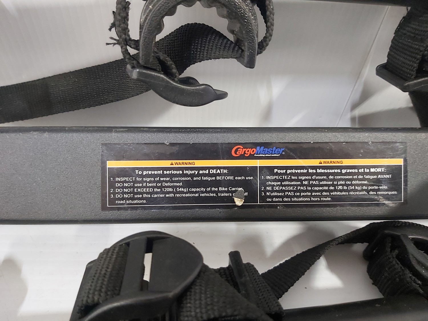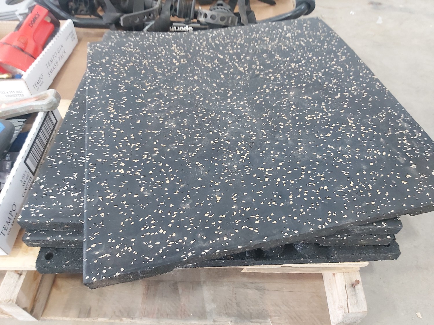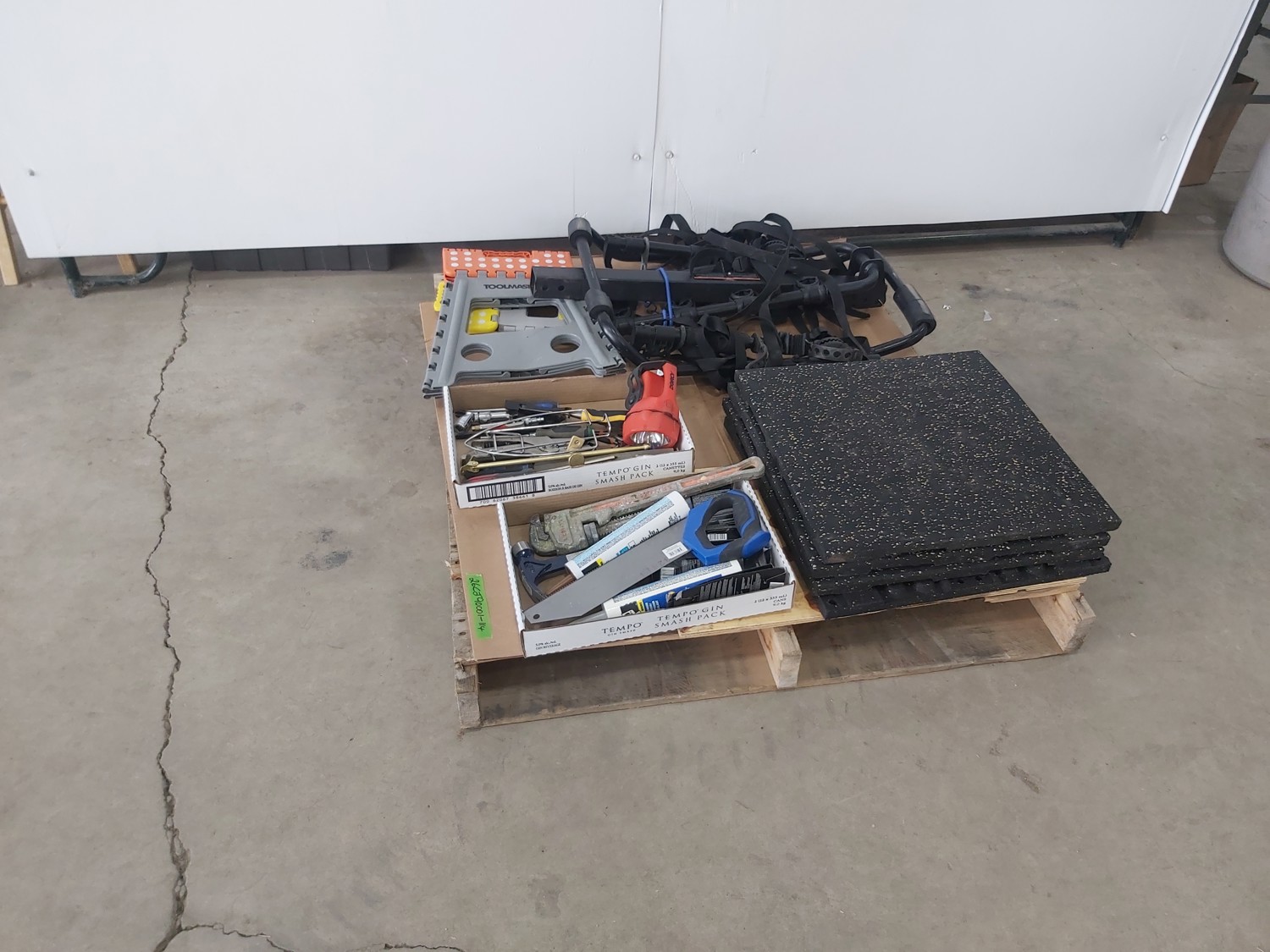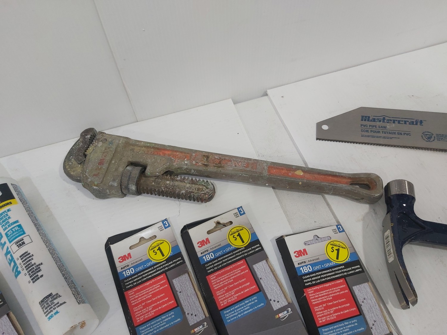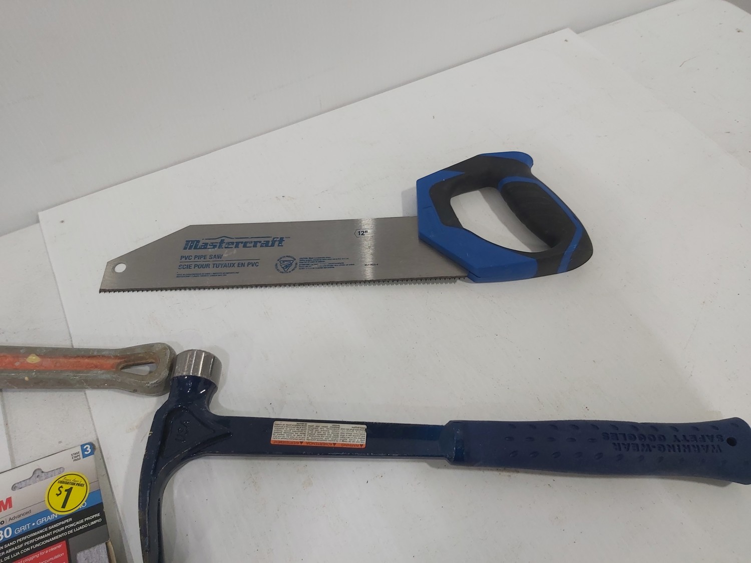 sand paper, 18 inch pipe wrench, PVC pipe saw, hammer, (4) 1 inch x 19-1/2 inch x 19-1/2 inch rubber mats, hand tools, (2) Toolmaster folding step stools, CargoMaster bike carrier