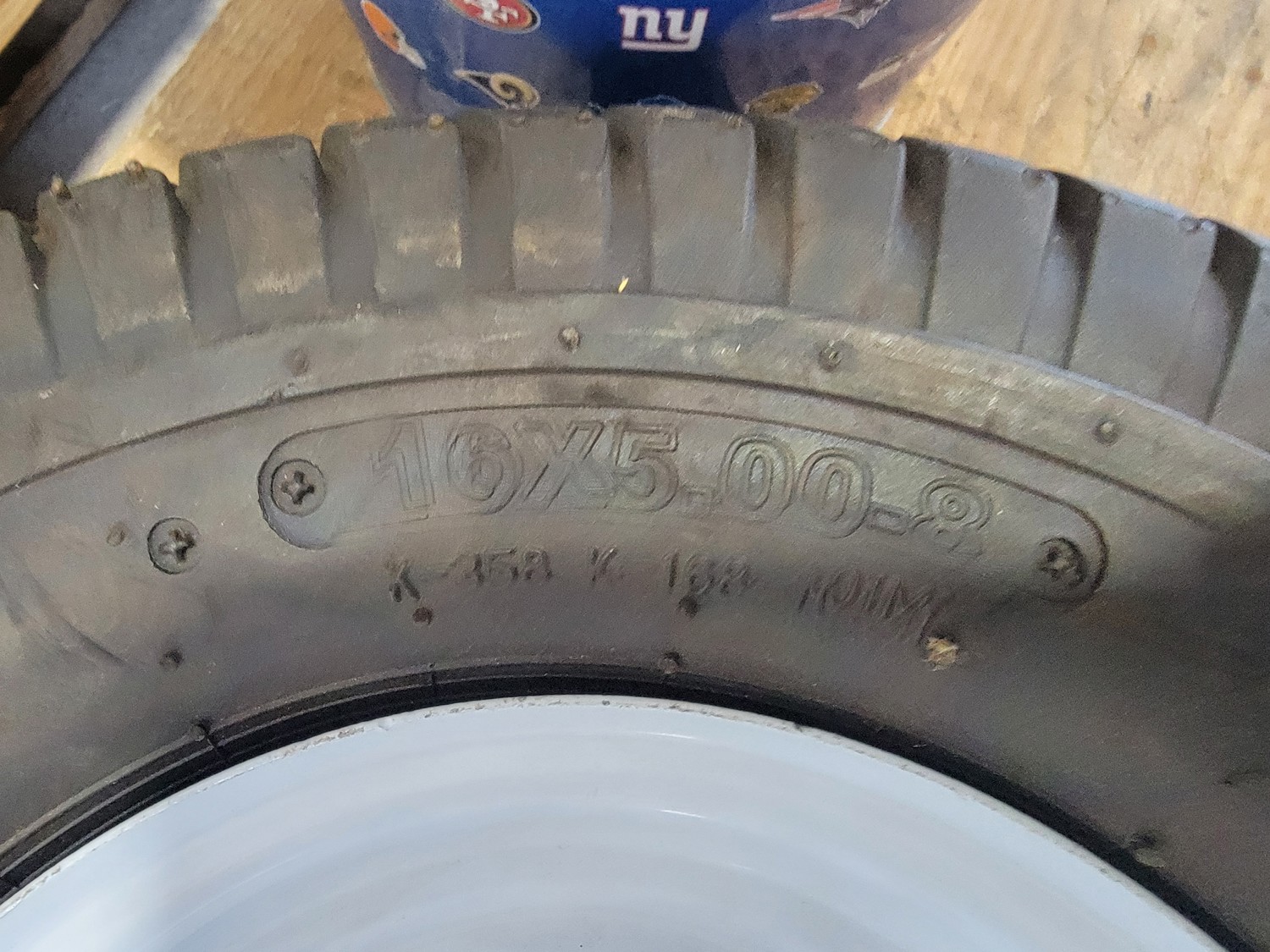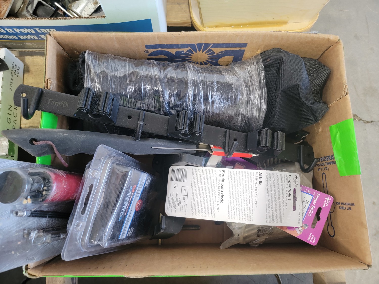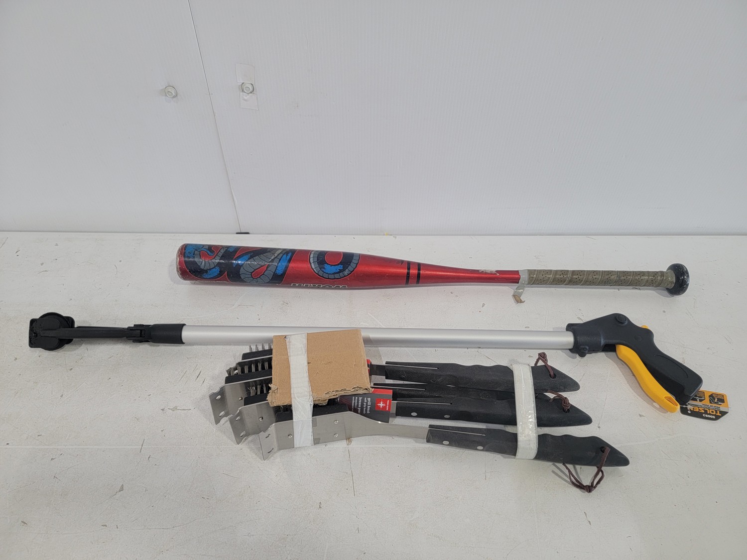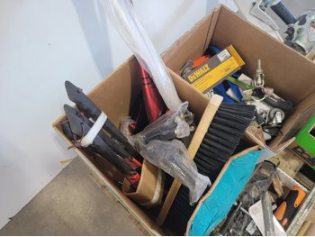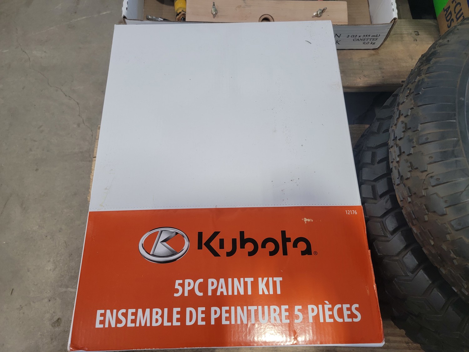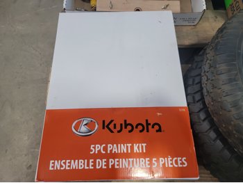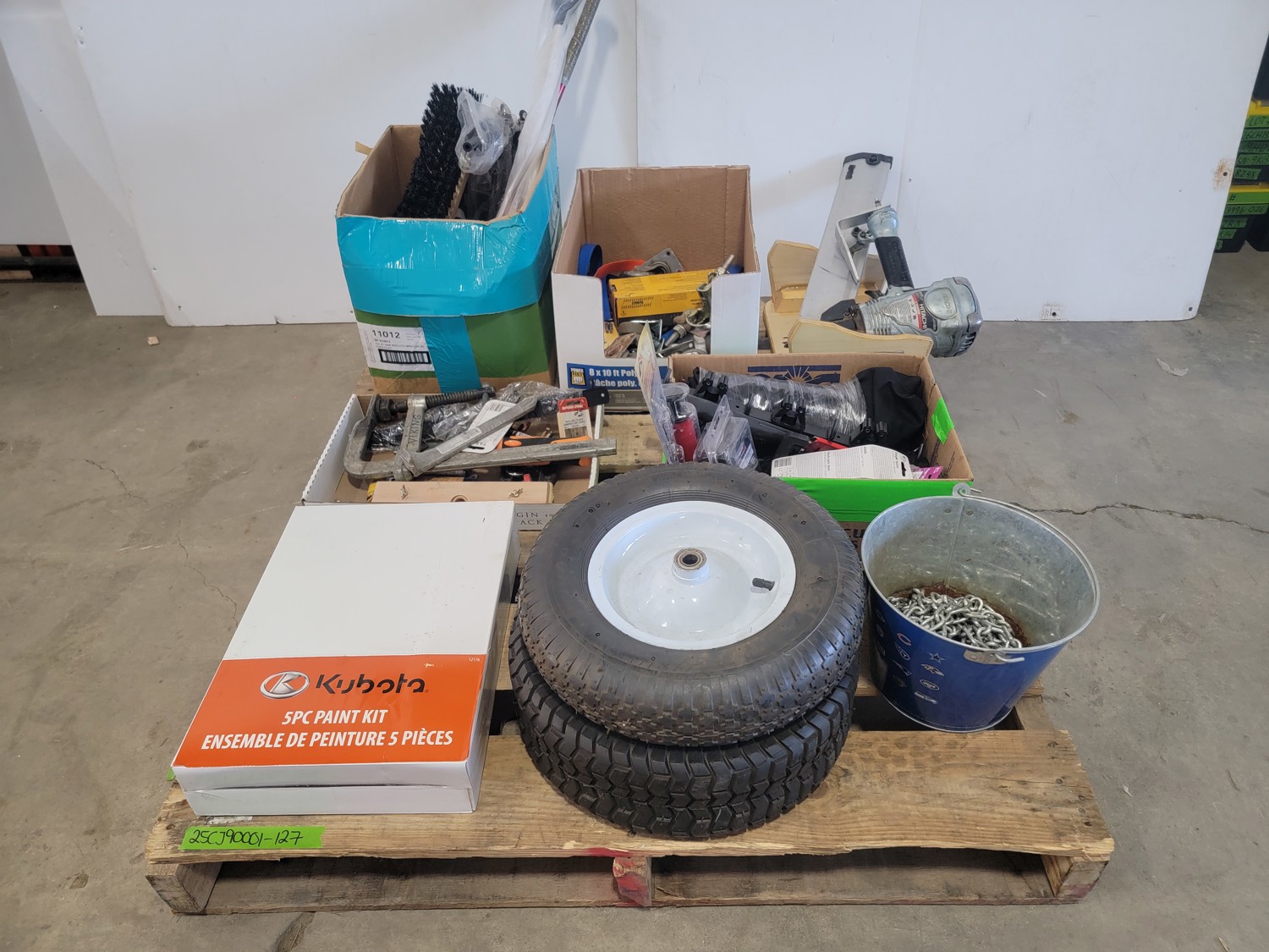 (1) 4.80/4.00-8 utility tire, (1) 16x5.00-8 utility tire, chains, Kubota 5 piece paint kit, air nailer, clamp, baseball bat, BBQ brushes, connector nails