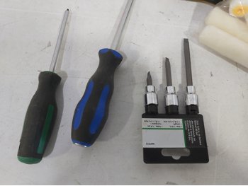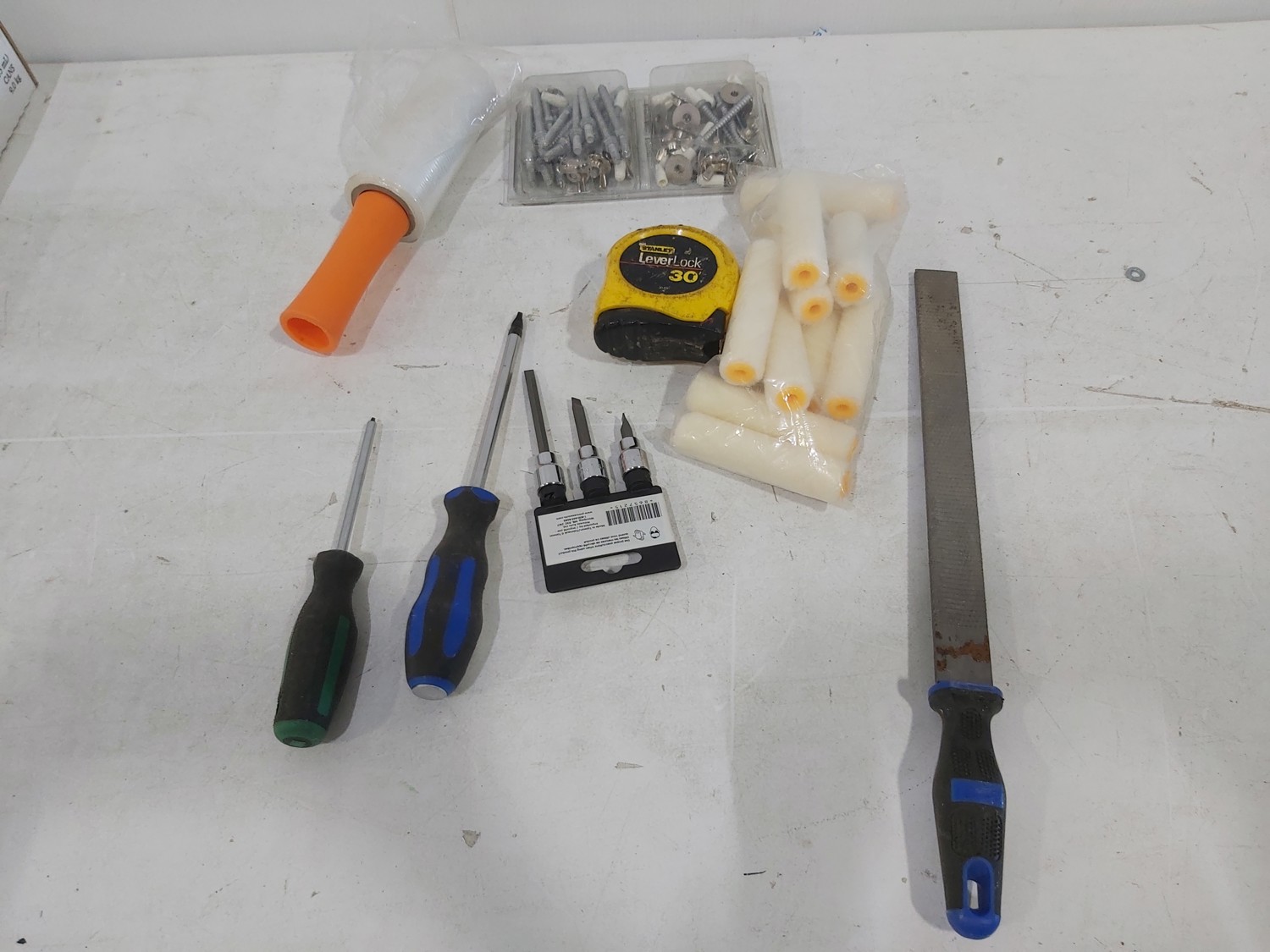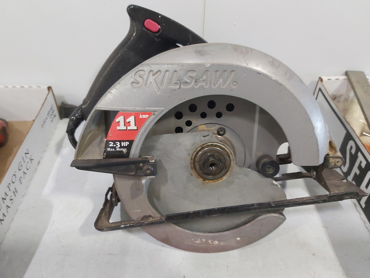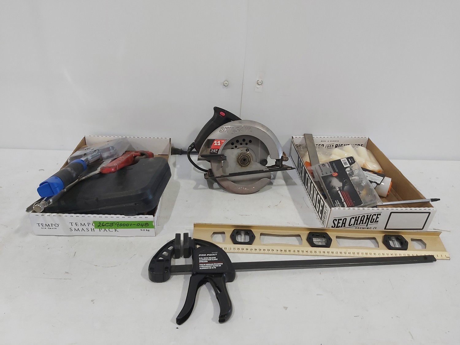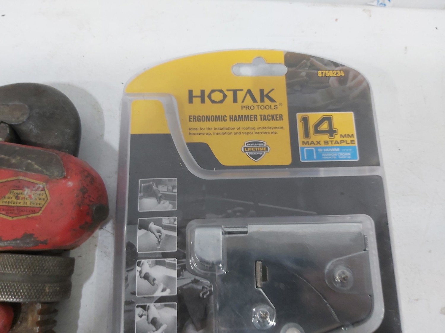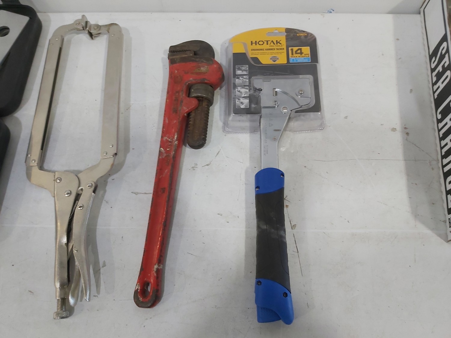 Skil 7-1/4 inch circular saw, Hotak ergonomic hammer tacker, 18 inch quick clamp, 24 inch level, 18 inch Ridgid pipe wrench, welding clamp