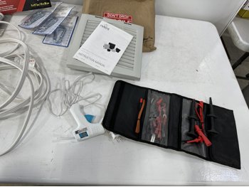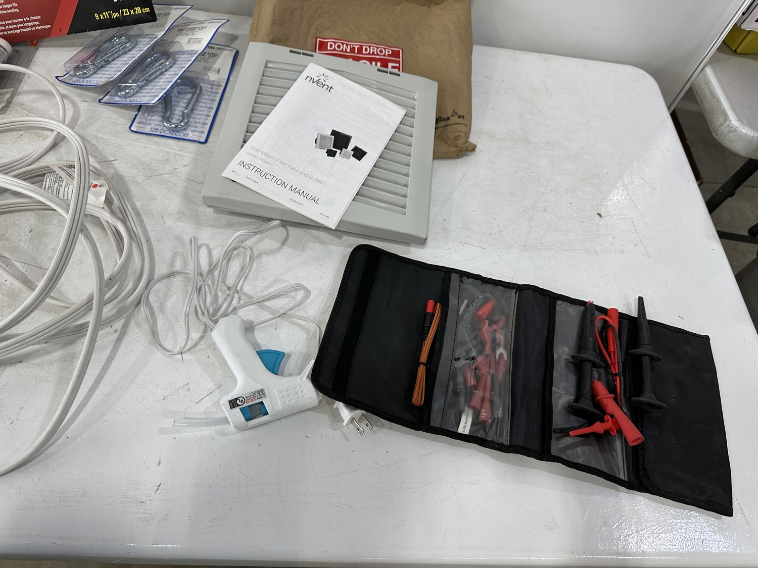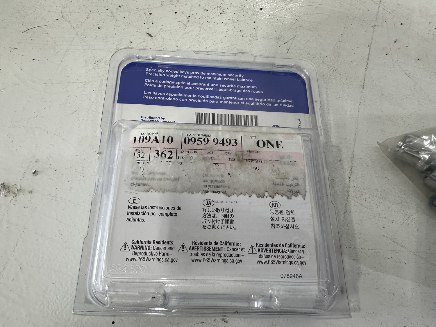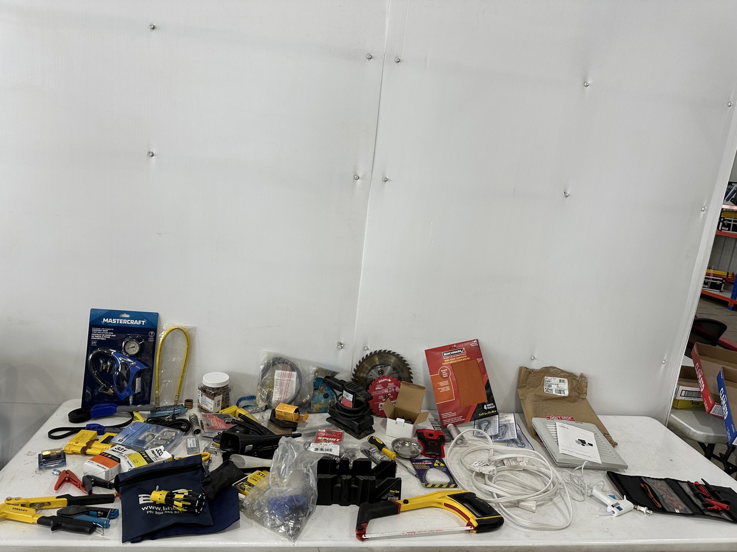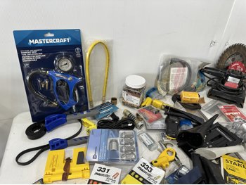 hand saw, tire inflation gun, marrettes, GM wheel locks, saw blades, sandpaper, snap hooks, deck screws