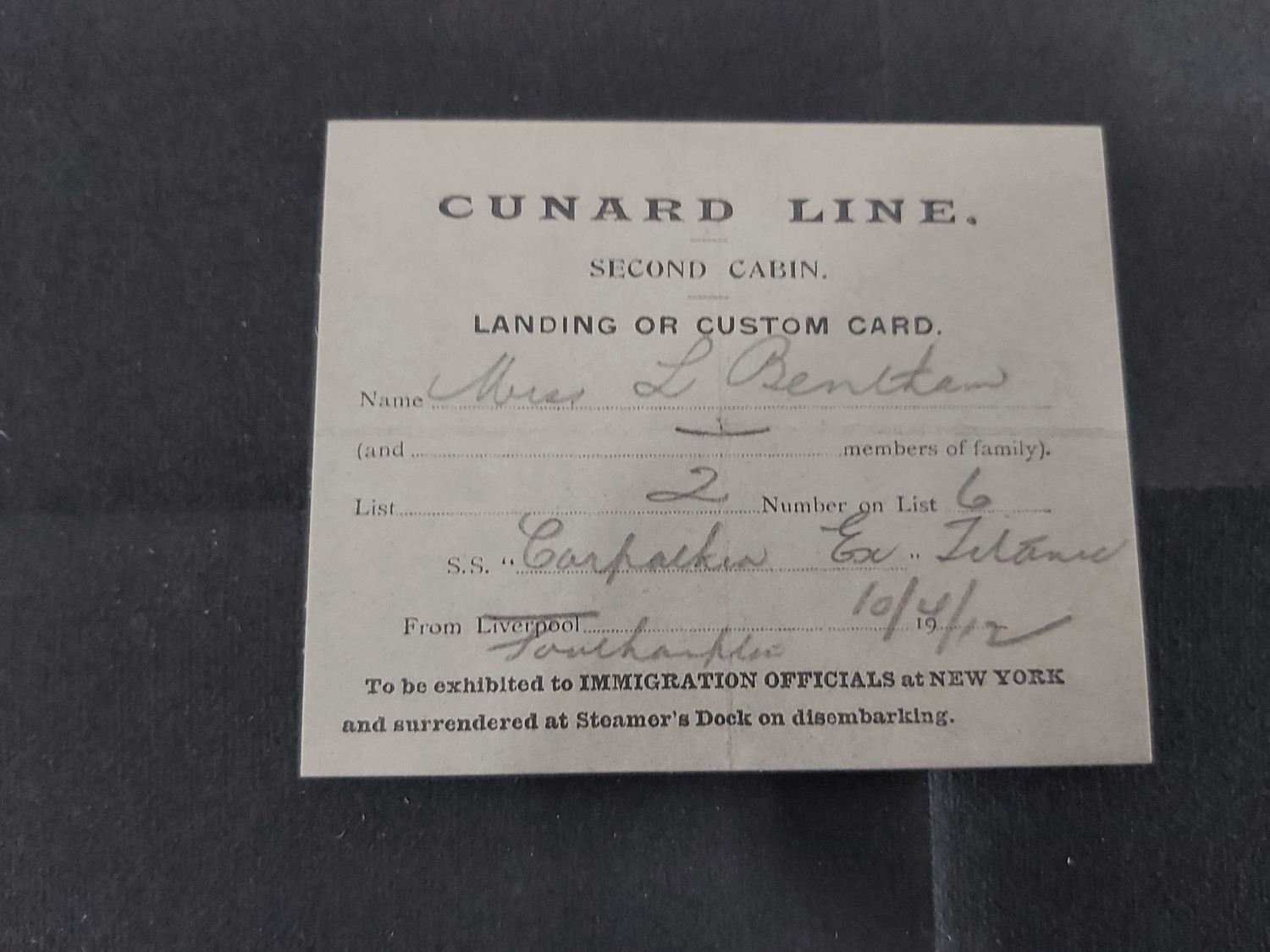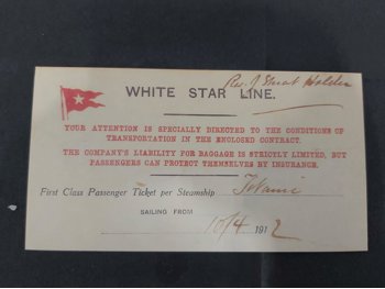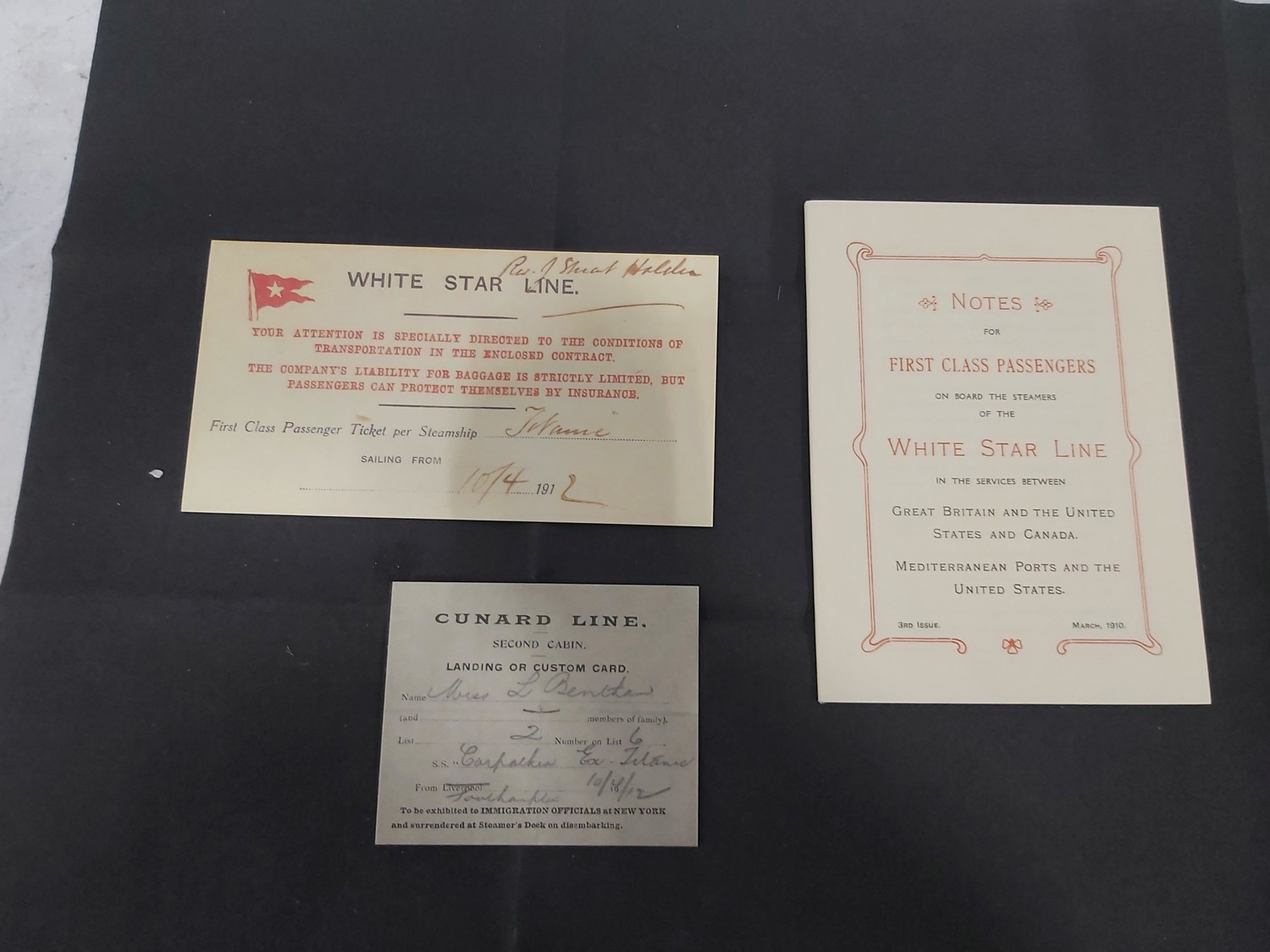 Titanic first class passenger ticket dated 10/4/1912. Titanic landing or custom ticket dated 10/4/1912. White Star Line first class passengers cruise notes