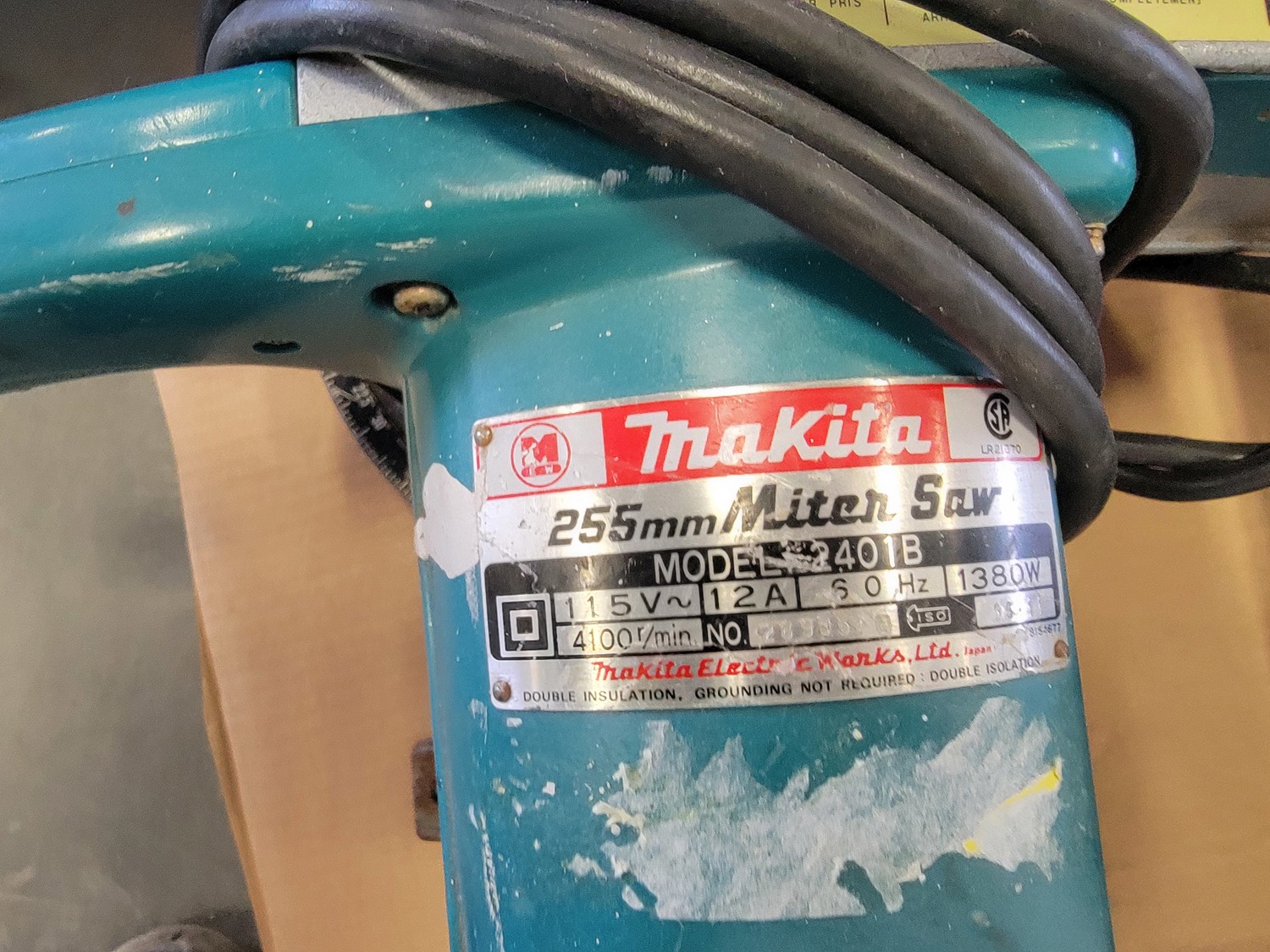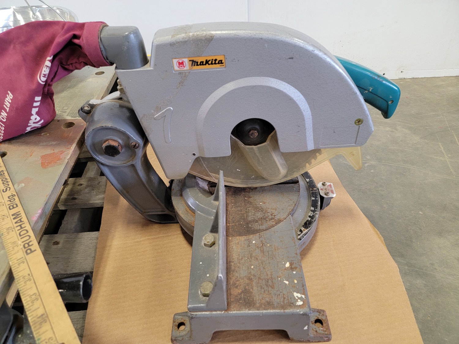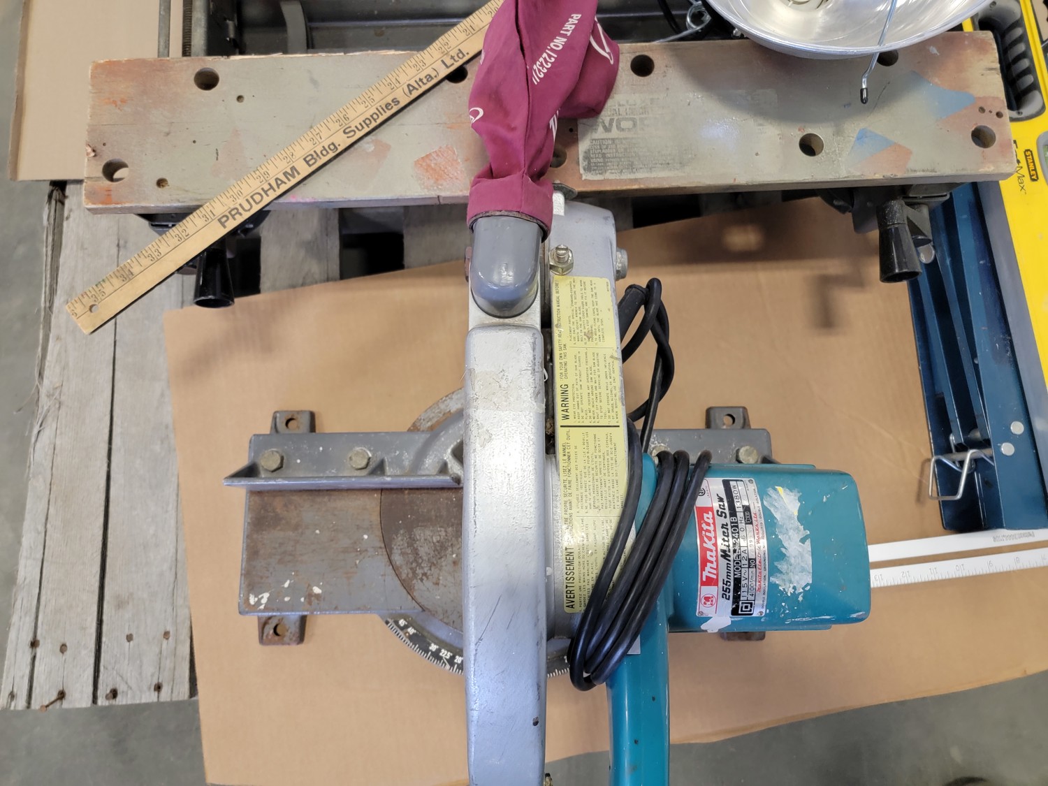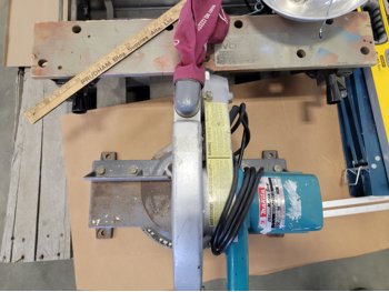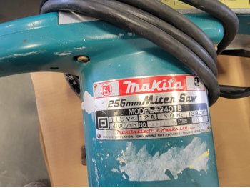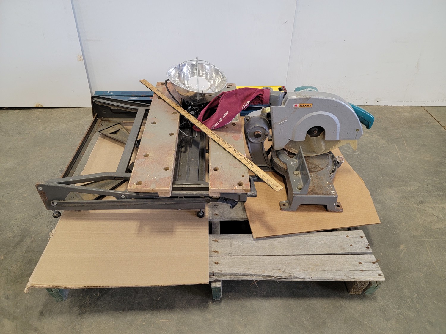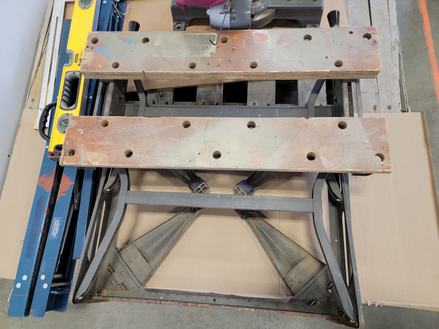 Folding Work Bench, Makita Miter Saw, Level and (2) Saw Horses
