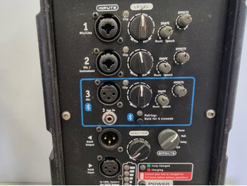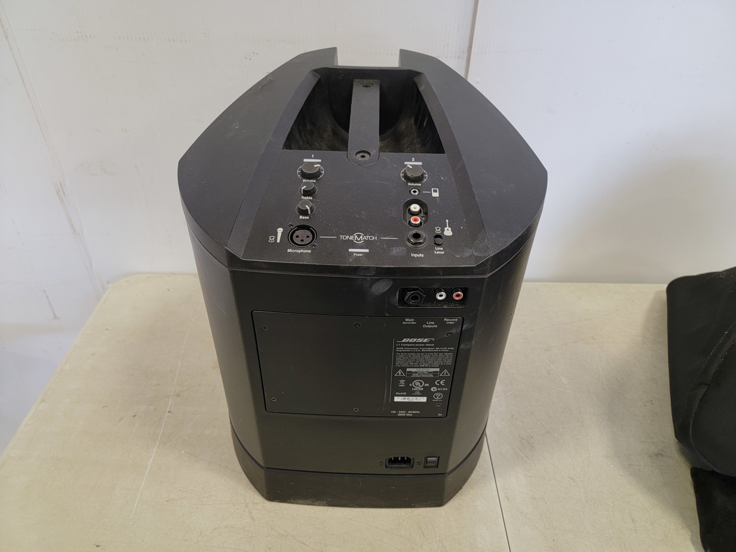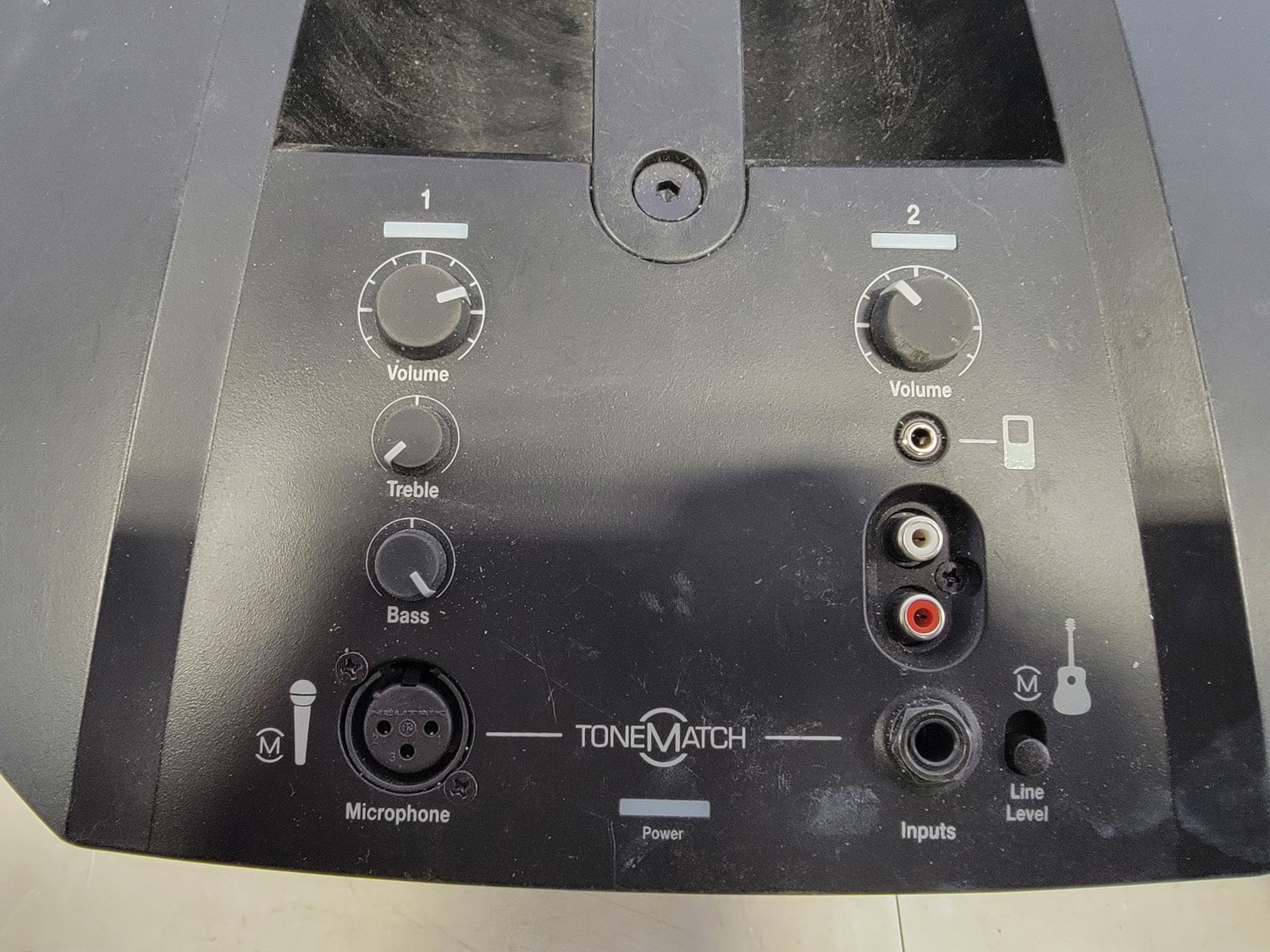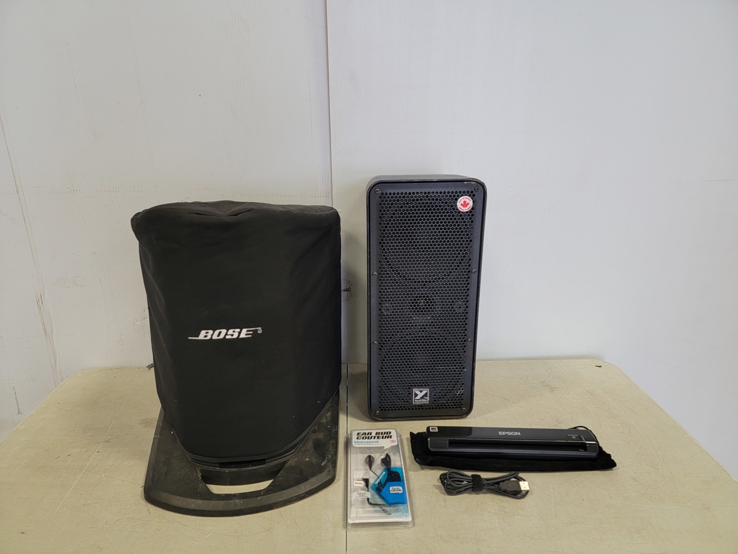 Epson portable scanner, earbuds, Bose compact power stand, Yorkville EXM mobile