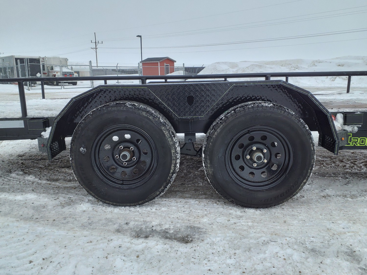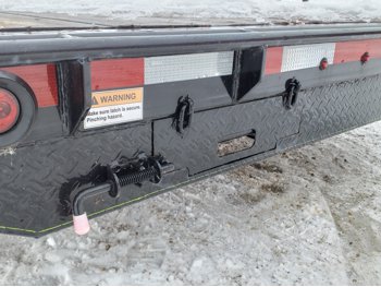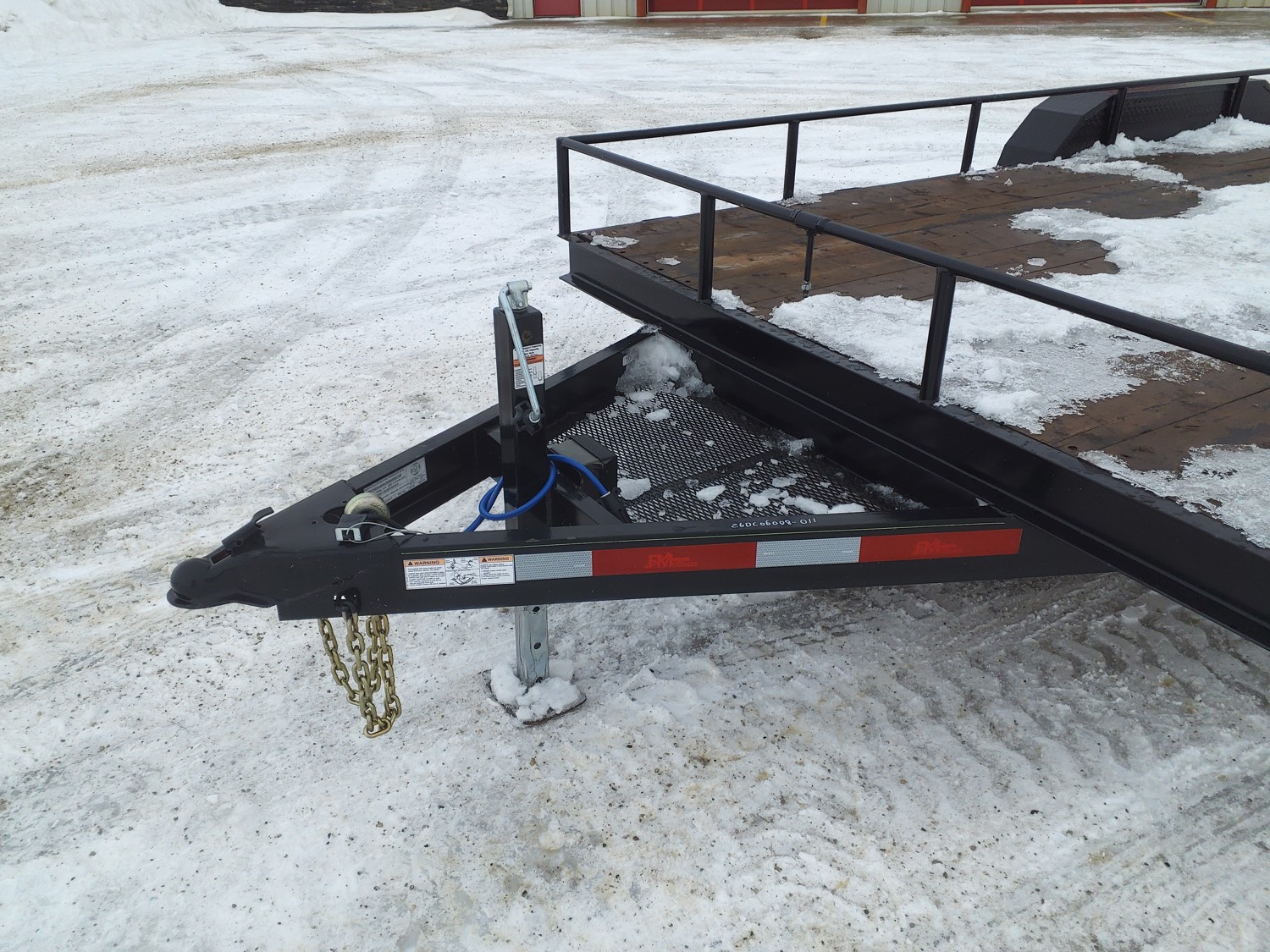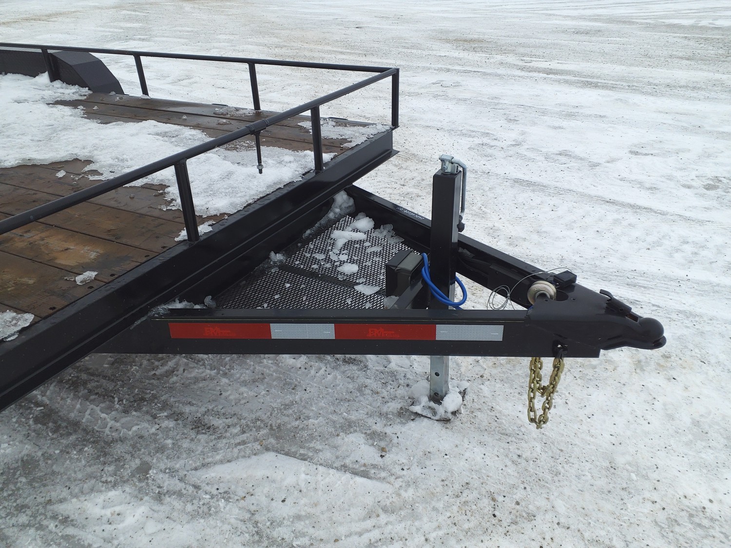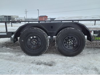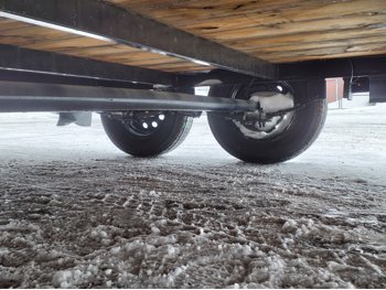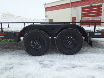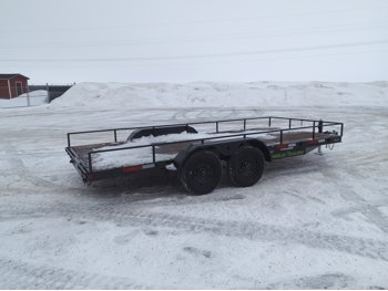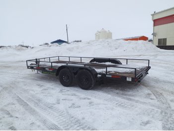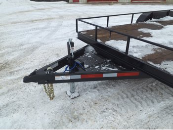 84 inch wide deck, wood deck, slide in ramps, spring suspension, 2-5/16 inch ball hitch, stake pockets, 3500 lb axles, 205/75R15 tires