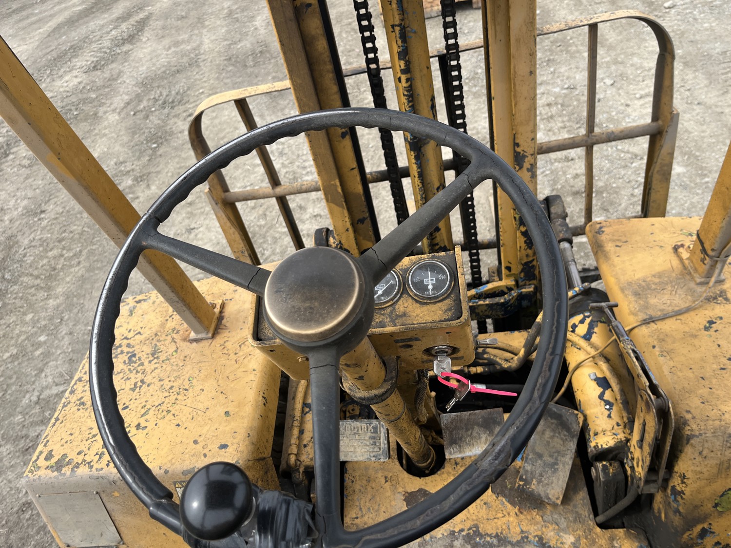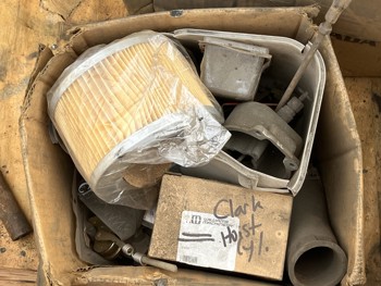 diesel, 2 speed manual transmission, additional parts in box including new roller chains, 7 ft lowered mast height, 14 ft max lift height, 1 mast stages, 48 inch pallet forks, 8-17.5LT front tires, 8R17.5LT rear tires