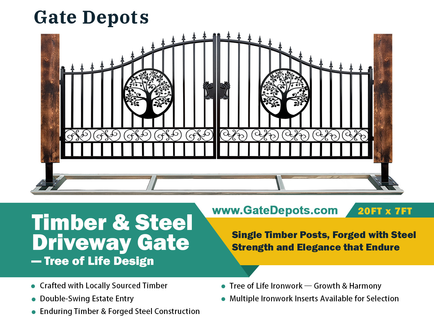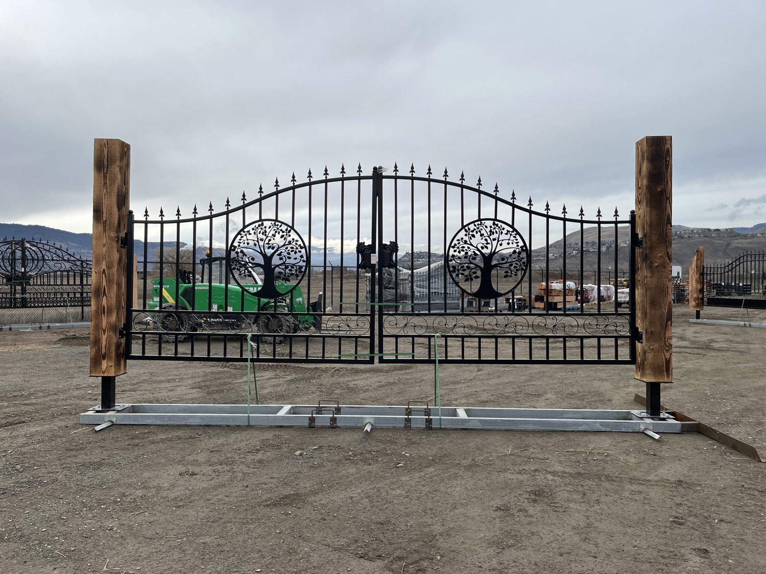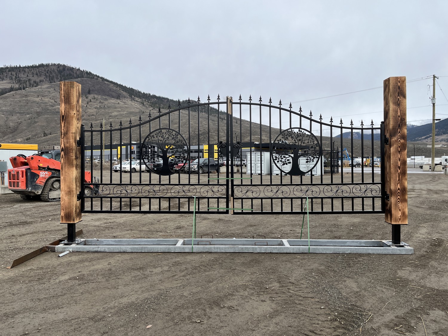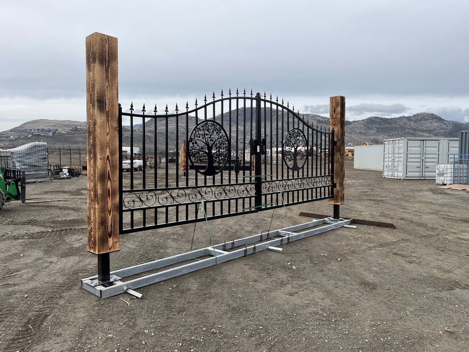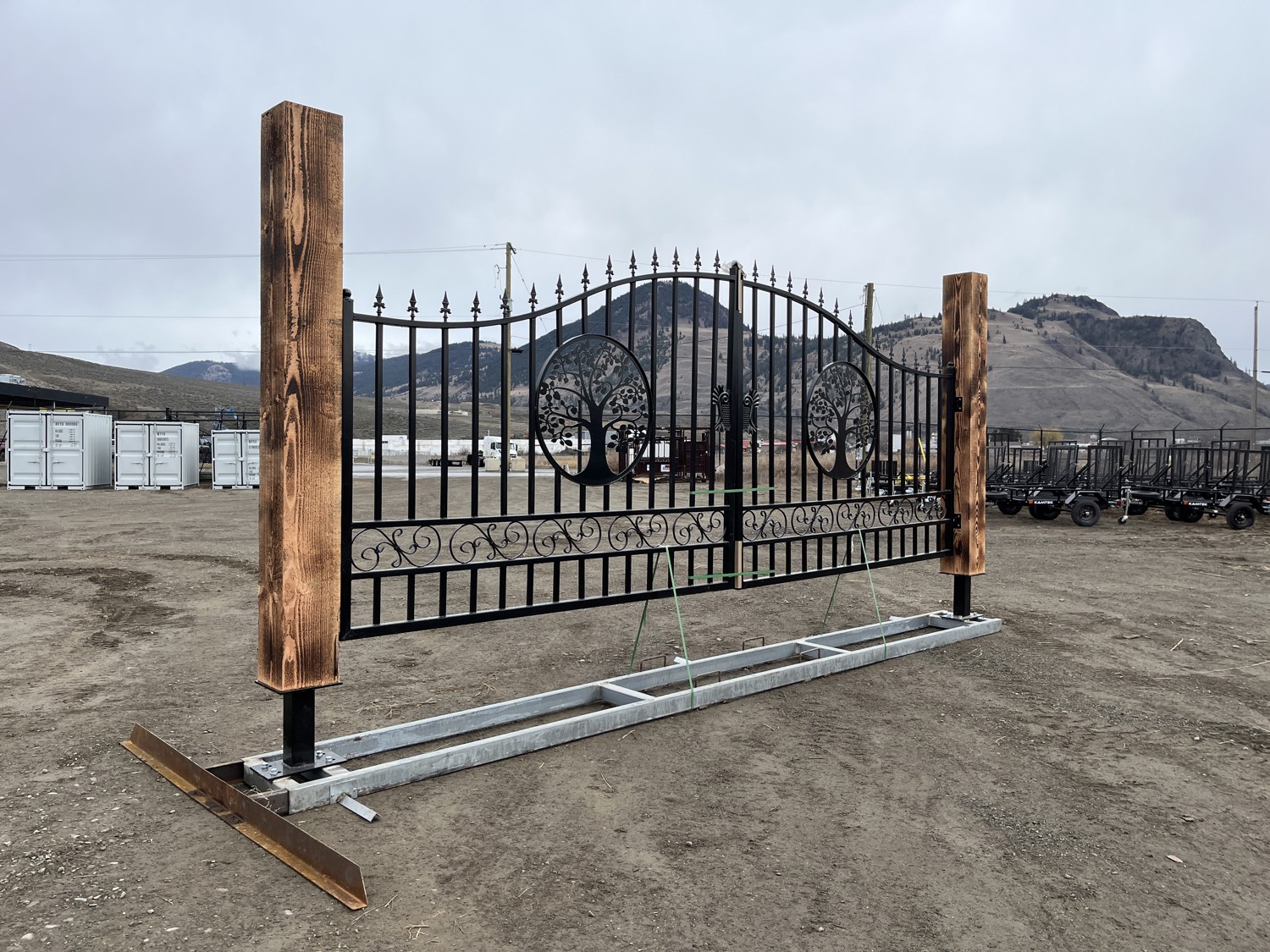 Premium BC Douglas Fir single burned finish timber posts, forged steel construction, tree of life design, 17 ft 6 inches gate opening, 20 ft x 7 ft total length