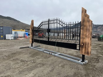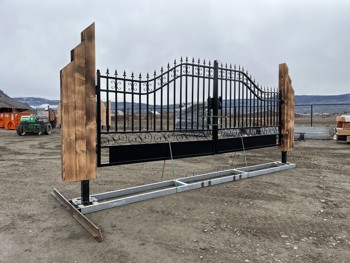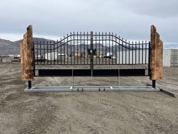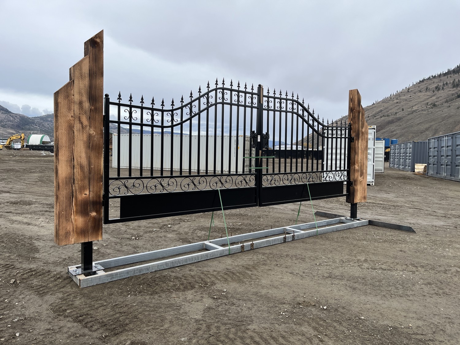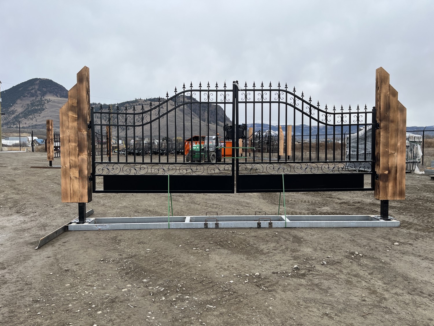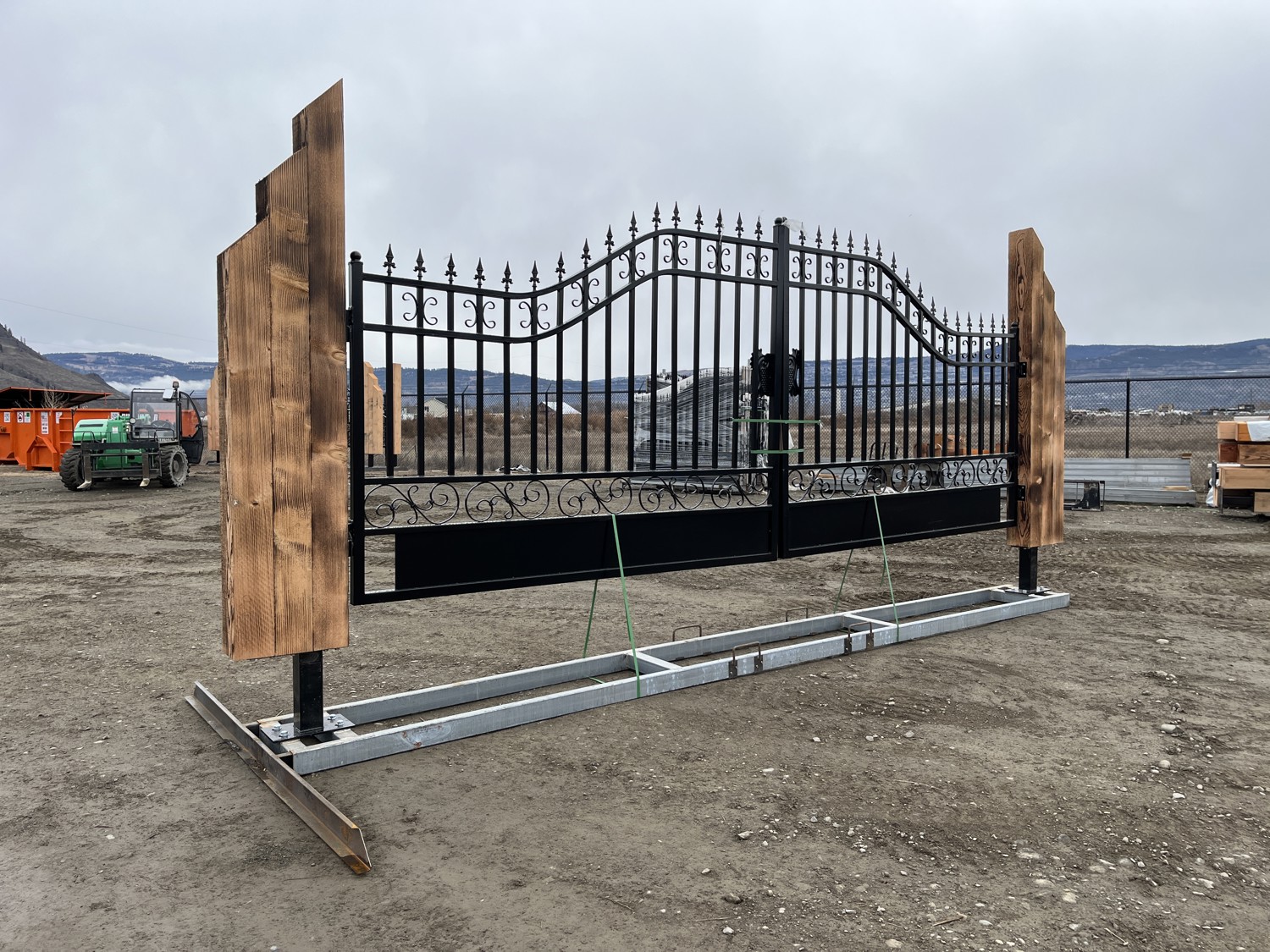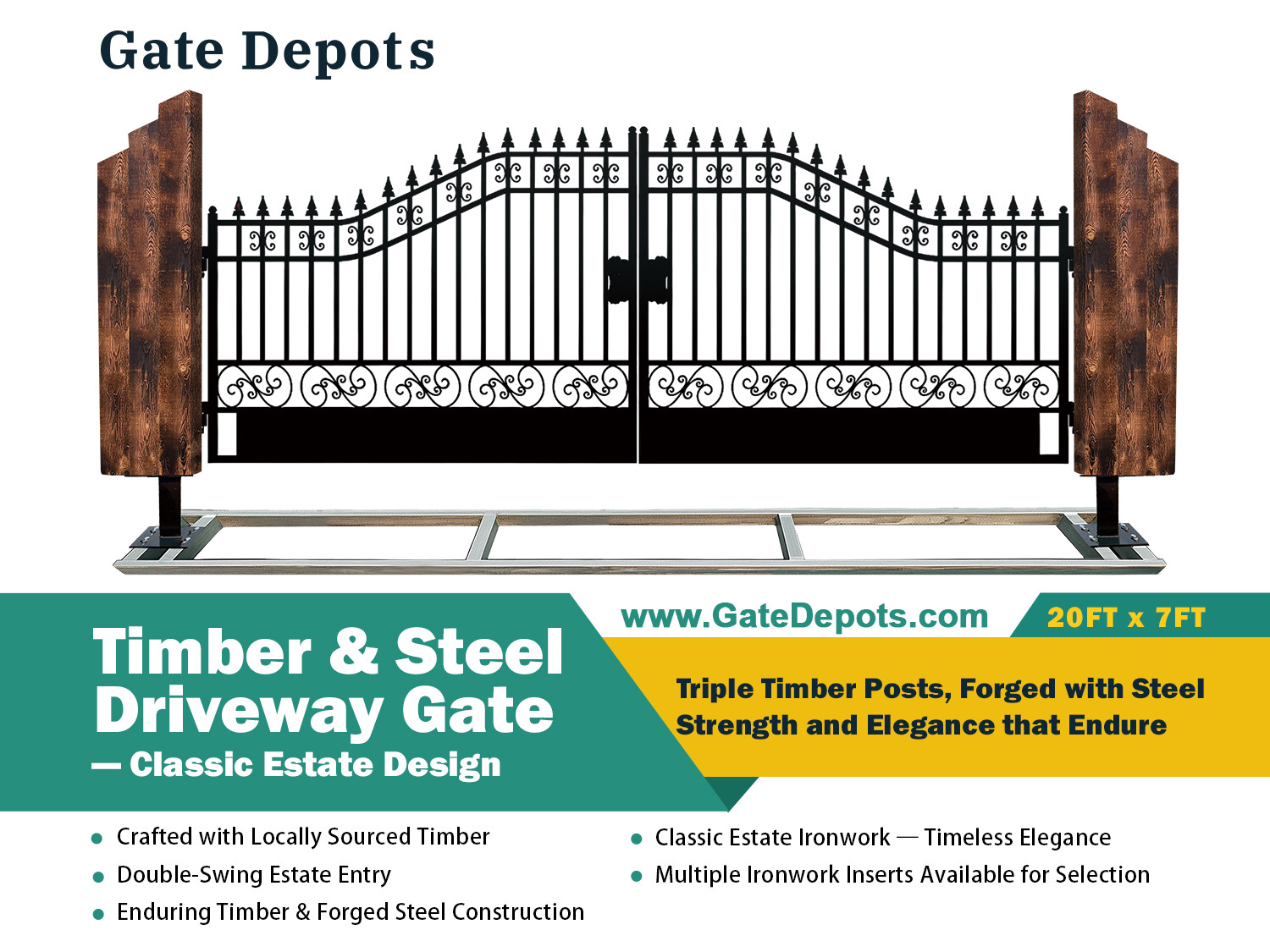 Premium BC Douglas Fir triple burned finish timber posts, forged steel construction, classic estate design, 17 ft 6 inches gate opening, 21 ft x 7 ft total length