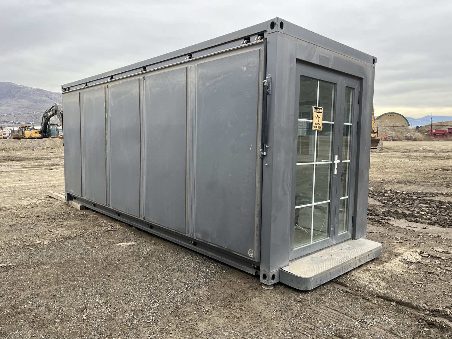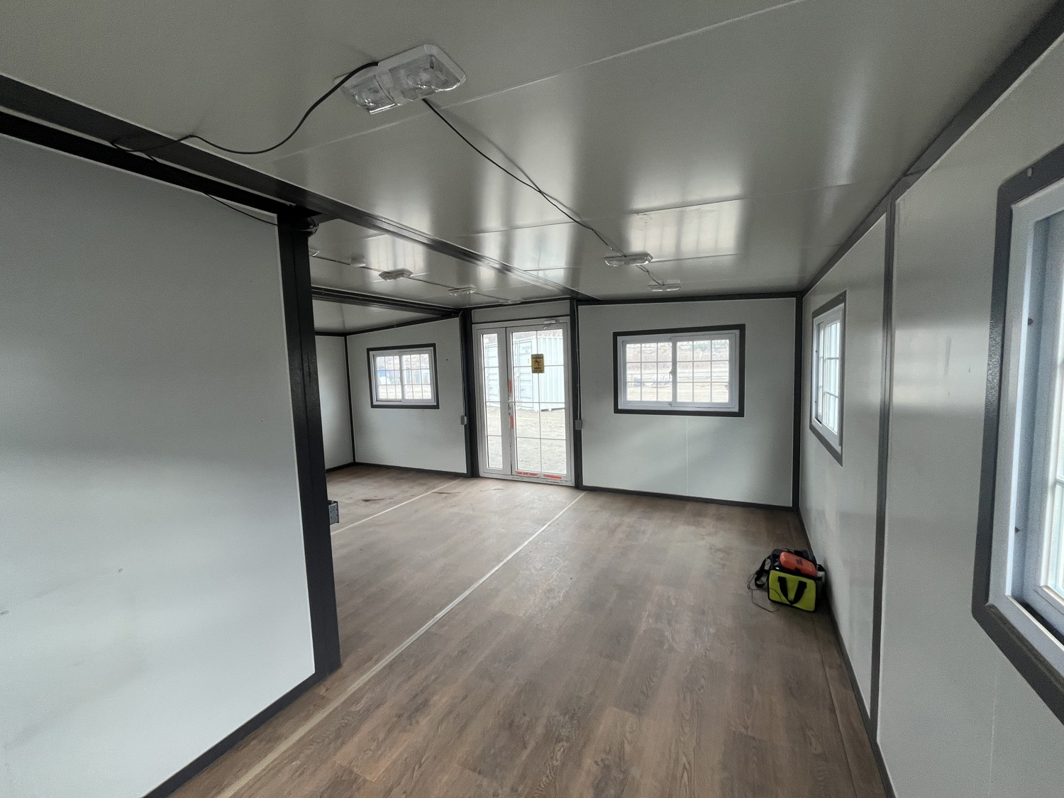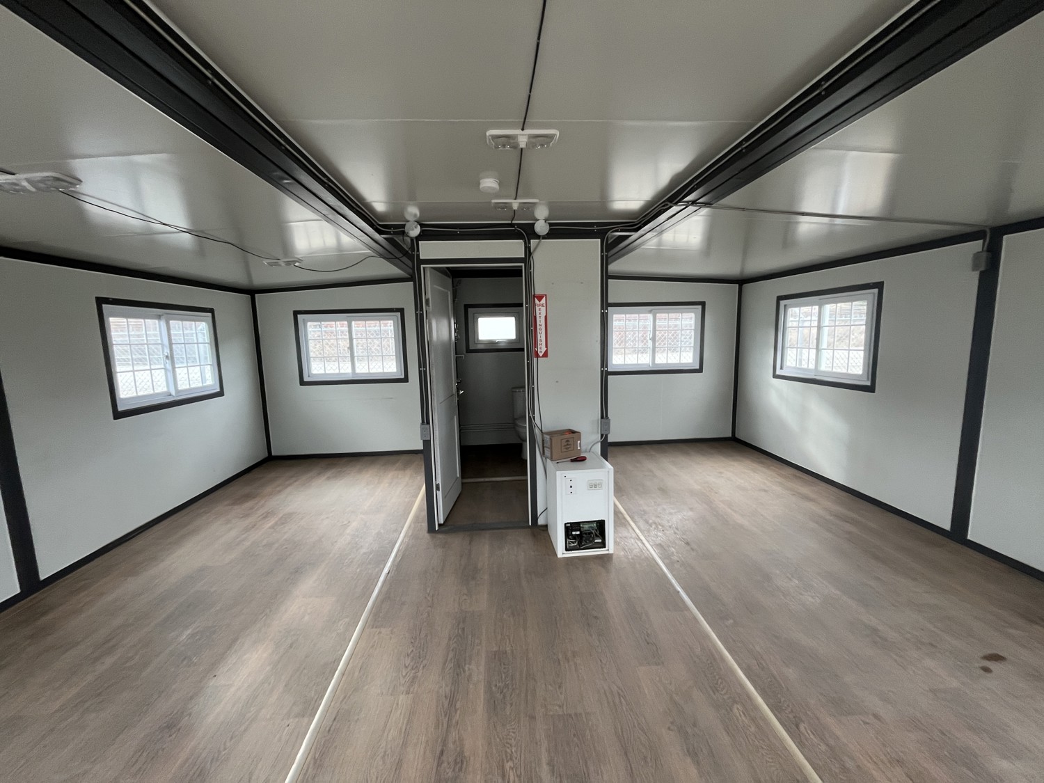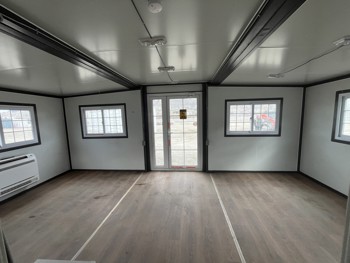 20 ft x 19 ft indoor area 349.7 sq ft, indoor height 7.45 ft, 7395 lb shipping weight, 18,000 BTU, 3 phase AC/heat unit included, bathroom/plumbing unused* additional wiring and LED lights included