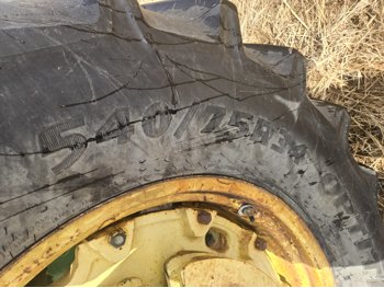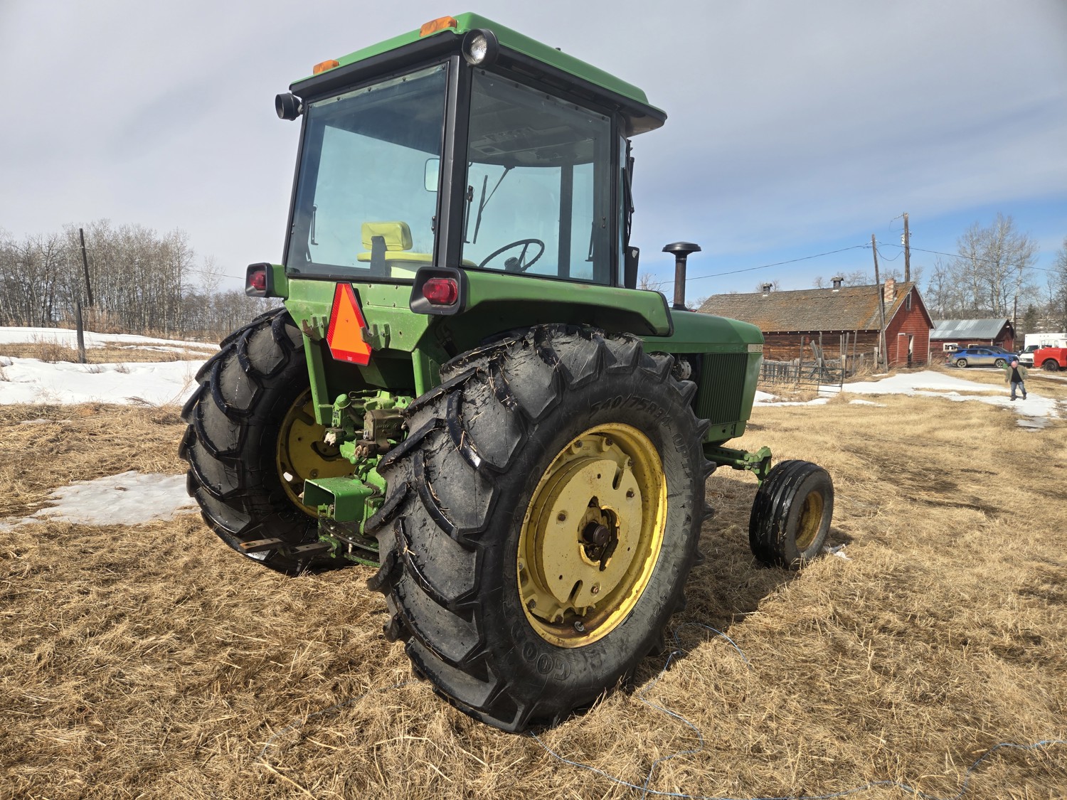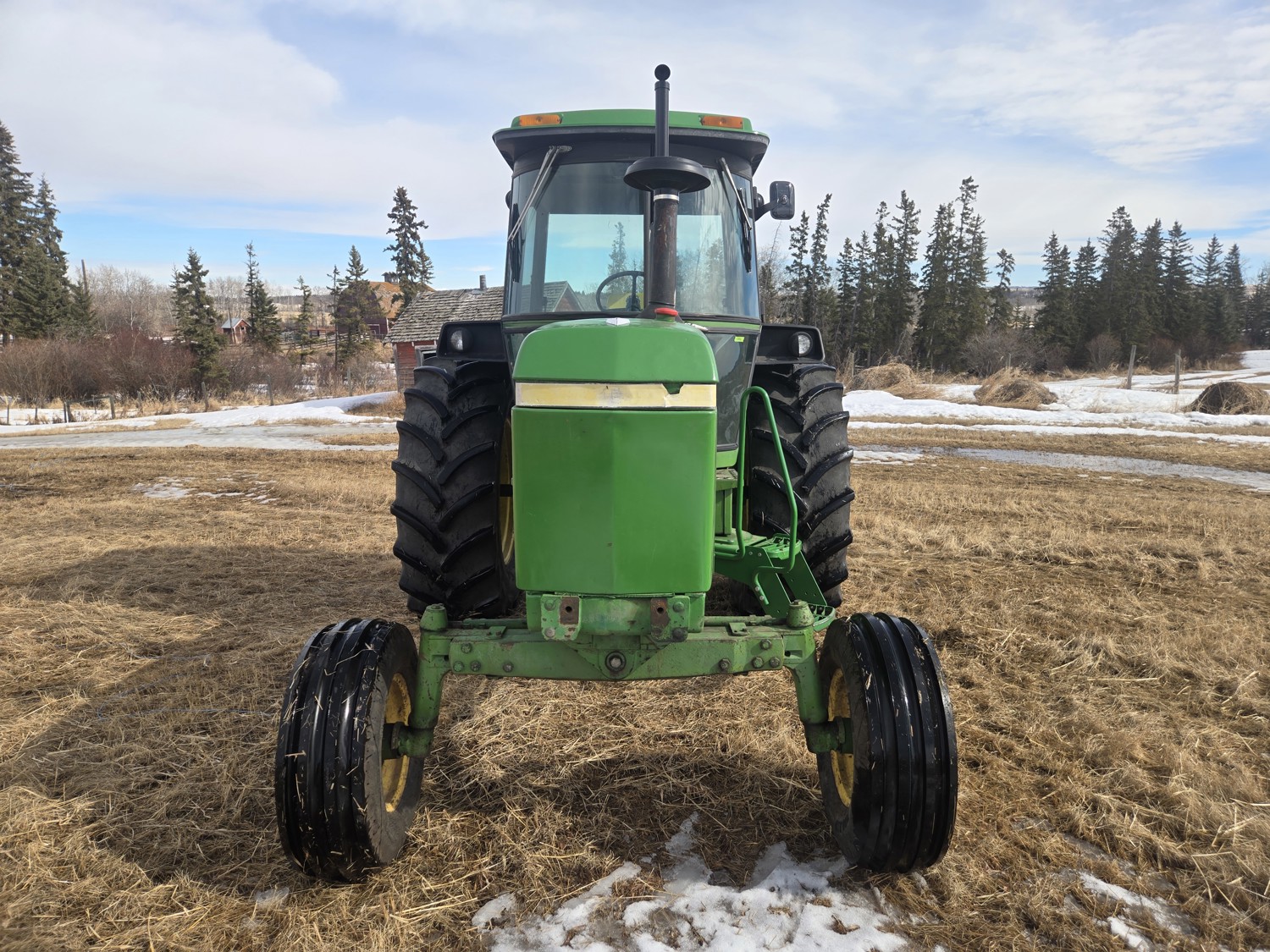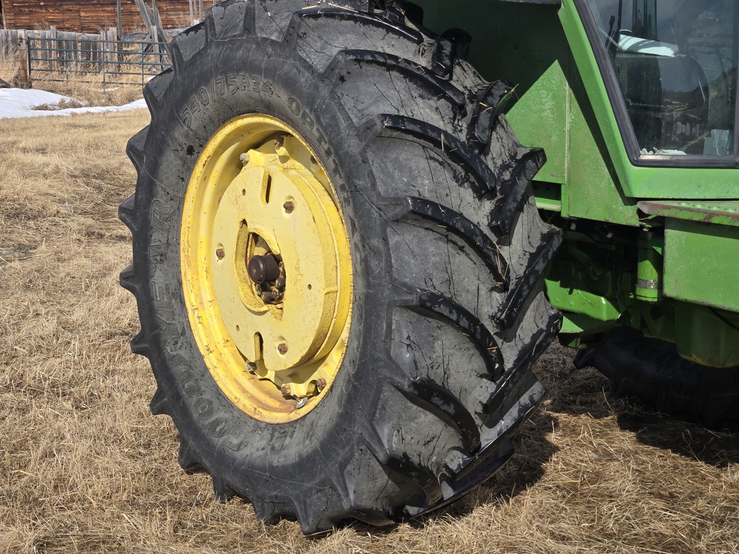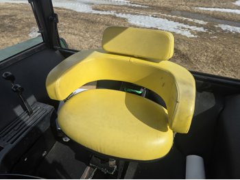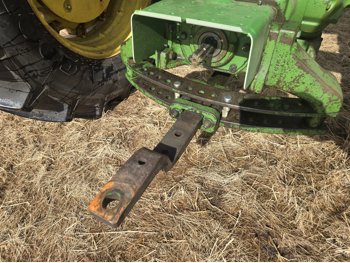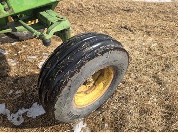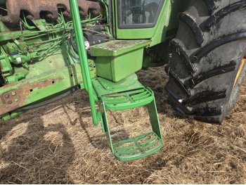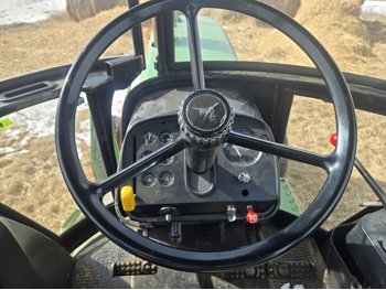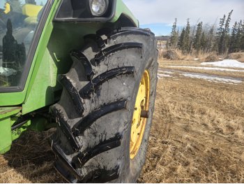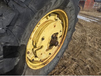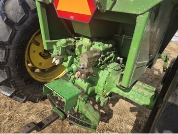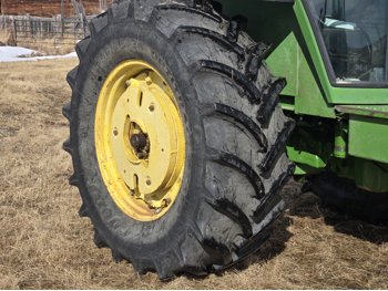 John Deere 5.4 L 6 cylinder diesel engine, 80 PTO HP, 8 speed manual transmission, cab, rear differential lock, radio, 540/1000 PTO, 2 rear hydraulic outlets, rear wheel weights, 11L-15 front tires, 540/75R34 rear tires