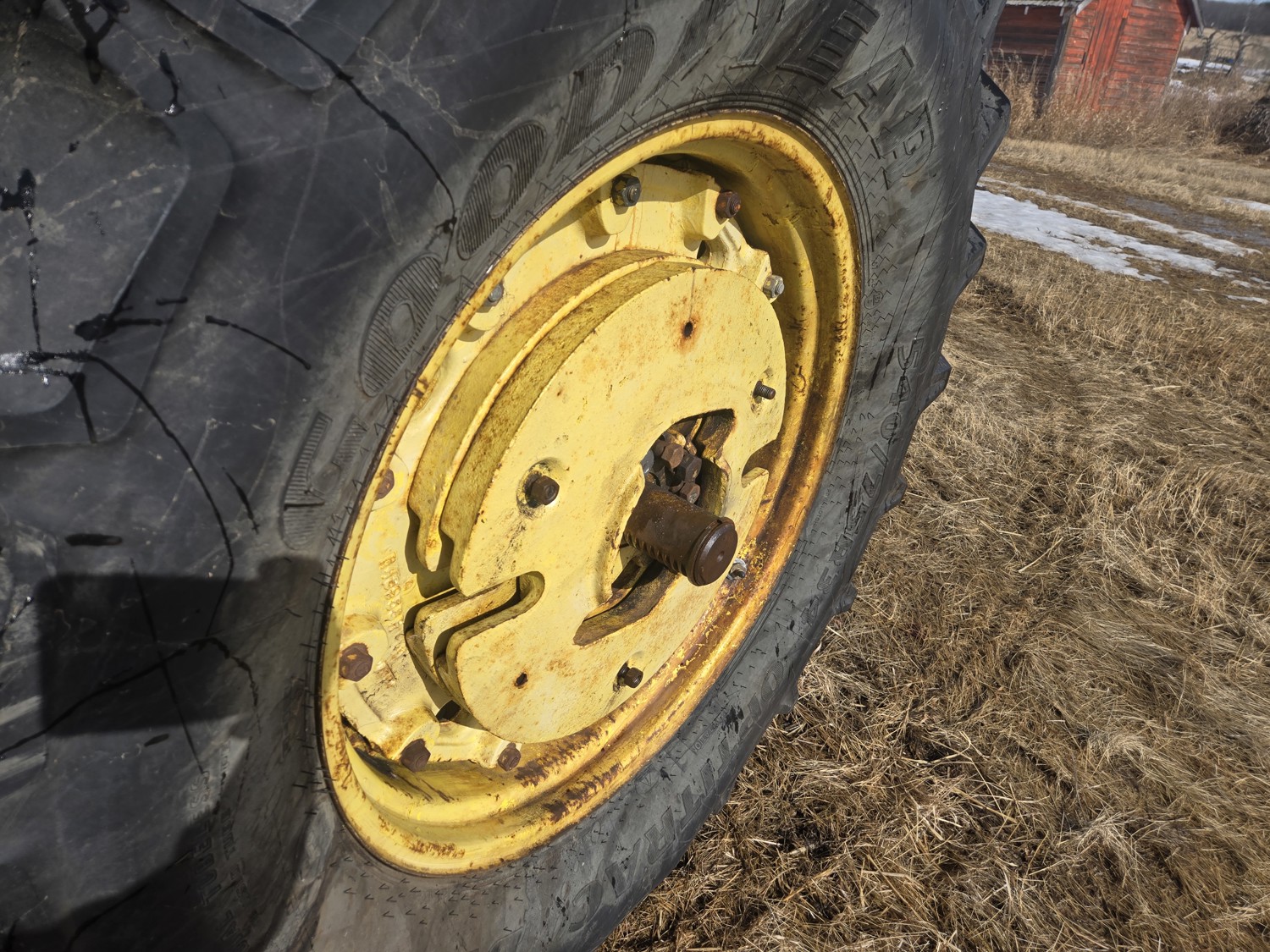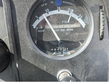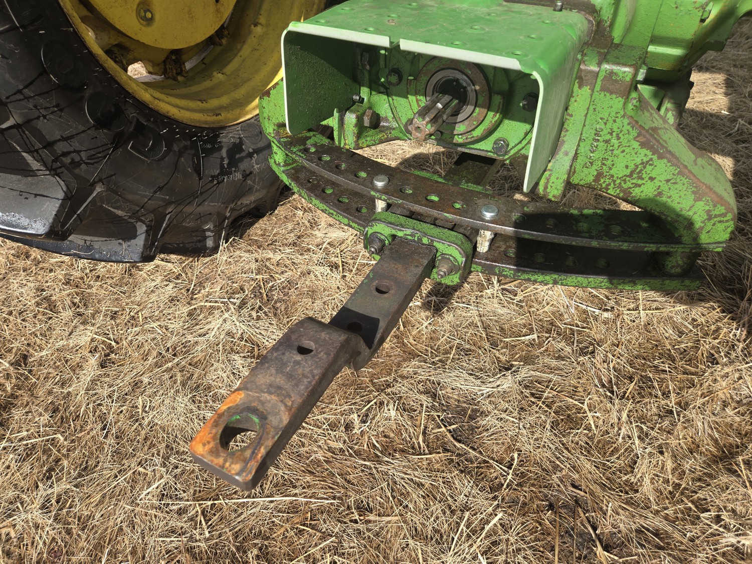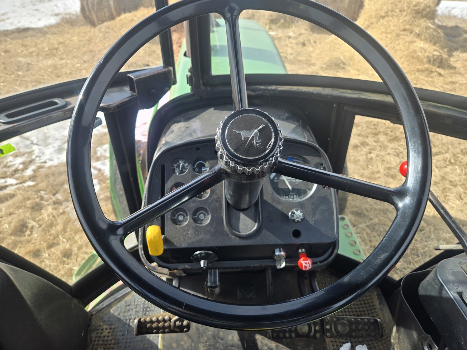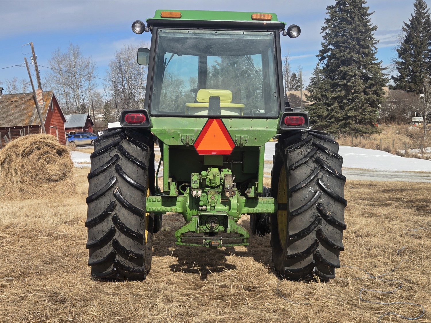 John Deere 5.4 L 6 cylinder diesel engine, 80 PTO HP, 8 speed manual transmission, cab, rear differential lock, radio, 540/1000 PTO, 2 rear hydraulic outlets, rear wheel weights, 11L-15 front tires, 540/75R34 rear tires